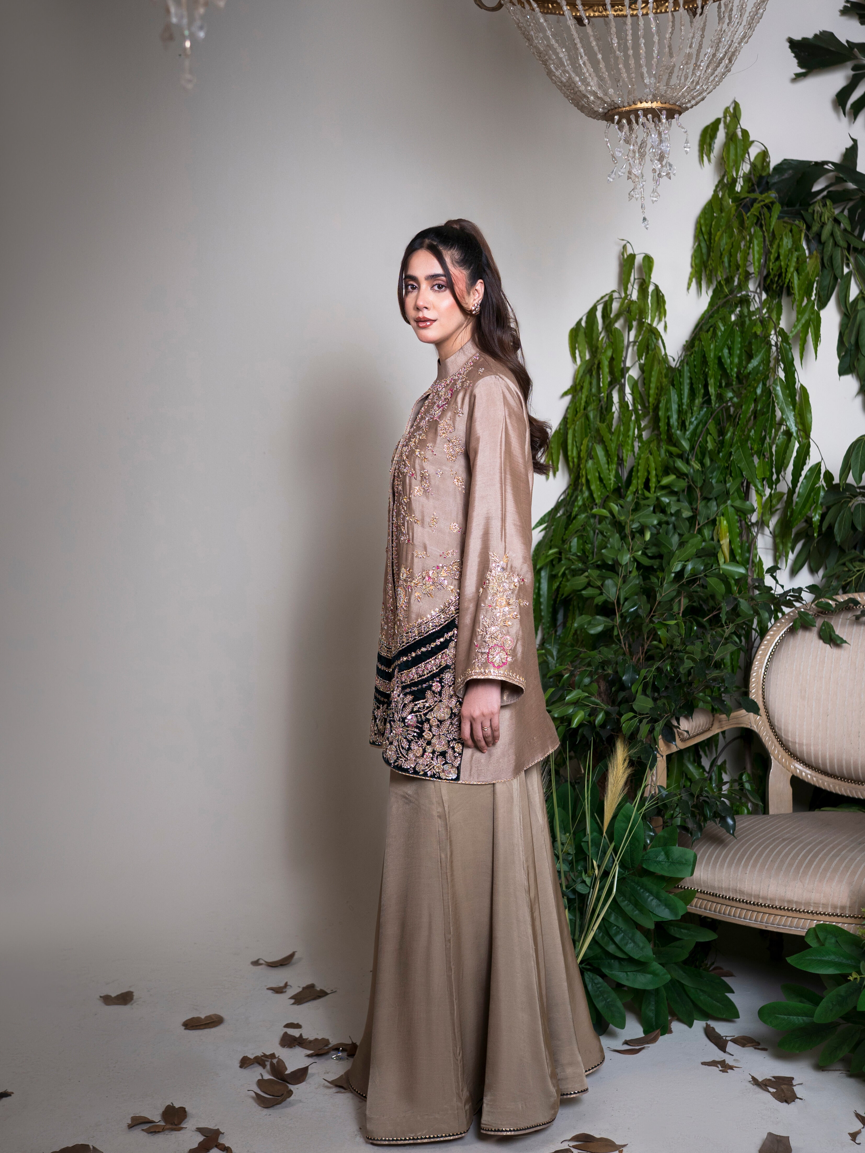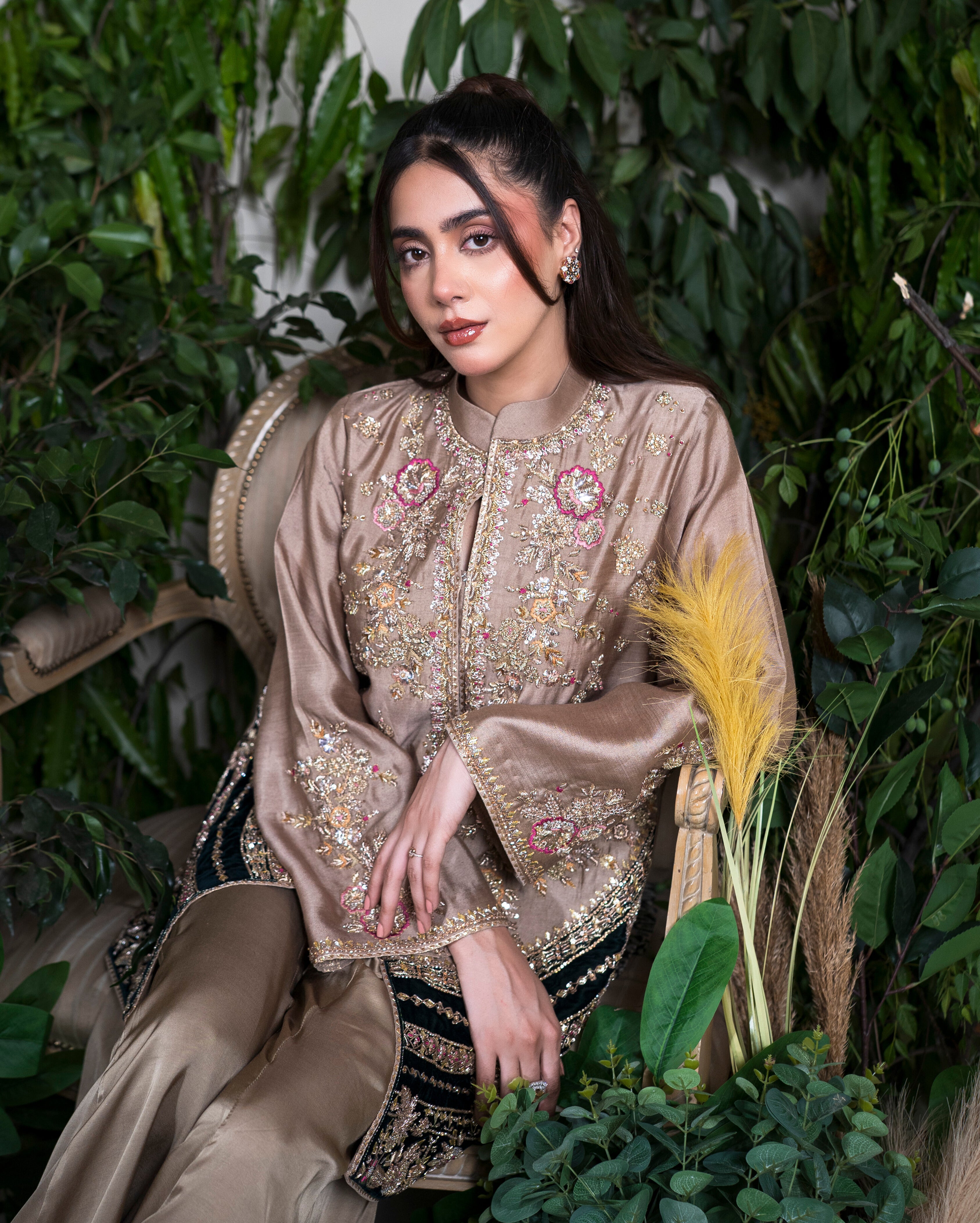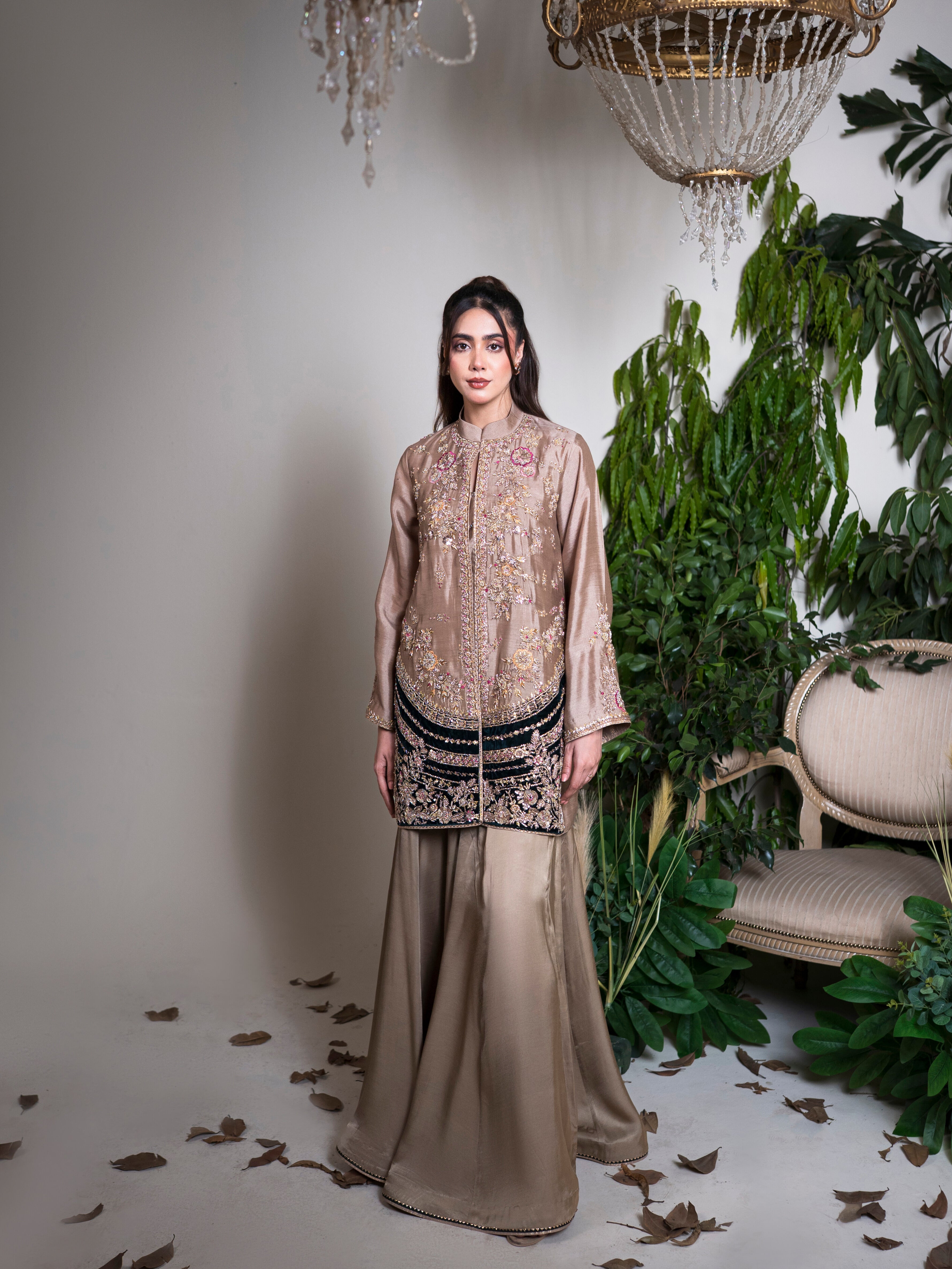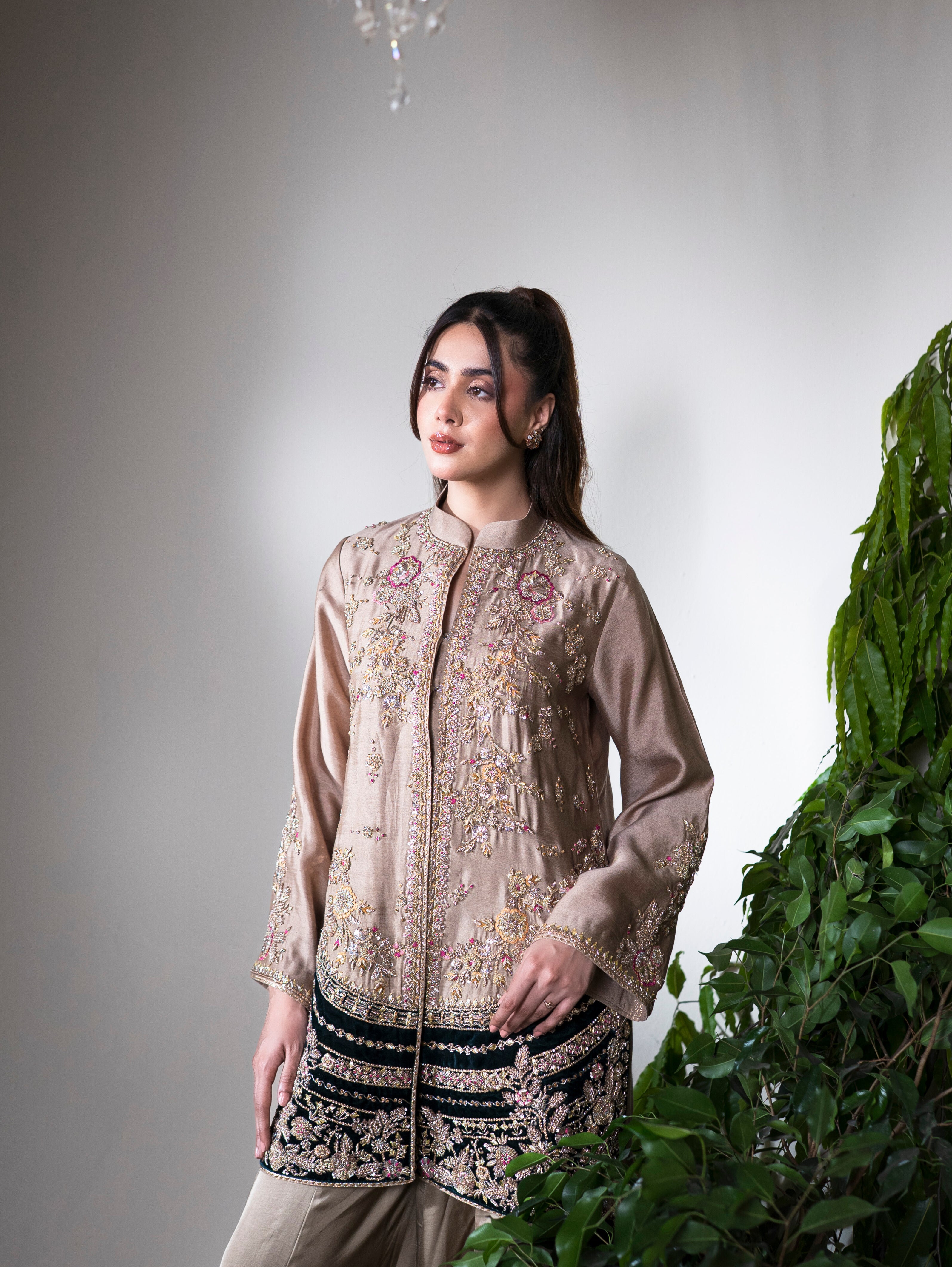 An A-line jacket in beige-gold sheesha silk, featuring intricate handwork with dabka, resham,
