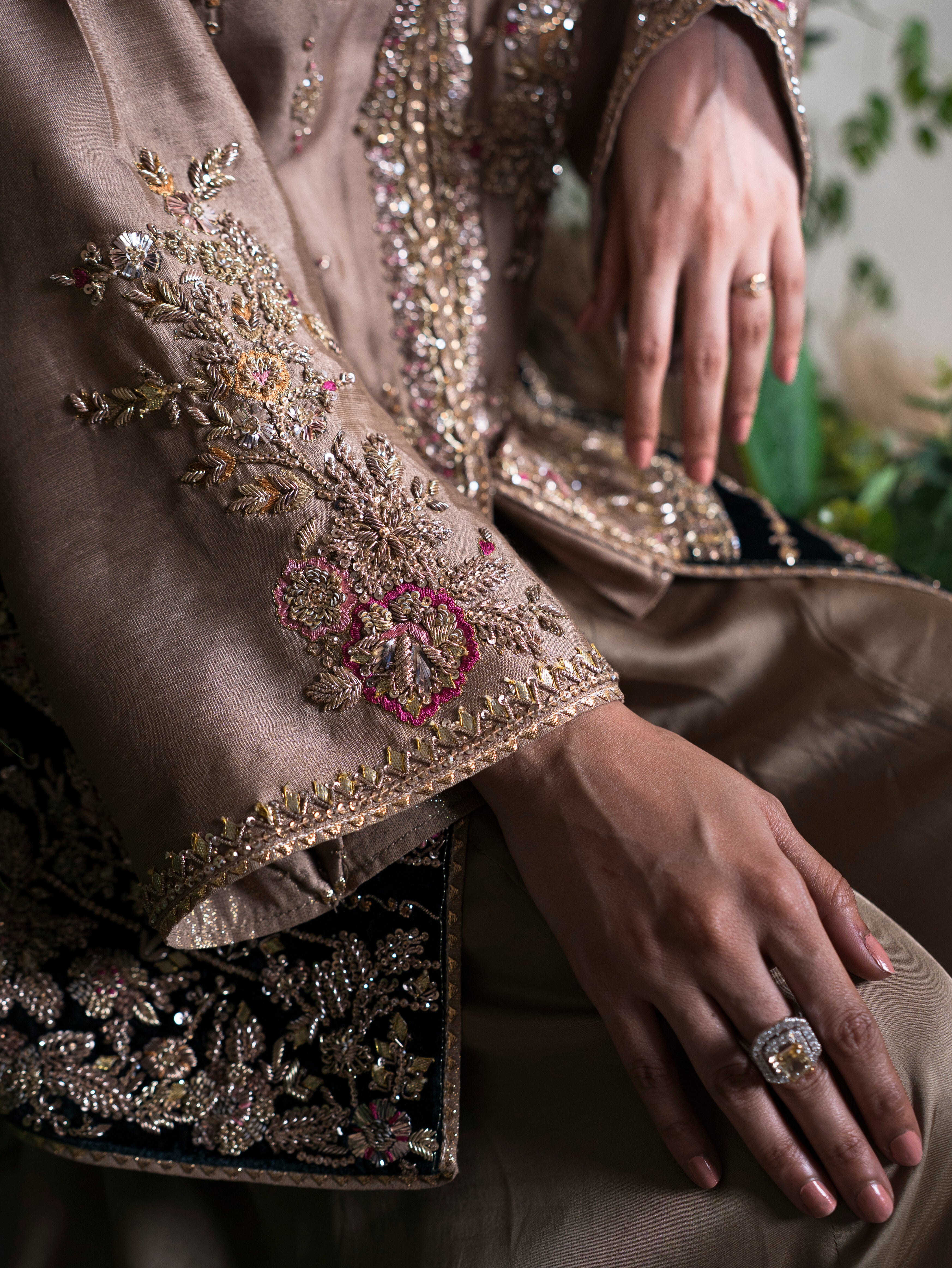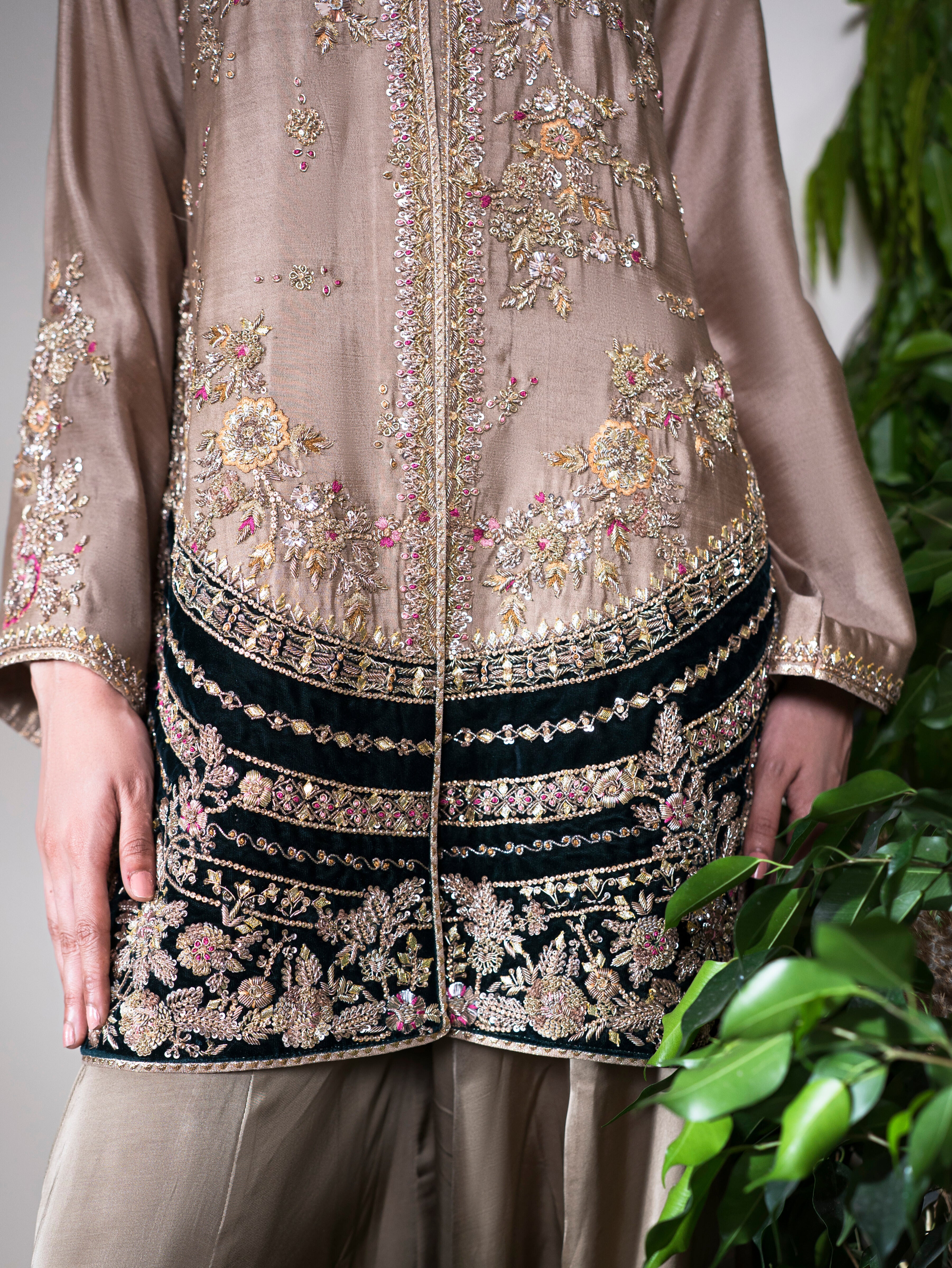 and sitara knots. A contrasting green velvet border accents the hem, enhanced with geometric patterns crafted in dabka embroidery. Paired with flowing shamose sharara pants and a pure organza dupatta, the ensemble blends rich texture with timeless elegance.