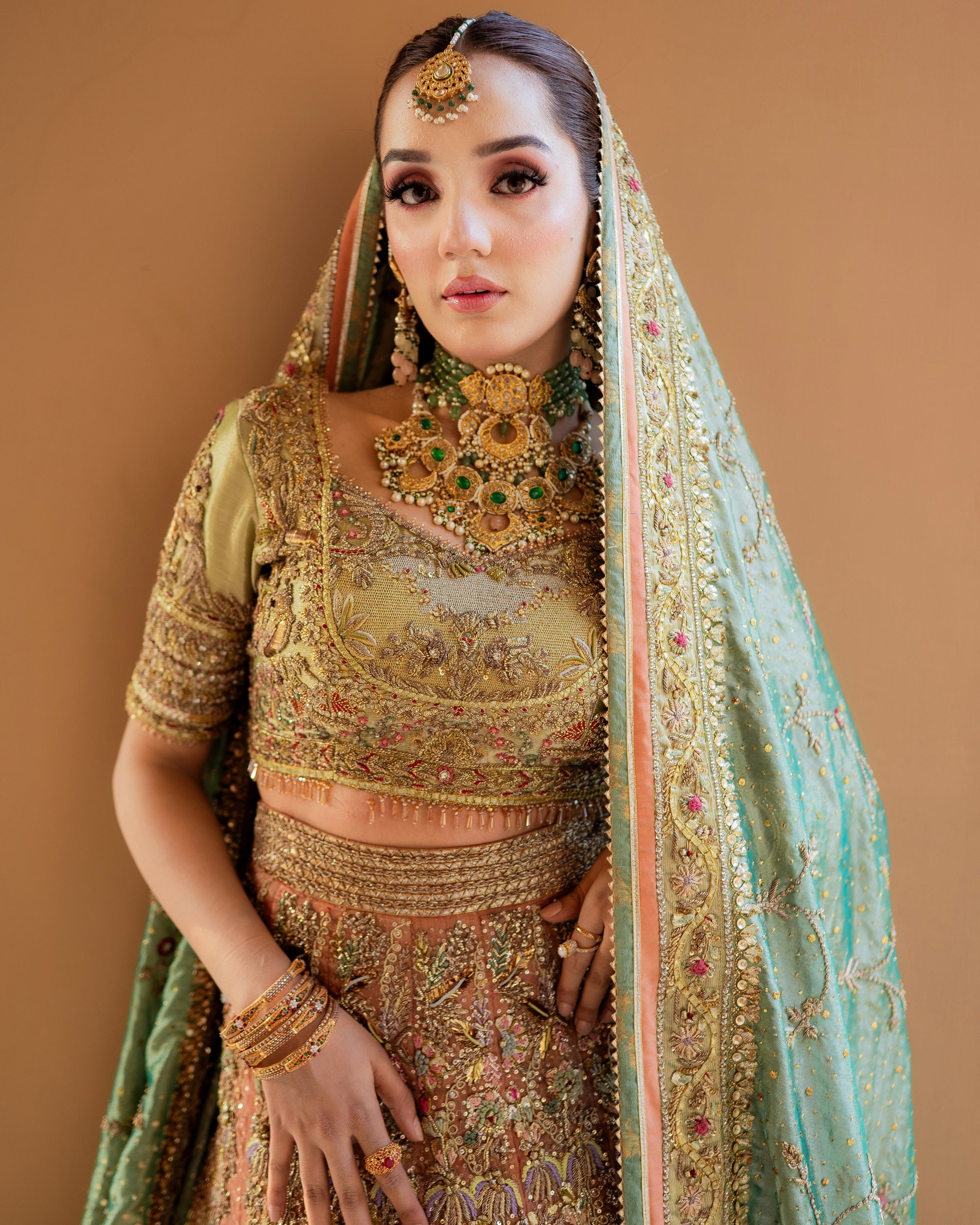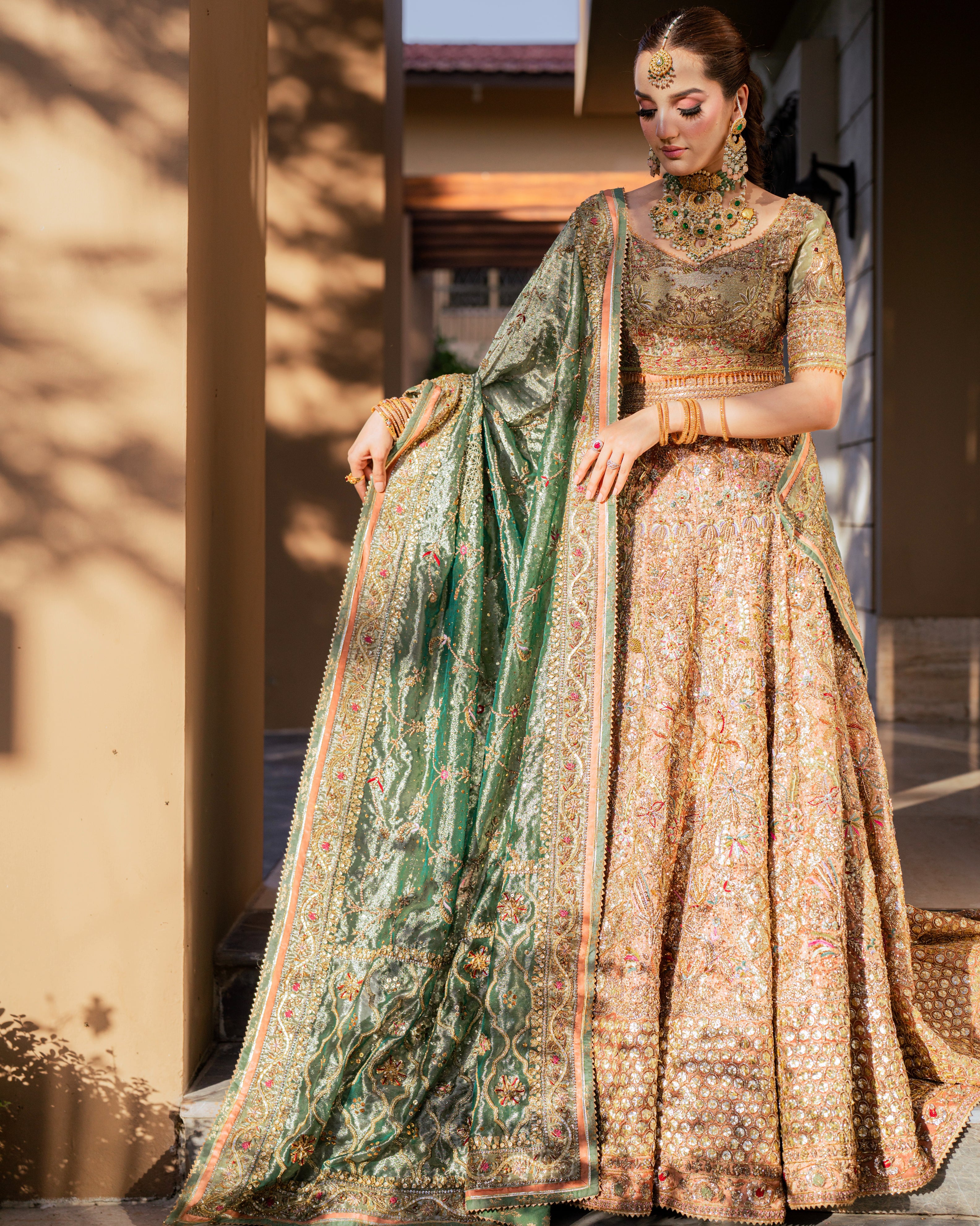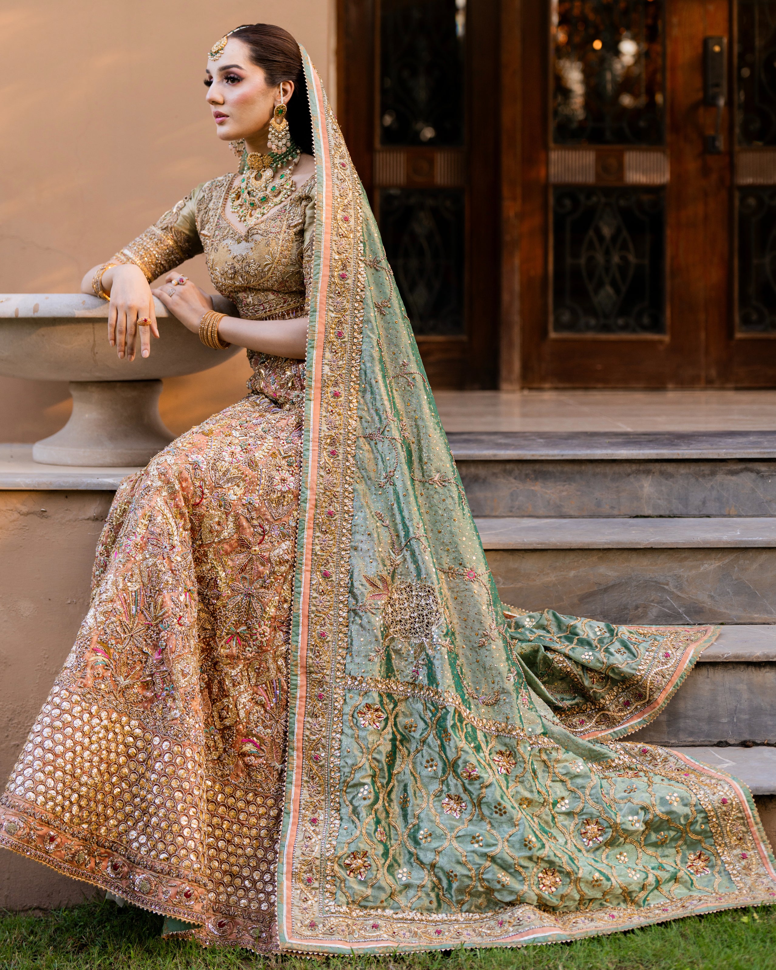 This lehnga choli ensemble serves as a perfect mehndi outfit featuring different hues like mint green and rust in fabrication. It is further enhanced with the work of gota, resham, and fine dabki. The design is a mix of geometric and floral patterns. It is paired with a beautiful tissue mint green dupatta, handworked in geometric patterns in gota patti.
