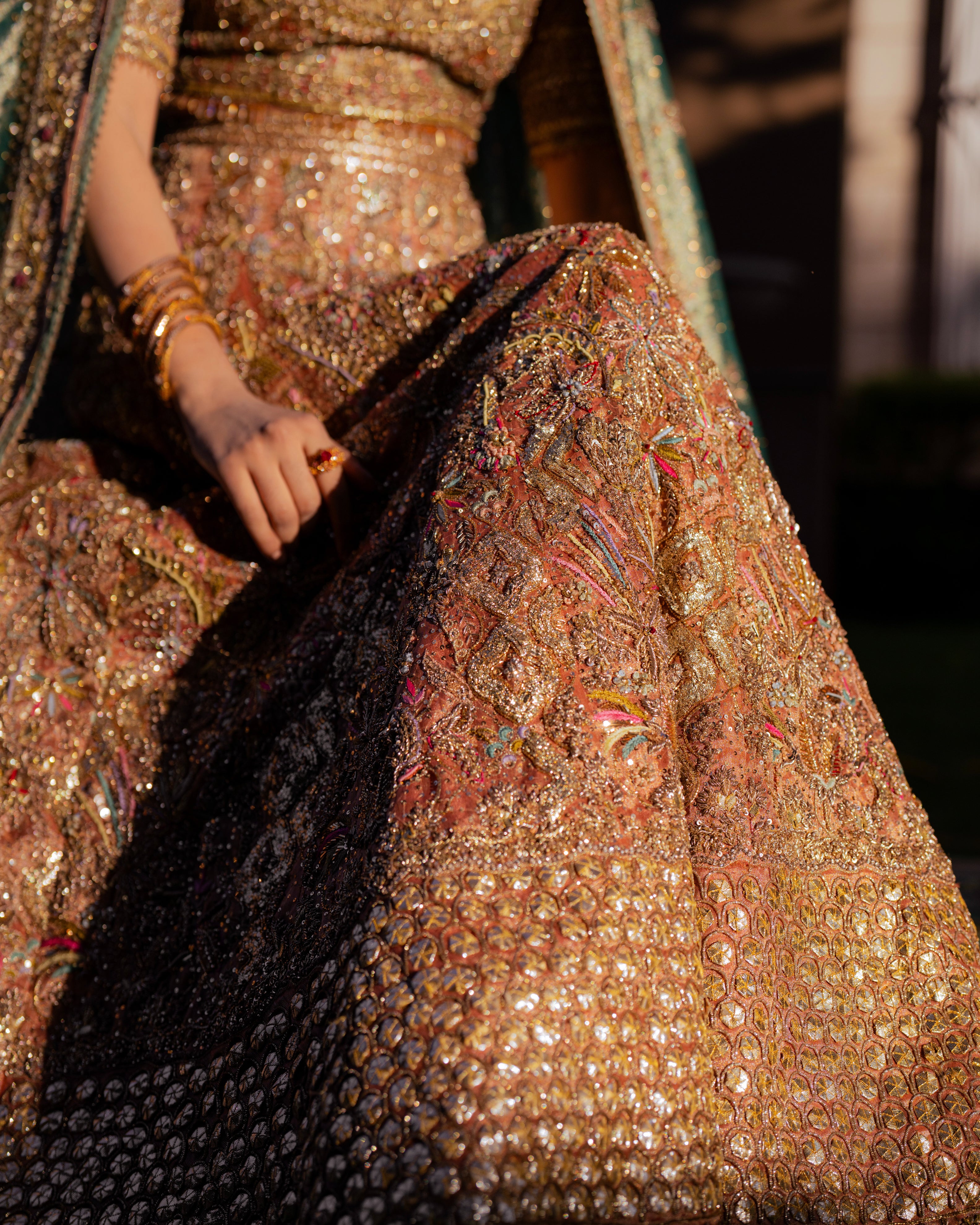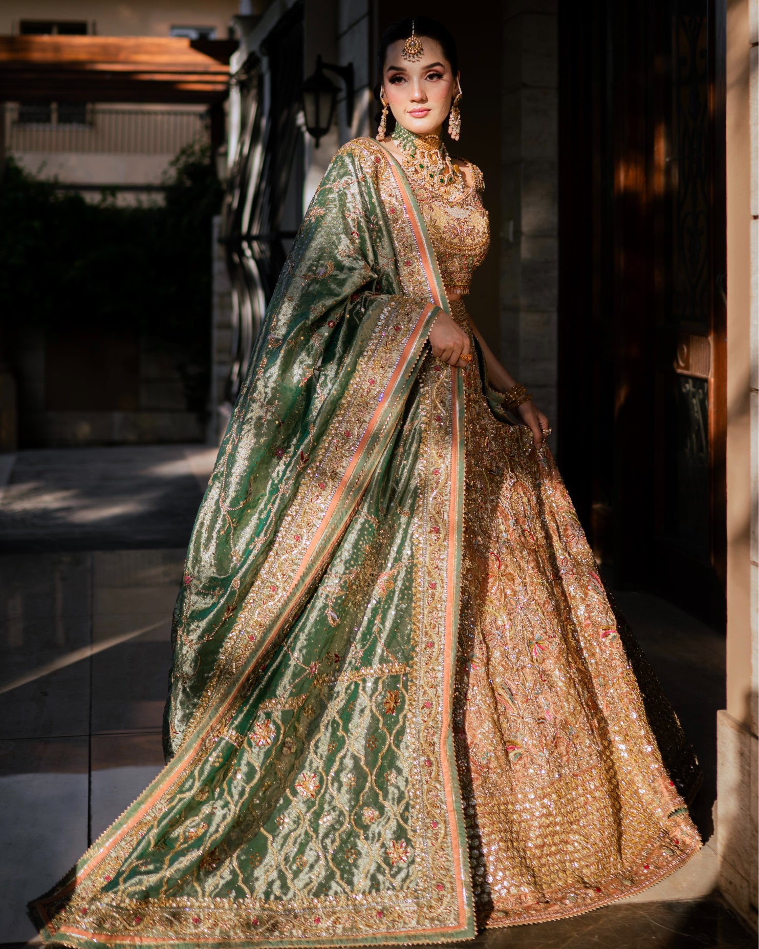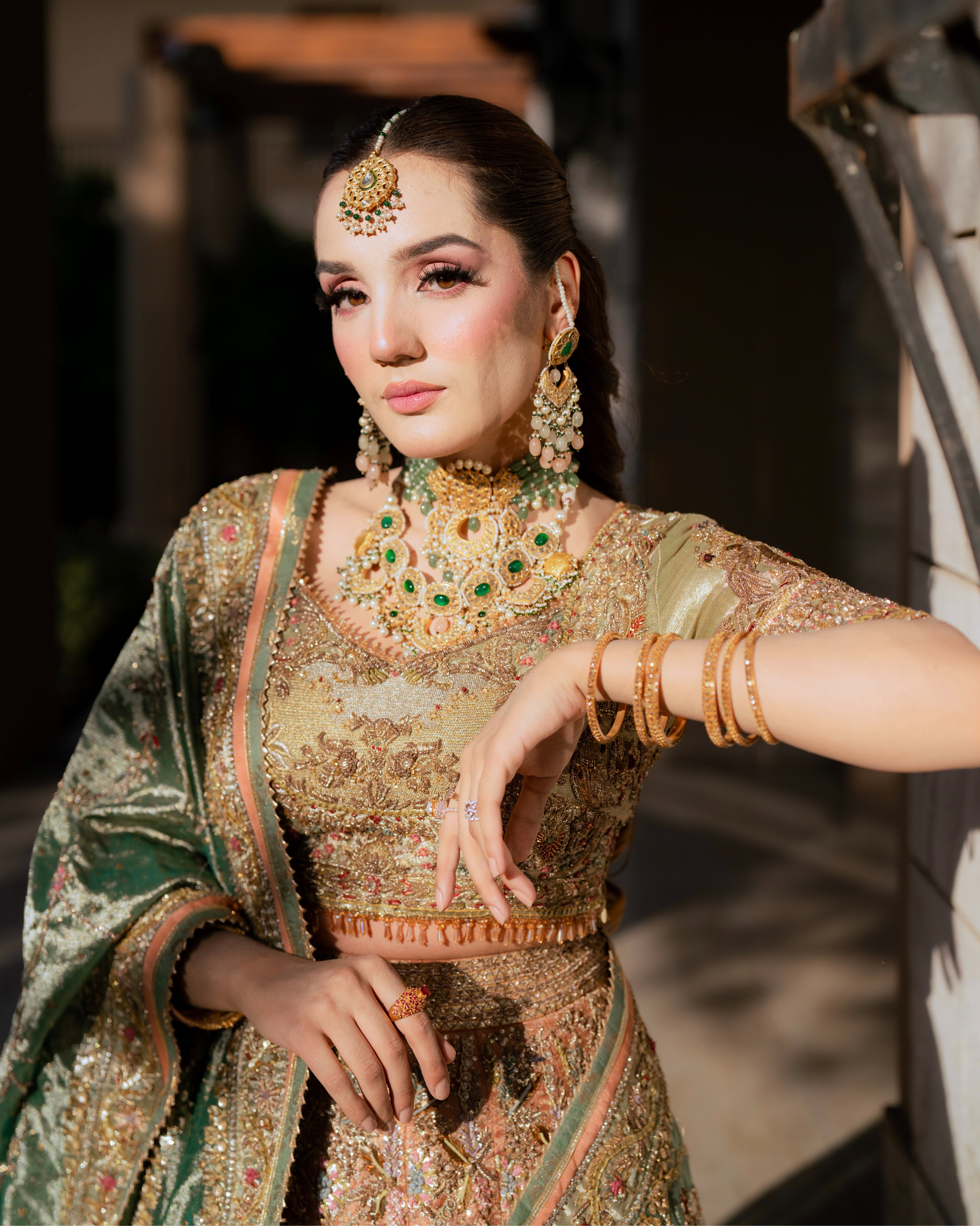 This lehnga choli ensemble serves as a perfect mehndi outfit featuring different hues like mint green and rust in fabrication. It is further enhanced with the work of gota, resham, and fine dabki. The design is a mix of geometric and floral patterns. It is paired with a beautiful tissue mint green dupatta, handworked in geometric patterns in gota patti.