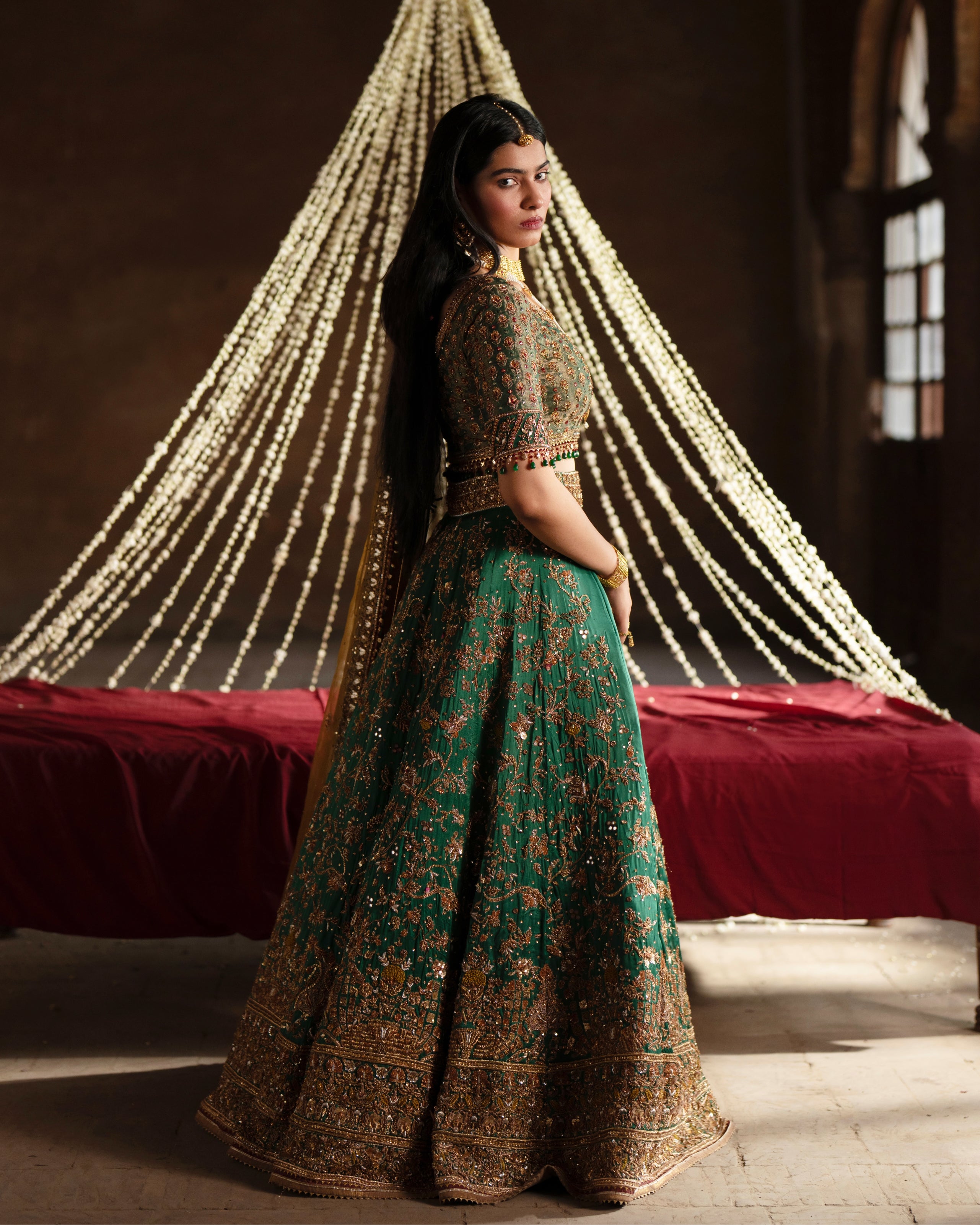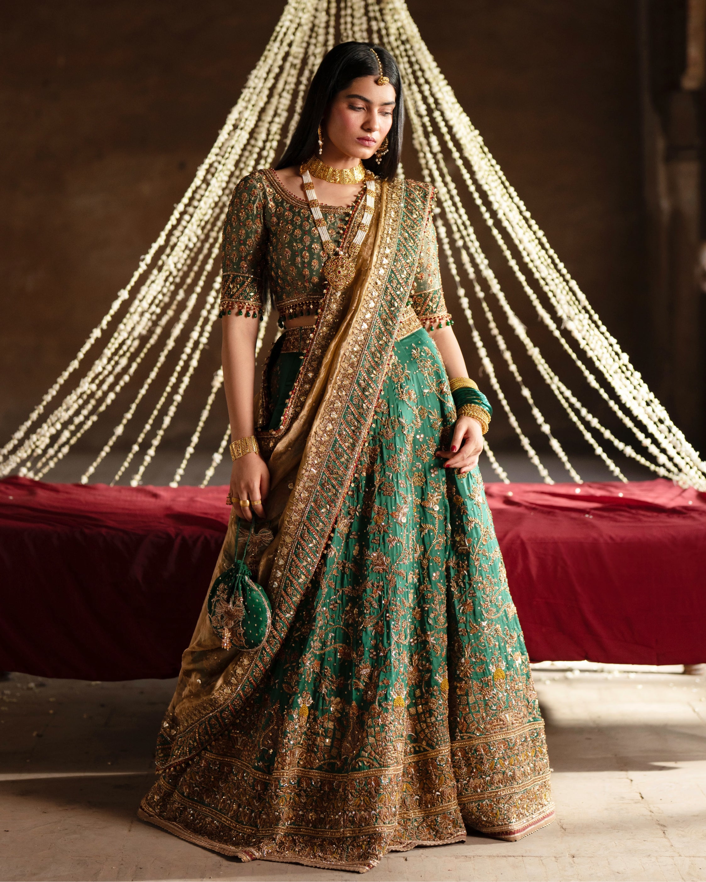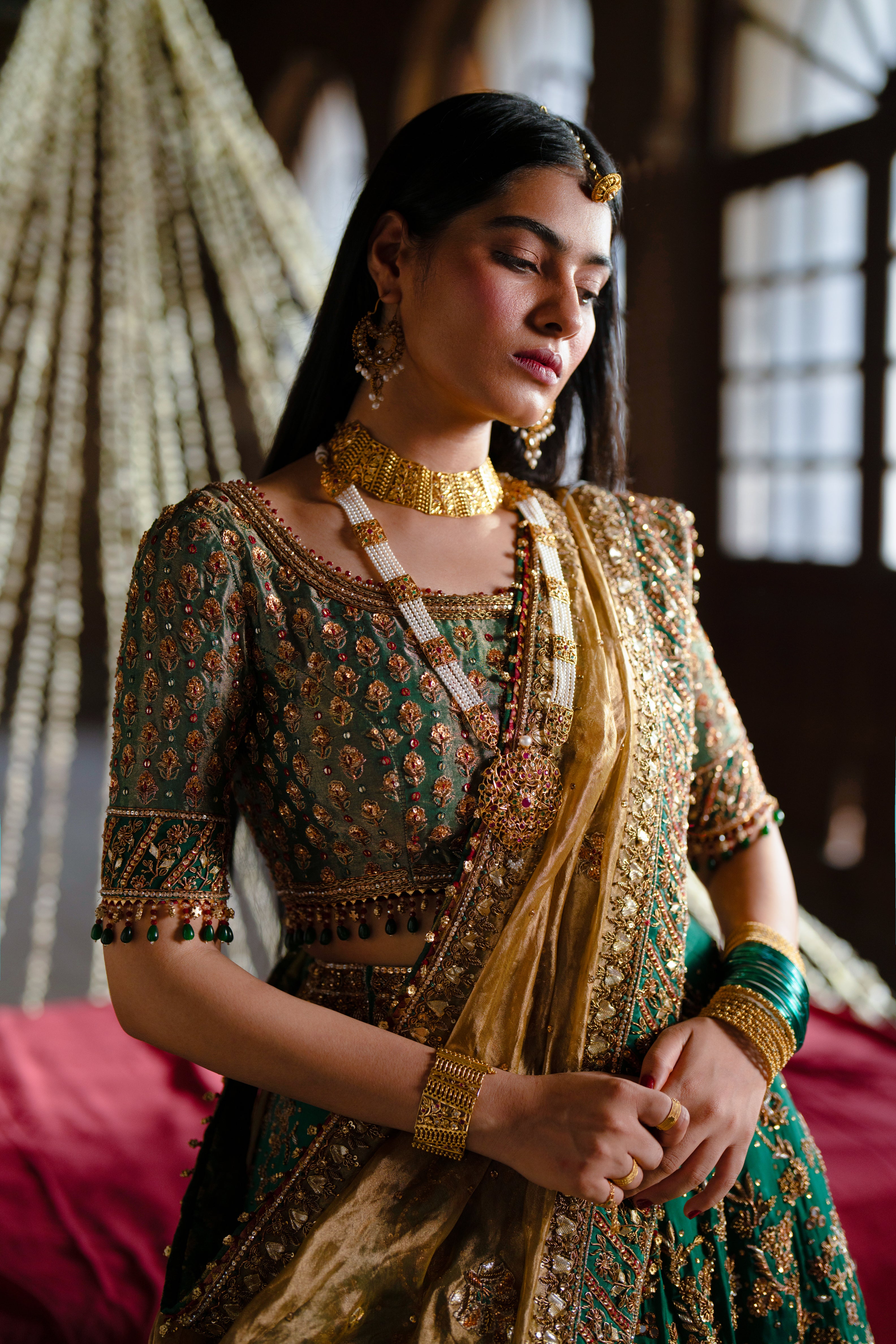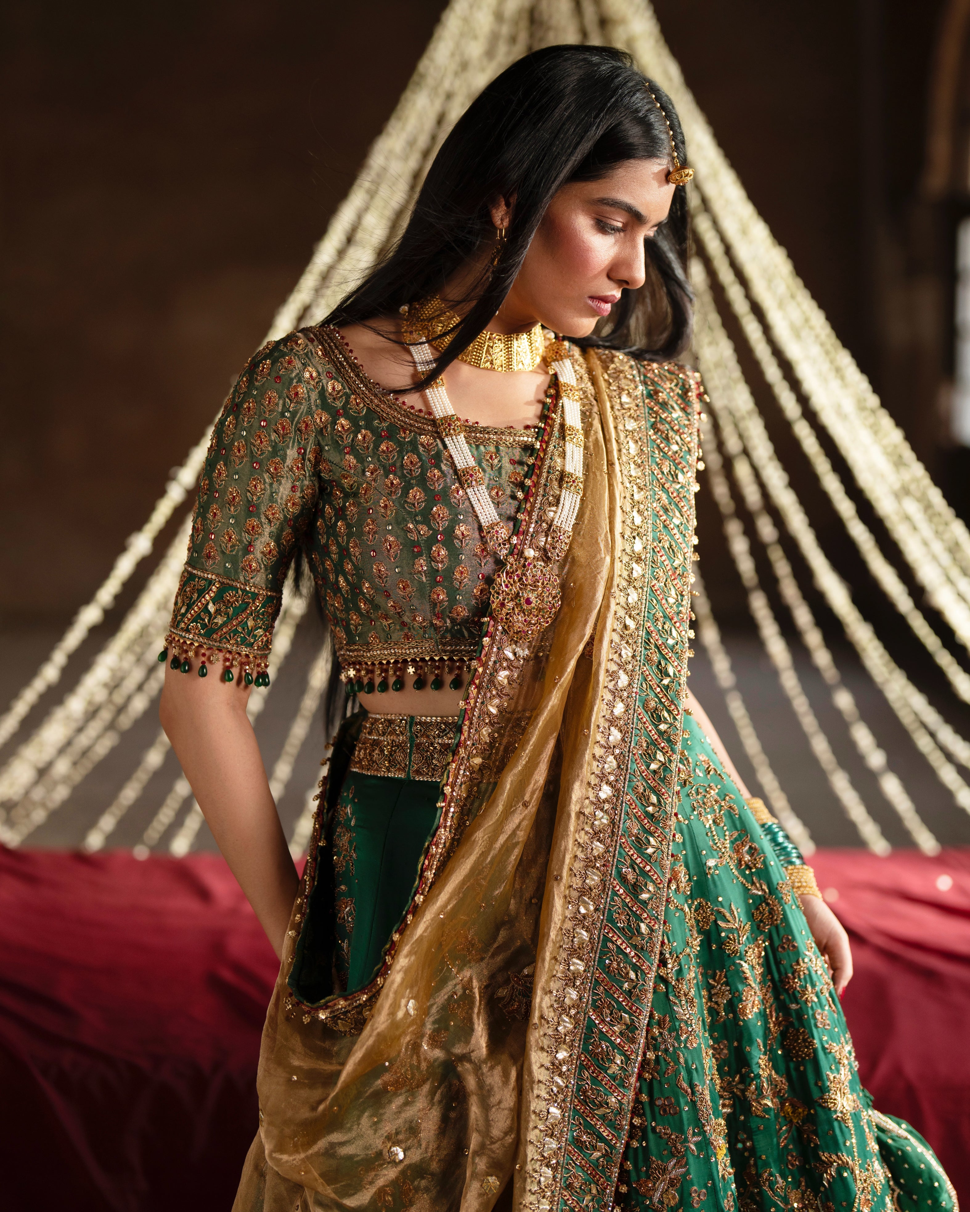 A green shamose lehnga with antique dabki and sitara work, paired with a zari net choli adorned in resham boti. Styled with a gold zari tissue dupatta finished with gota detailing - Tradition woven in green and gold.