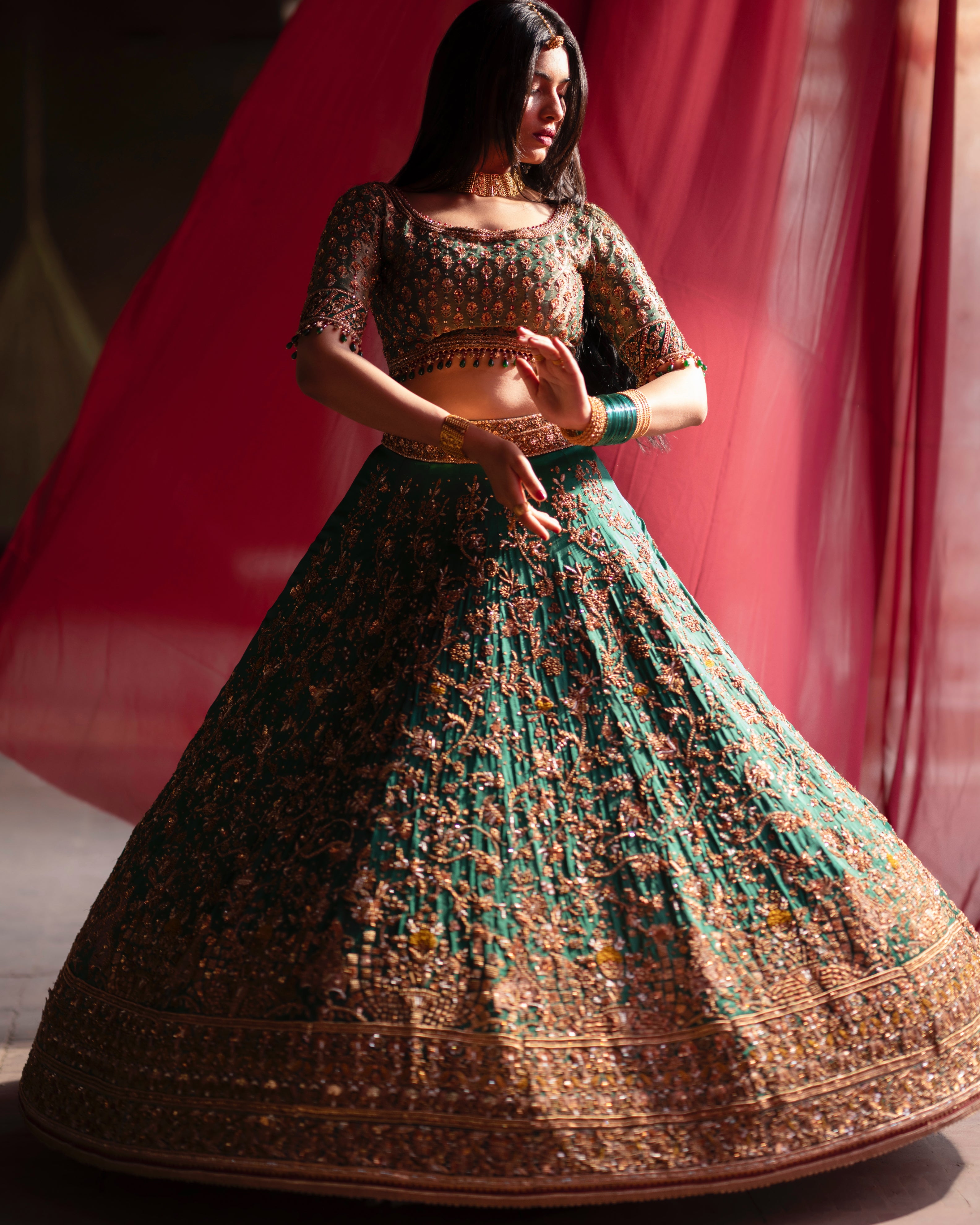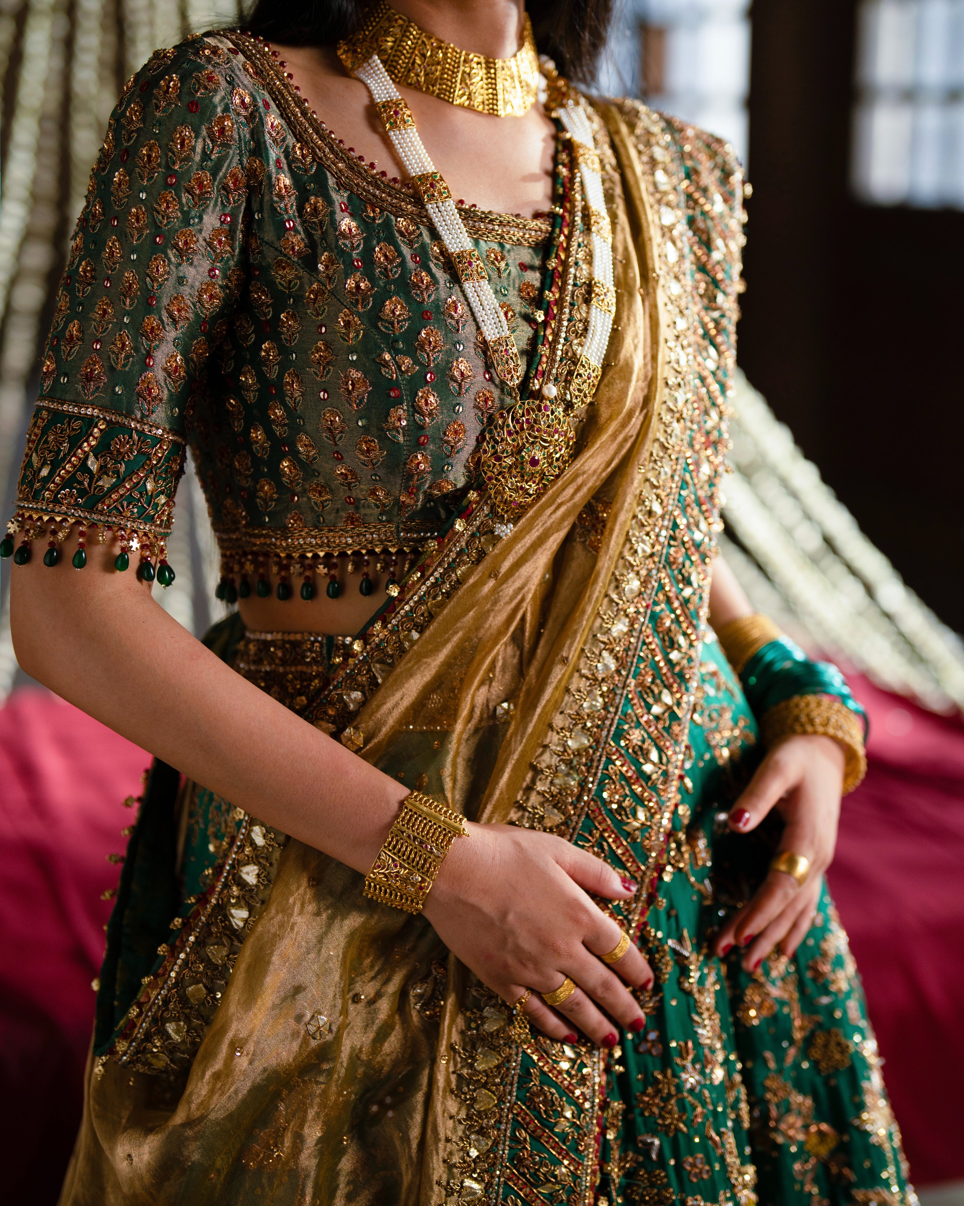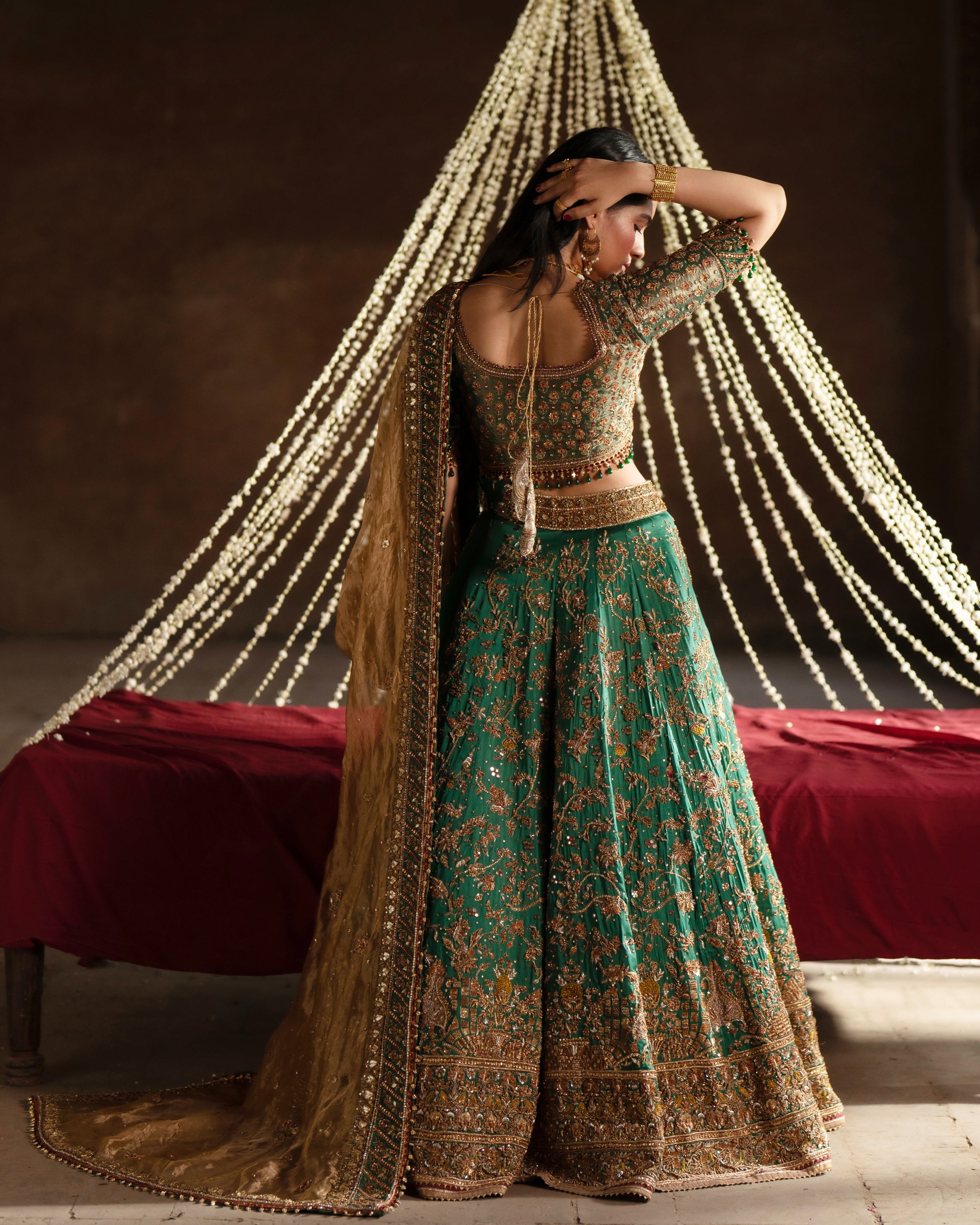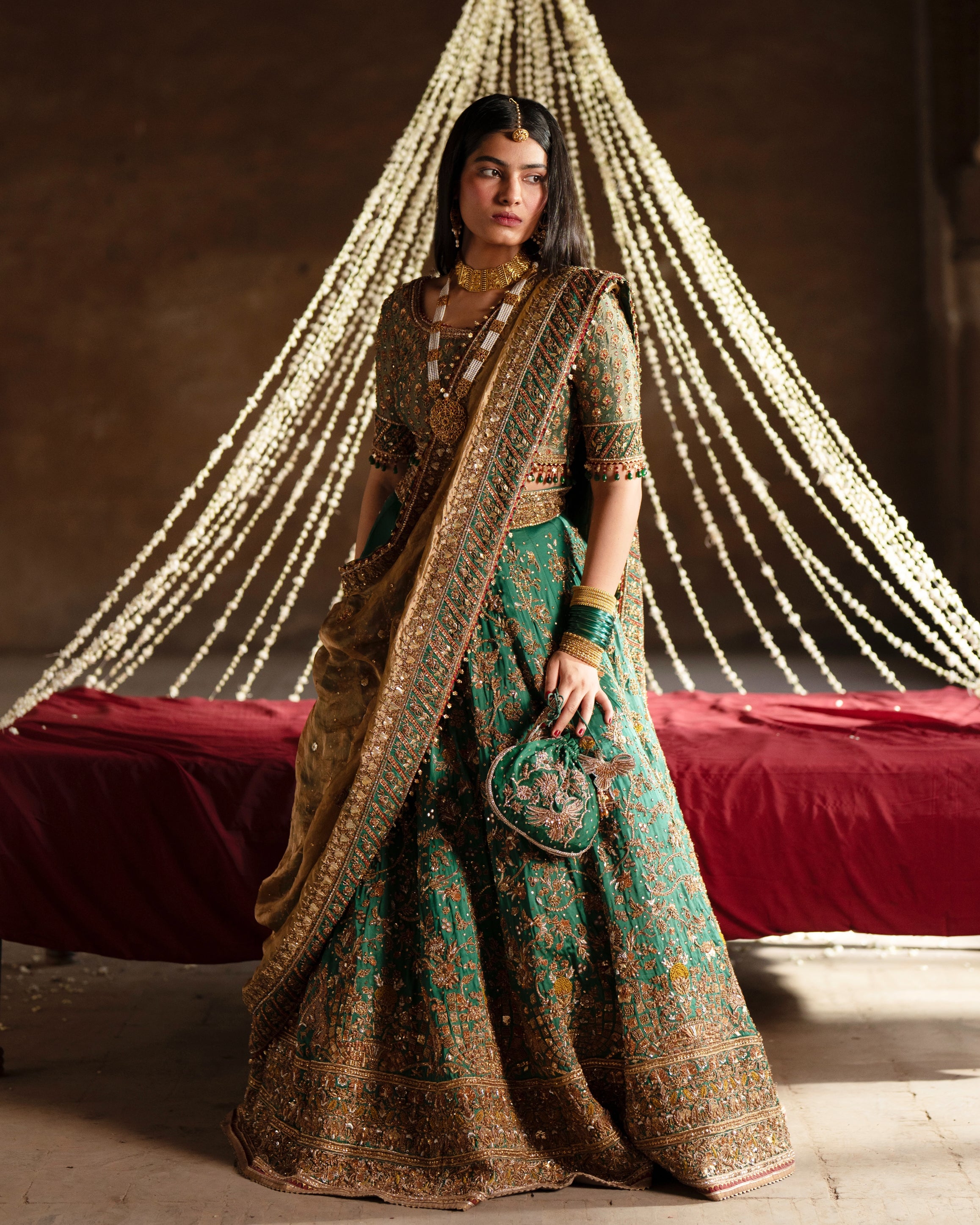 A green shamose lehnga with antique dabki and sitara work, paired with a zari net choli adorned in resham boti. Styled with a gold zari tissue dupatta finished with gota detailing - Tradition woven in green and gold.