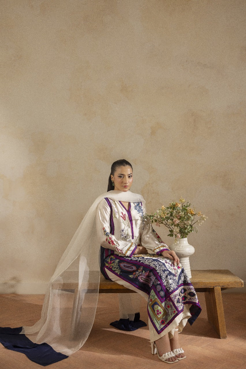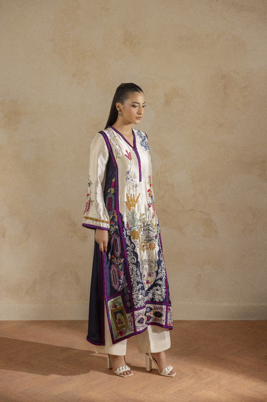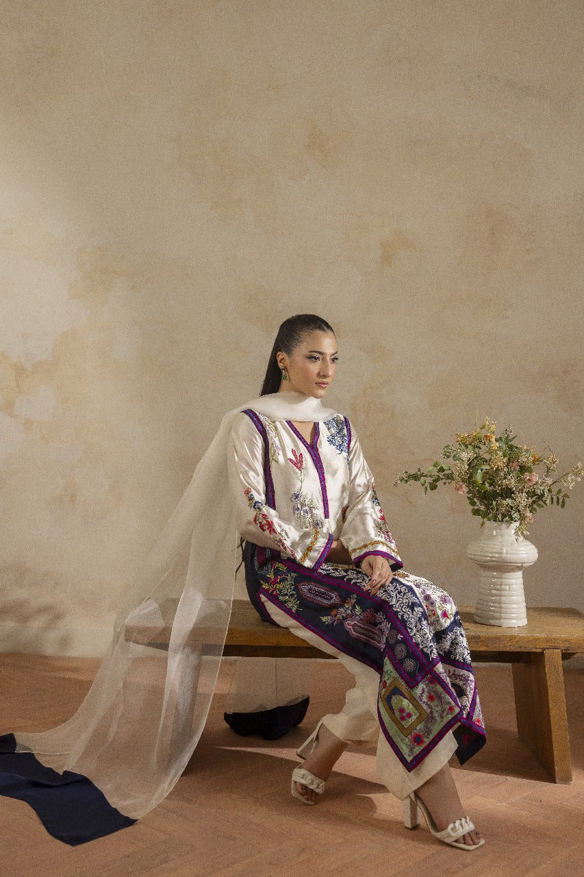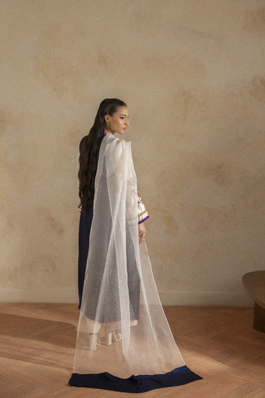 A pure buttersilk long shirt in ivory, featuring a wide hem adorned with navy applique accents and intricate embroidered motifs. Paired with short azaar silk pants and a delicate pure organza dupatta for a refined look.