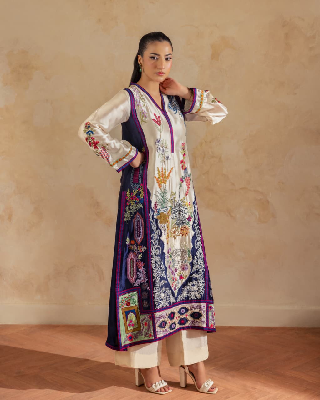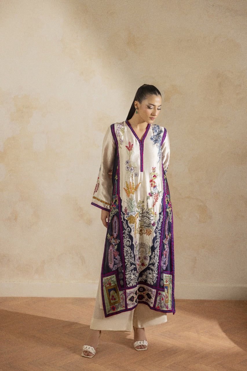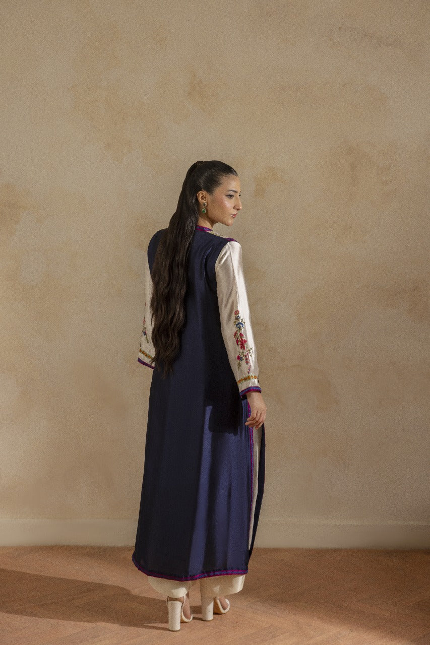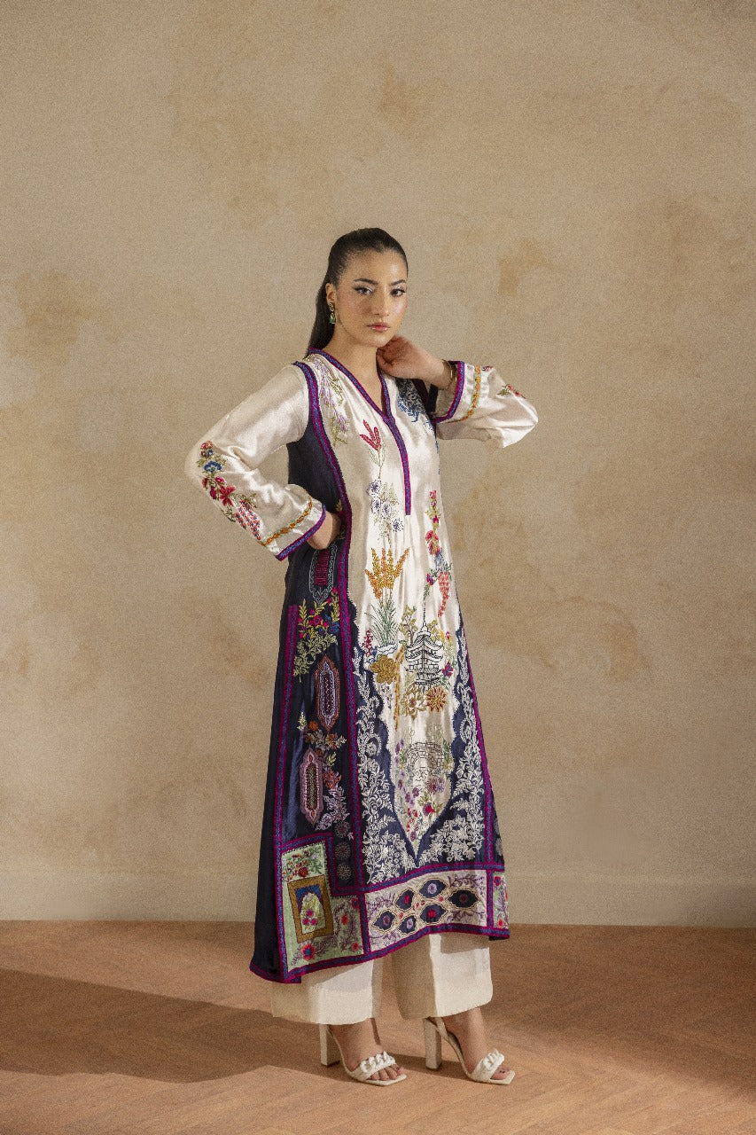 A pure buttersilk long shirt in ivory, featuring a wide hem adorned with navy applique accents and intricate embroidered motifs. Paired with short azaar silk pants and a delicate pure organza dupatta for a refined look.