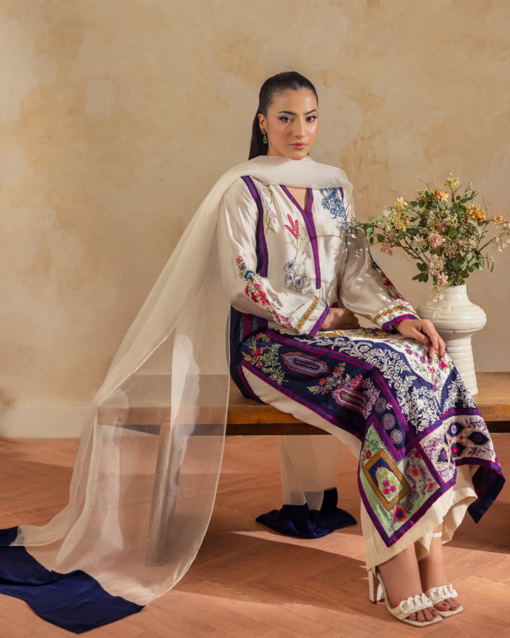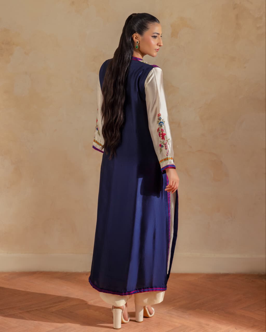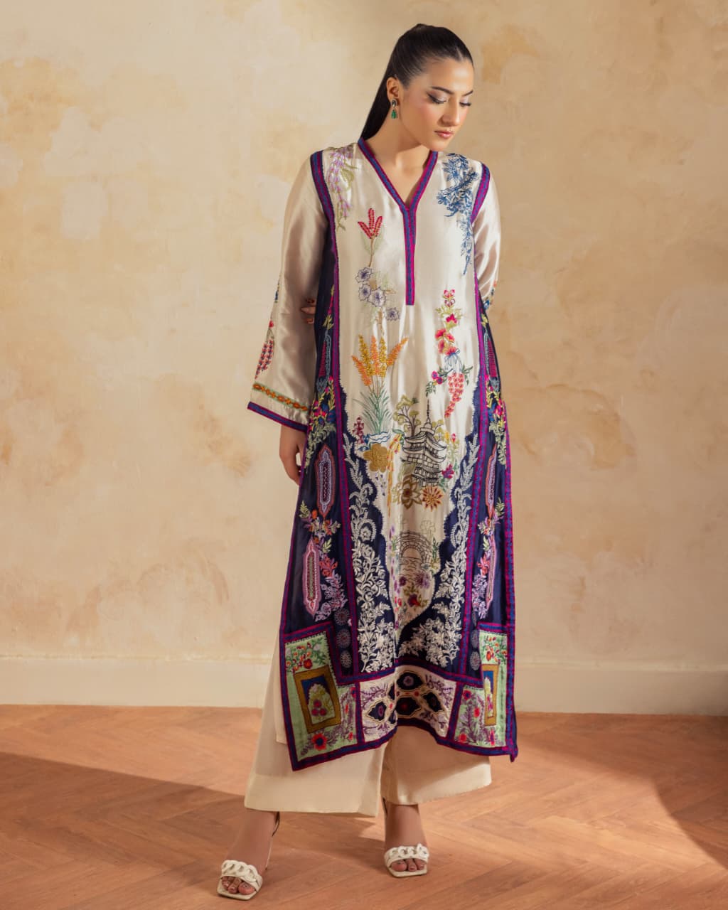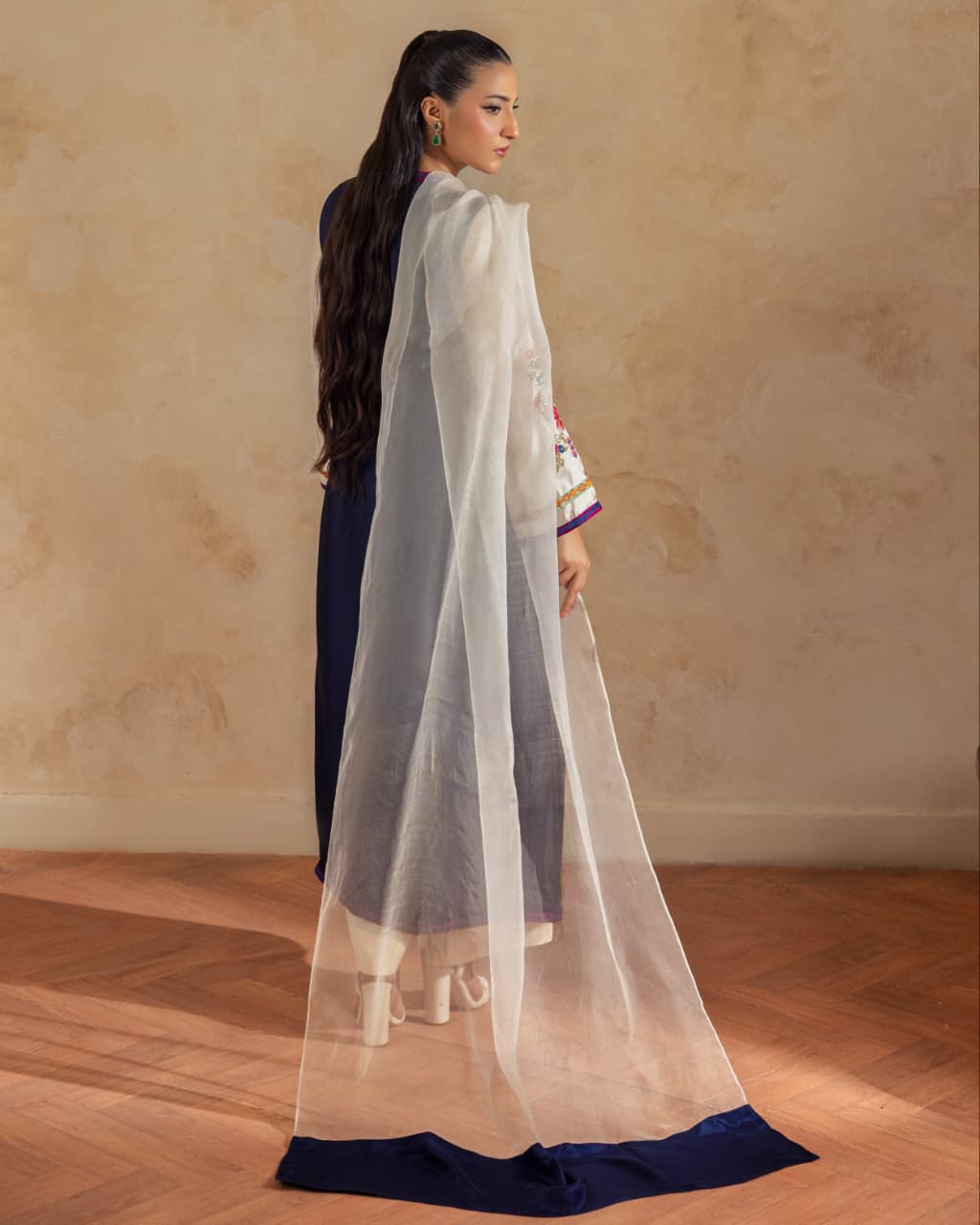 A pure buttersilk long shirt in ivory, featuring a wide hem adorned with navy applique accents and intricate embroidered motifs. Paired with short azaar silk pants and a delicate pure organza dupatta for a refined look.