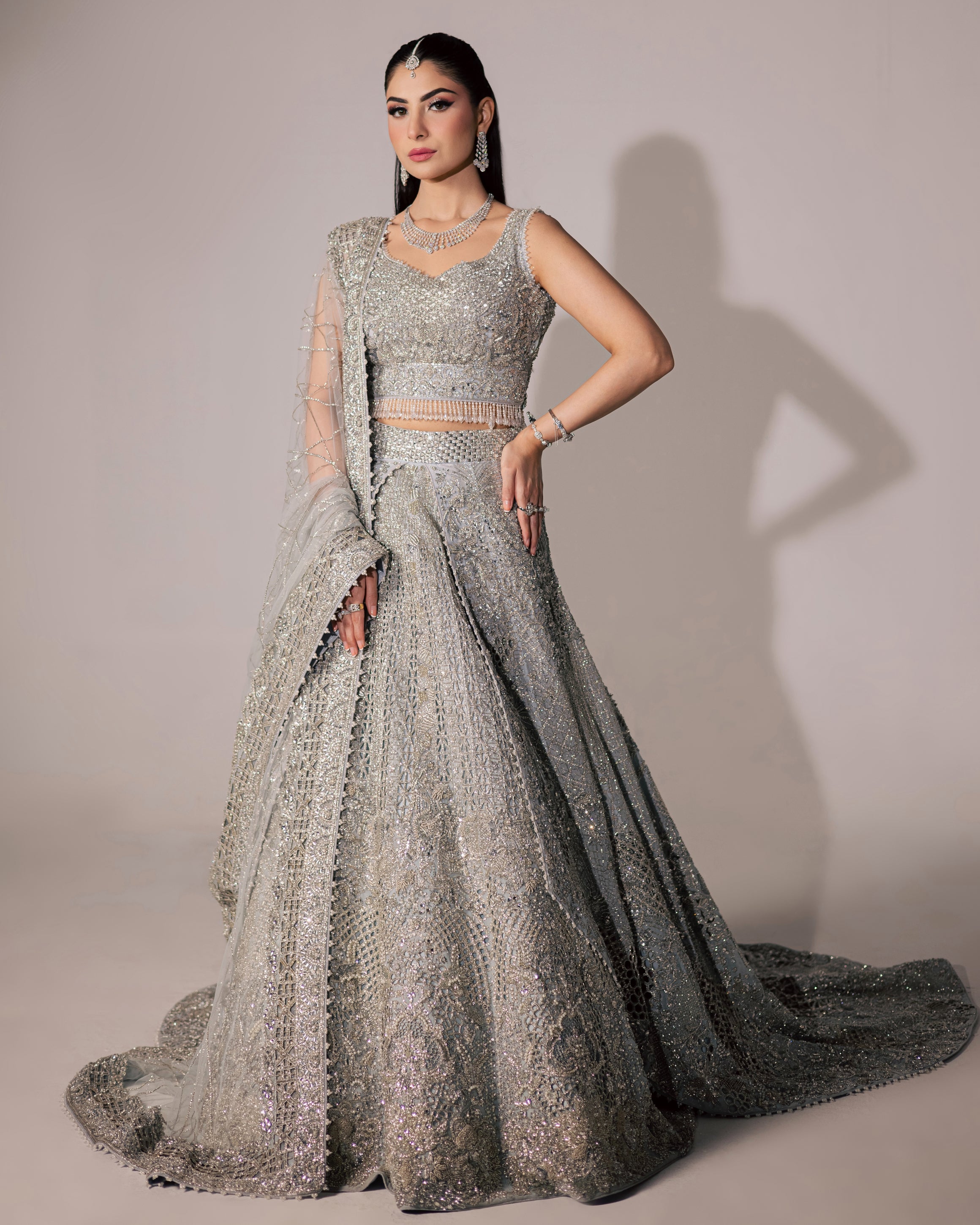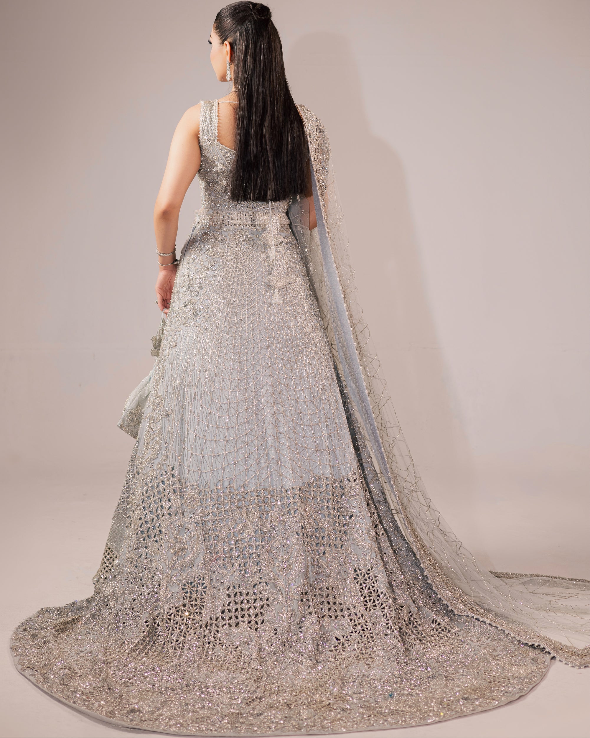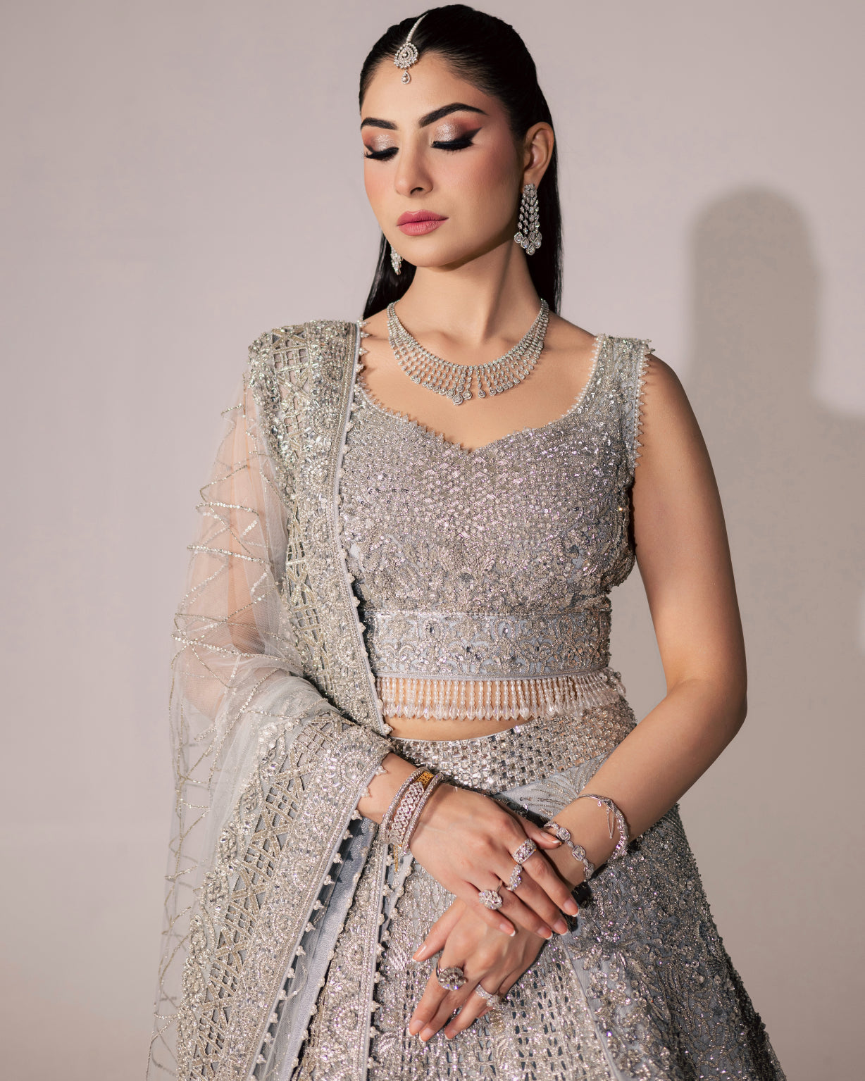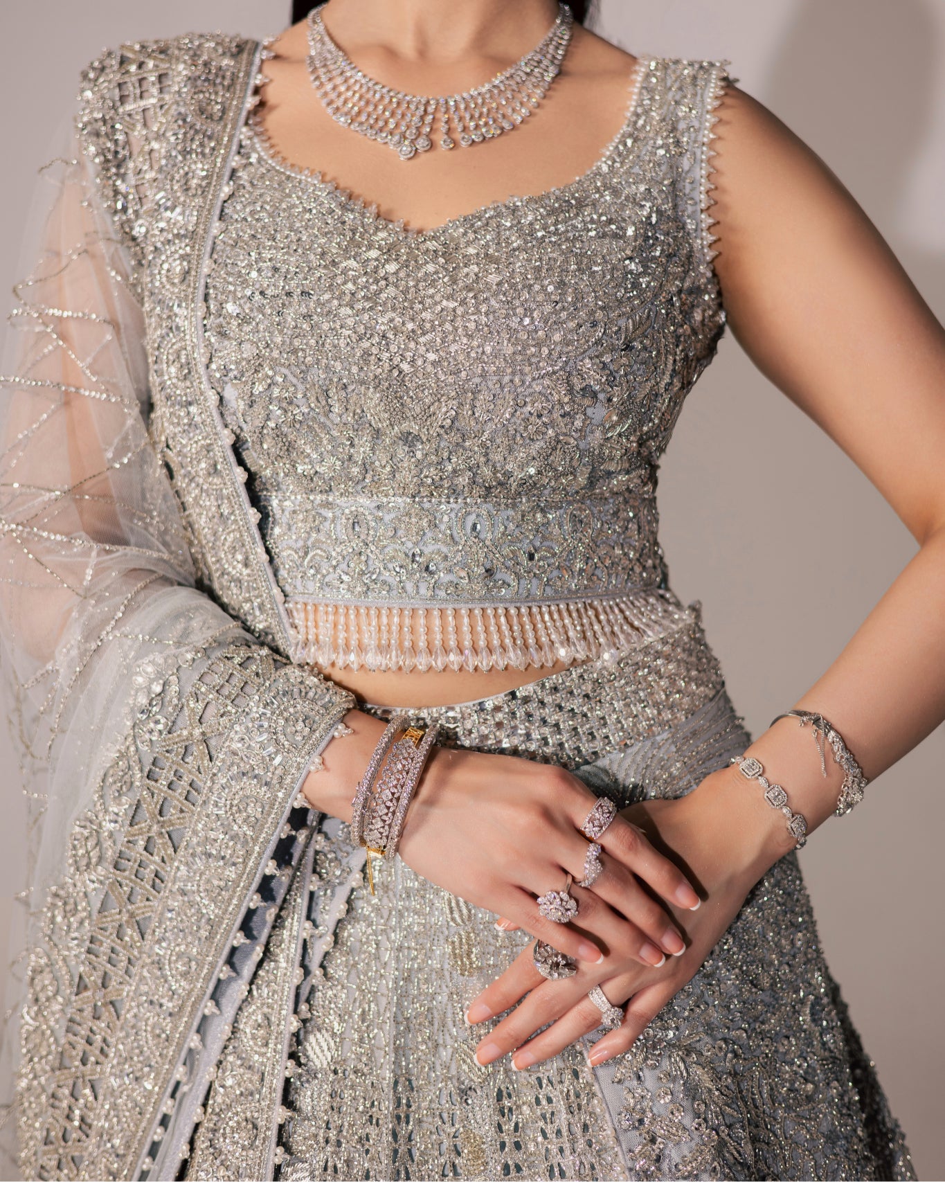 An ice blue net lehenga choli adorned with Swarovski stones, silver crystals, and fine