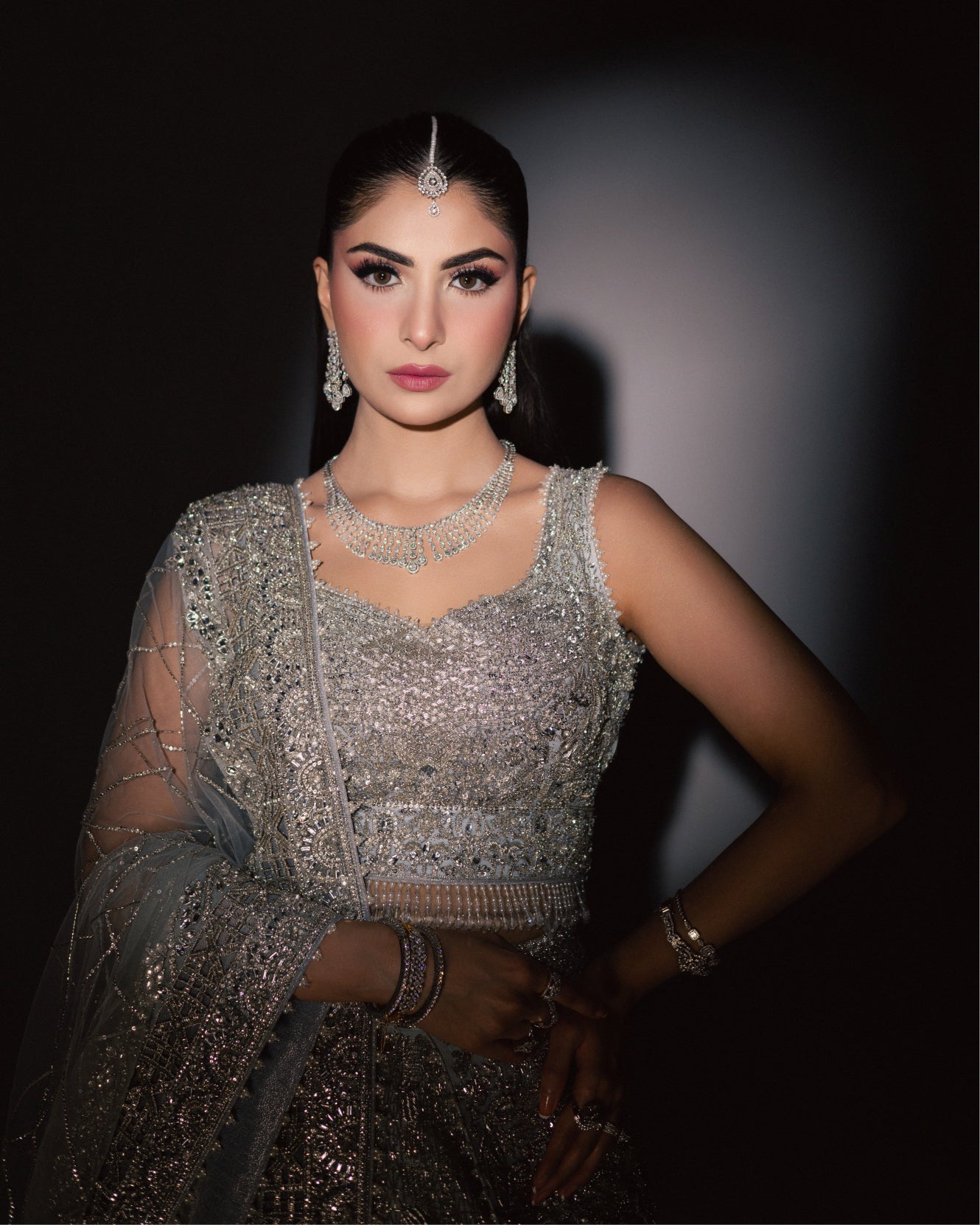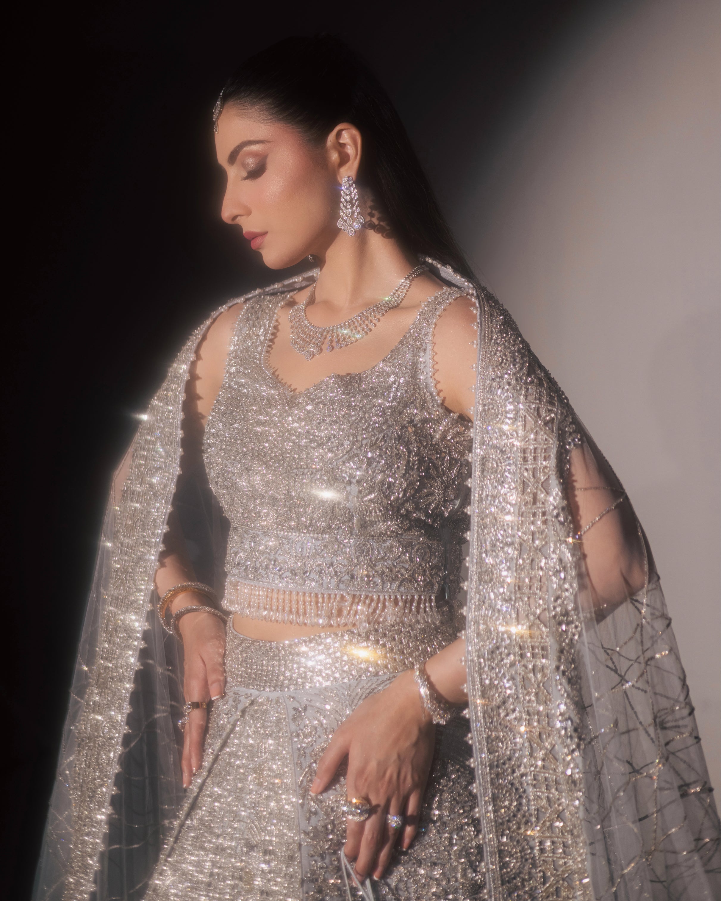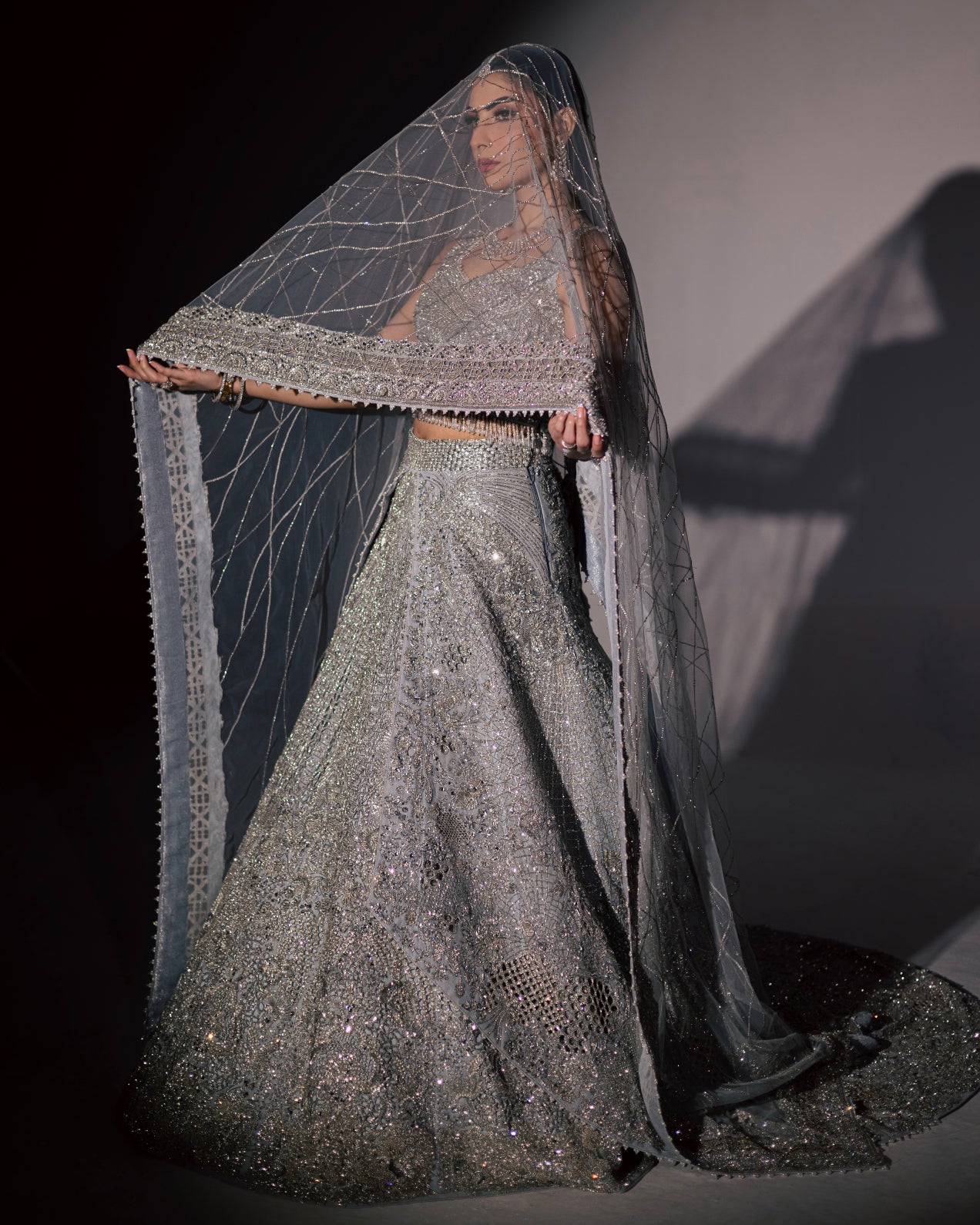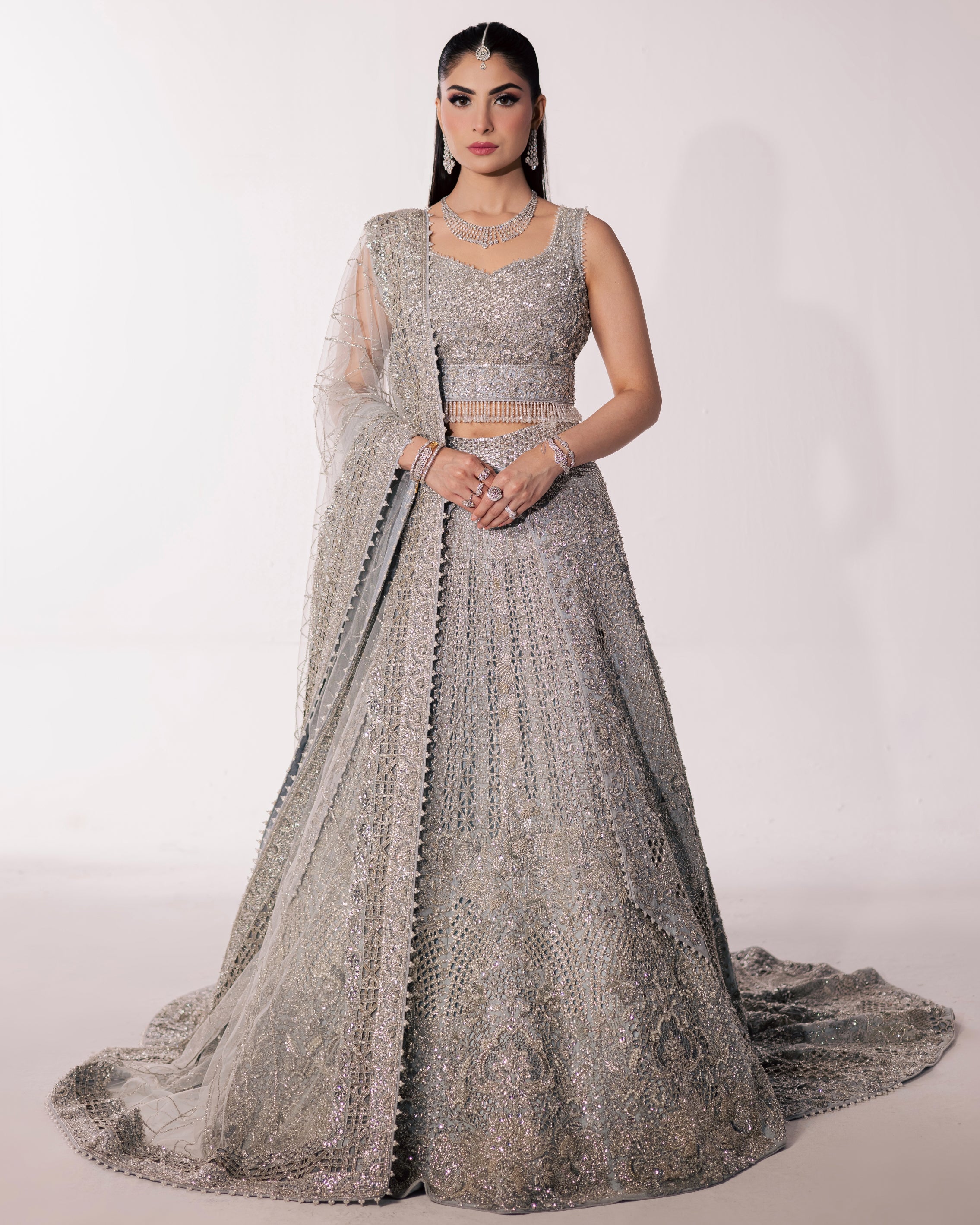 An ice blue net lehenga choli adorned with Swarovski stones, silver crystals, and fine