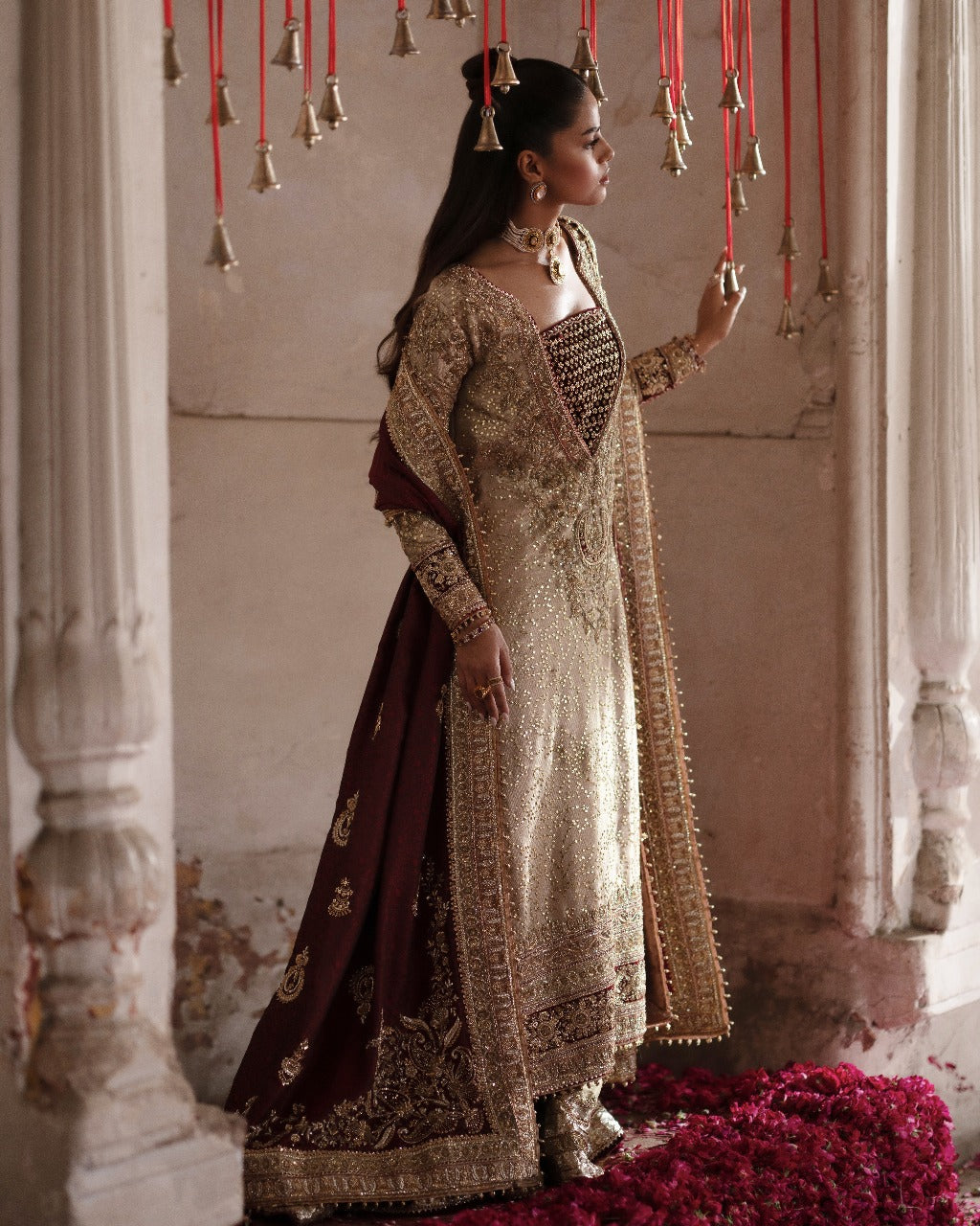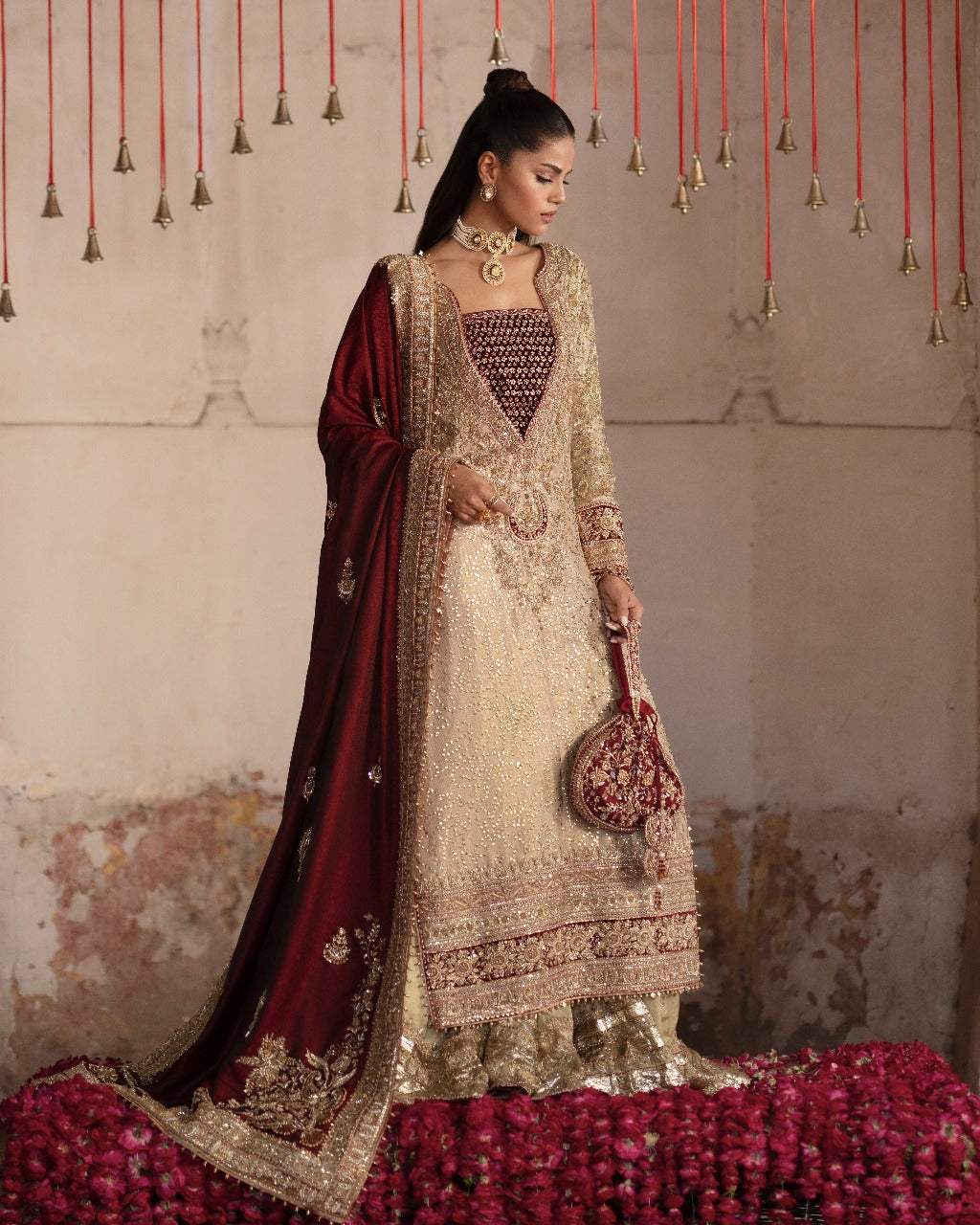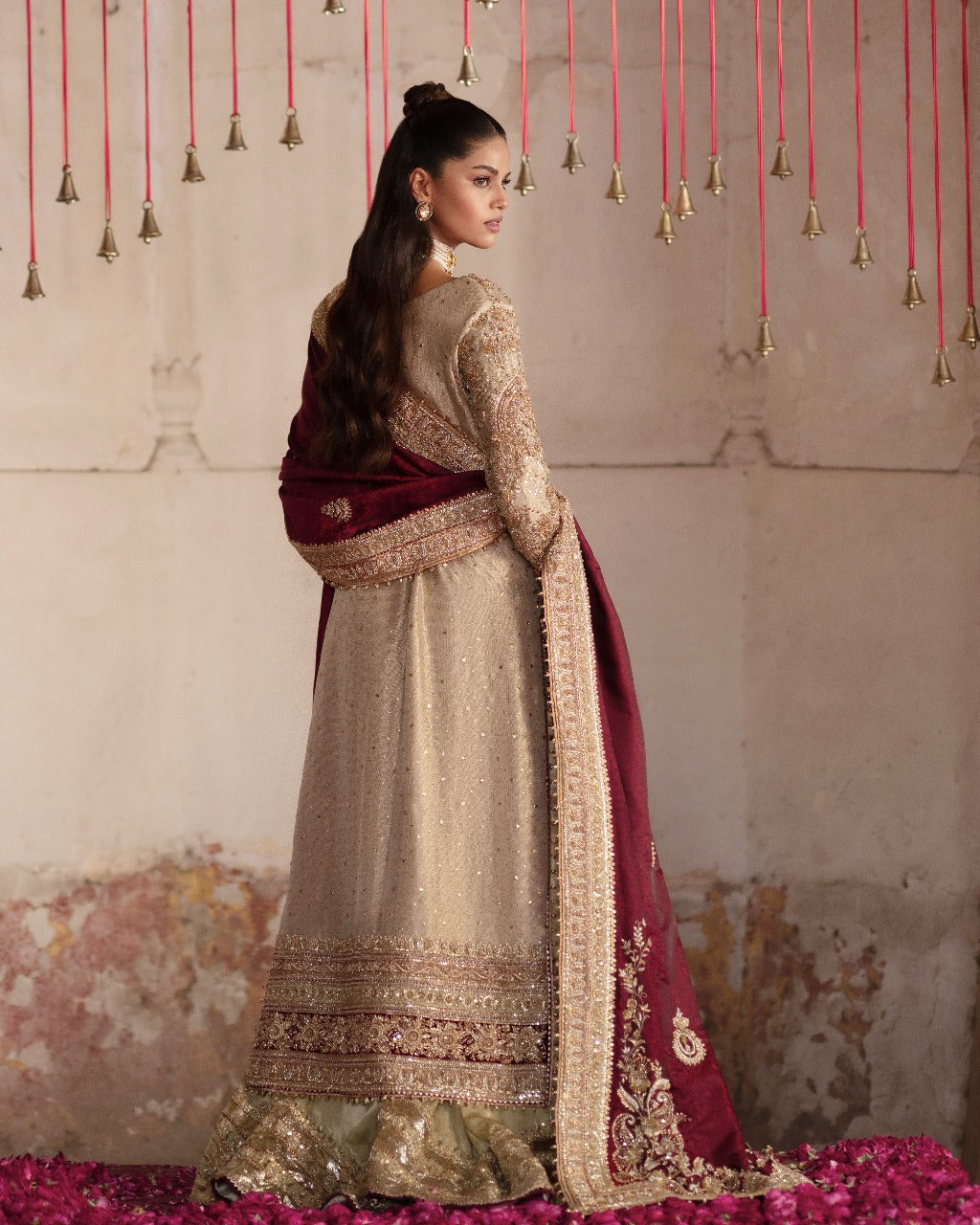A lama shirt with maroon velvet, mint, and gold appliqué borders, paired with a mint silk sharara finished with lappa and gota details. Styled with a hand-embellished maroon velvet bustier and a rich red jamawar chadar — a perfect blend of tradition and elegance.