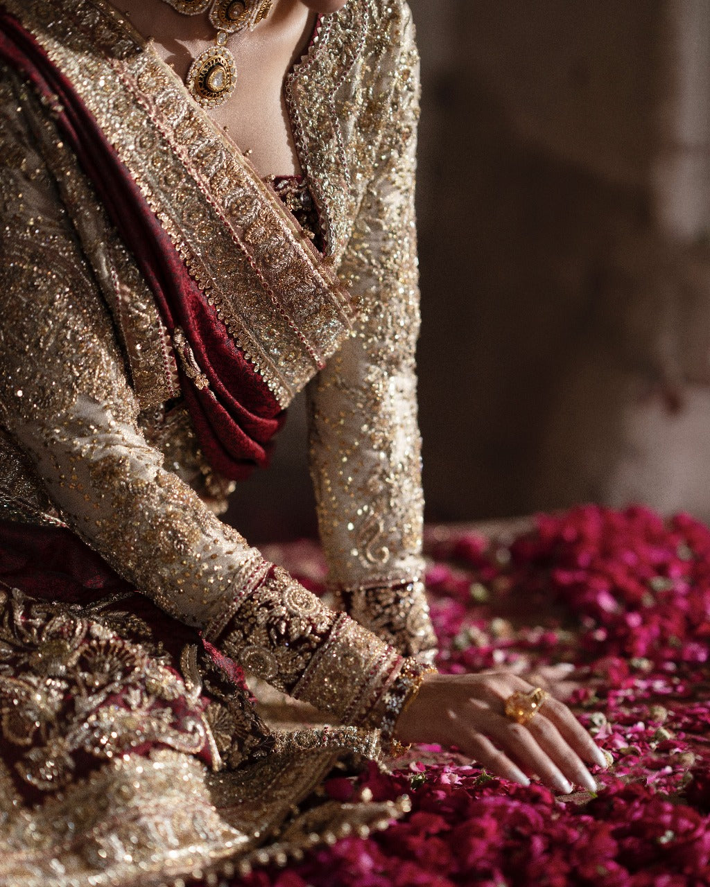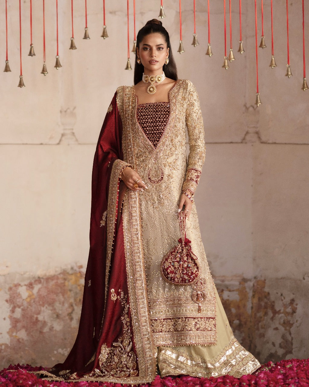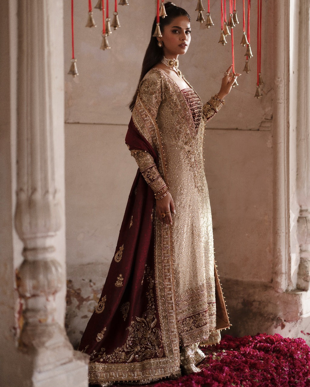 A lama shirt with maroon velvet, mint, and gold appliqué borders, paired with a mint silk sharara finished with lappa and gota details. Styled with a hand-embellished maroon velvet bustier and a rich red jamawar chadar — a perfect blend of tradition and elegance.
