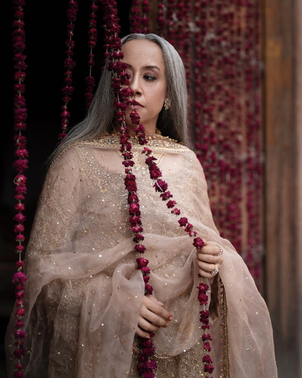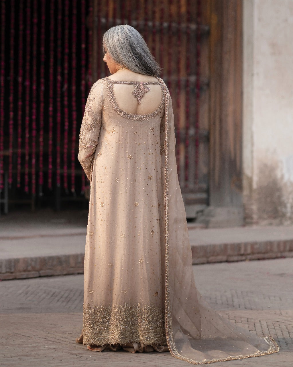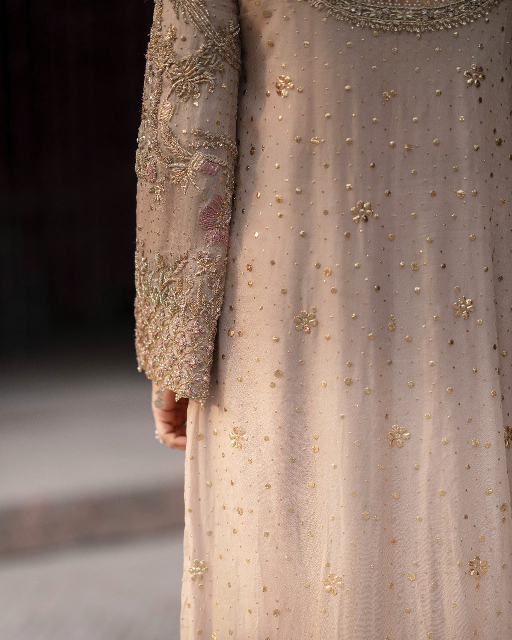 A pure organza long shirt with delicate resham embroidery, highlighted with sitara and dabki work. Paired with a pure shamose sharara and an organza dupatta — timeless and graceful.