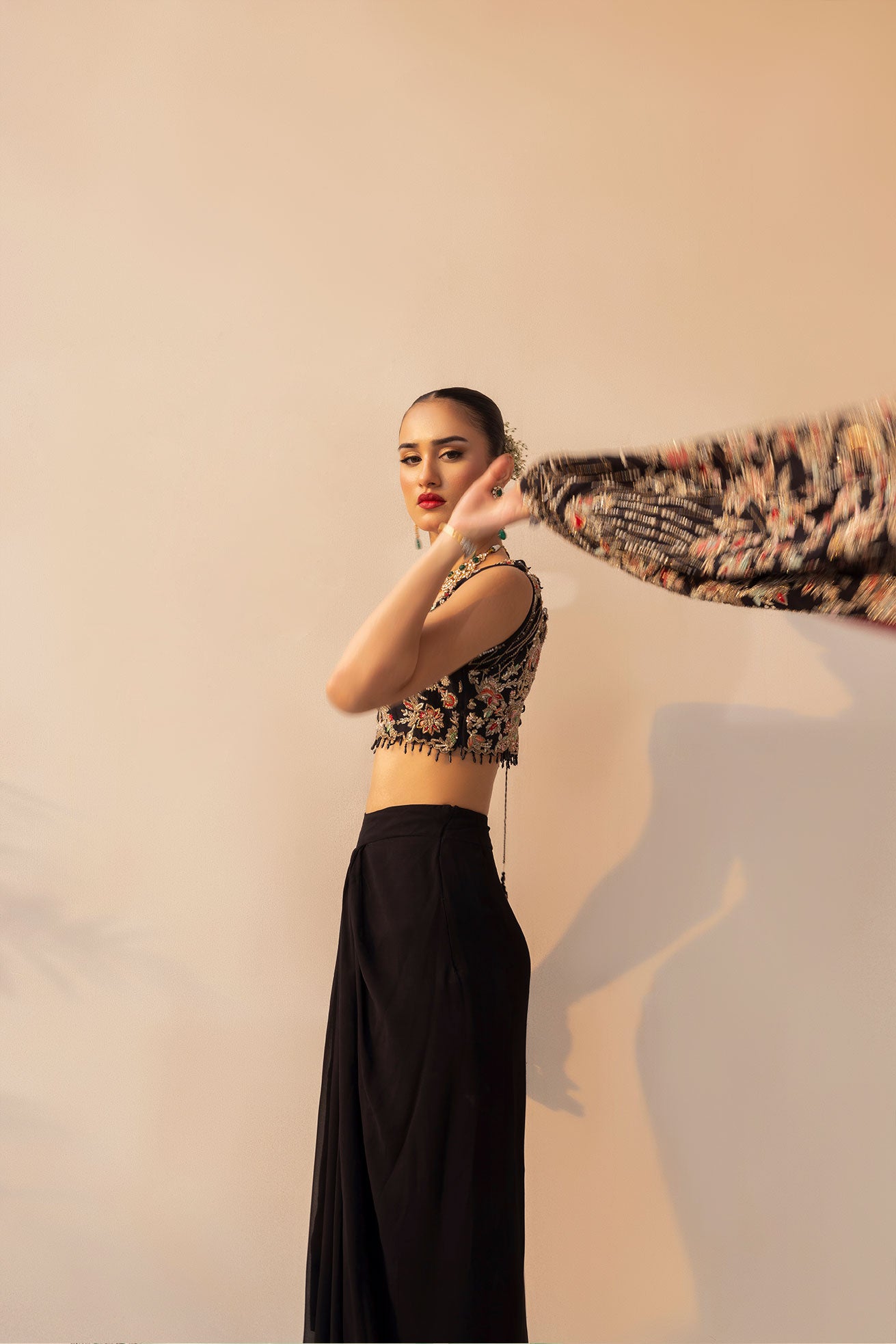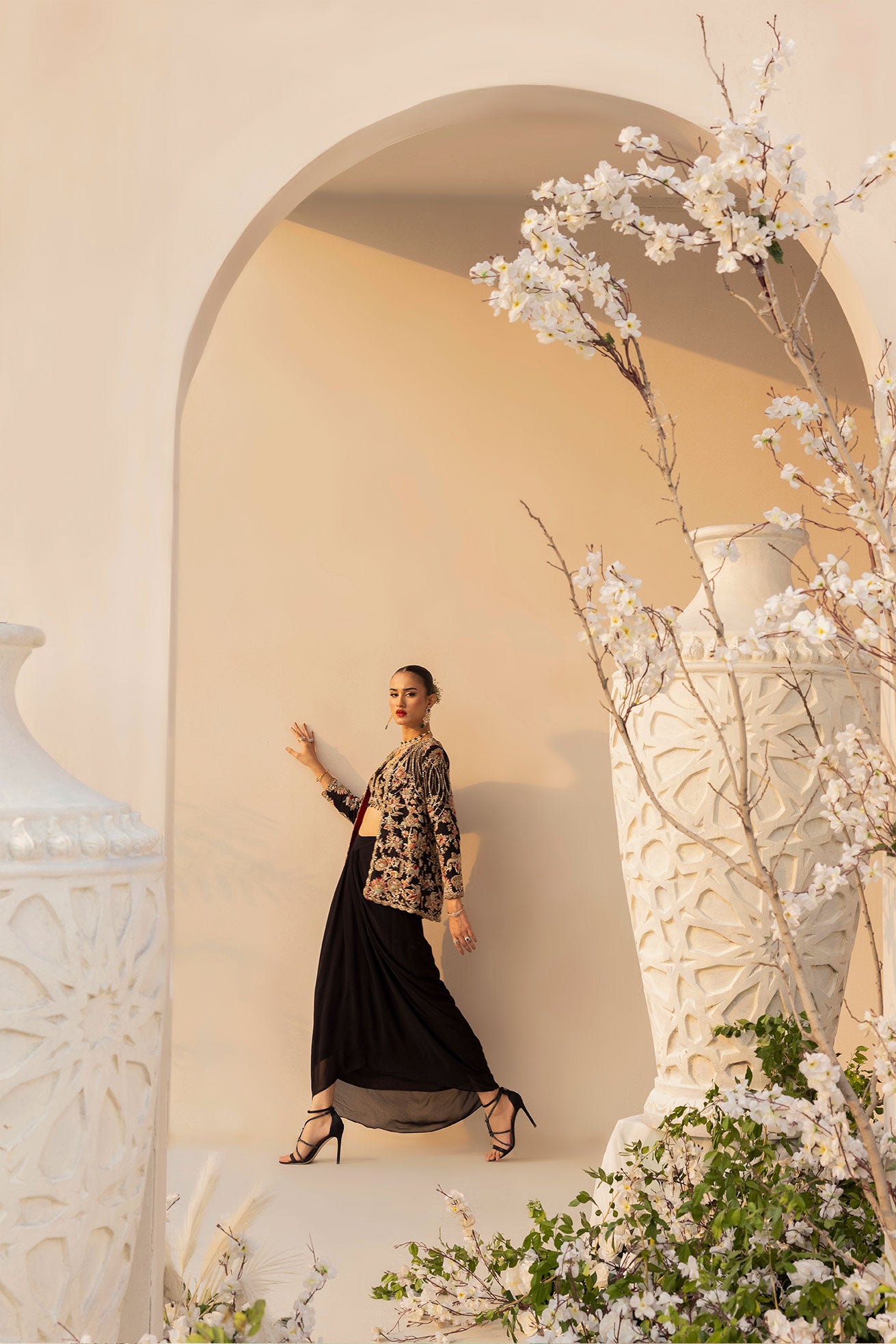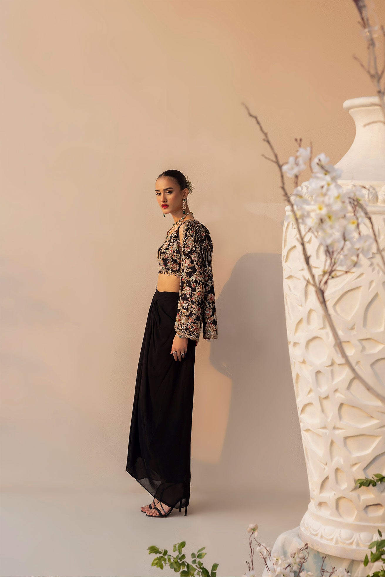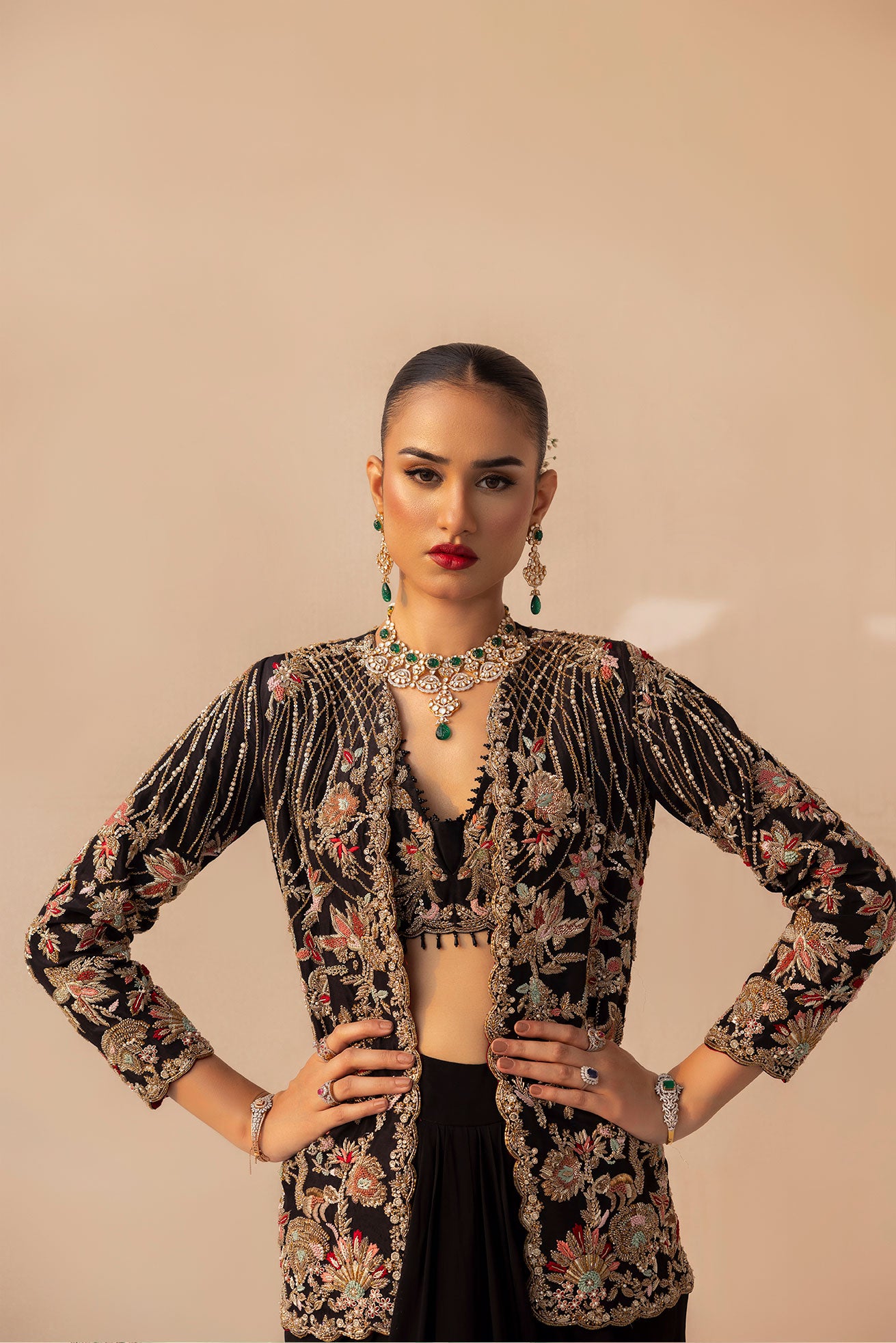 A silk short jacket paired with a chiffon skirt. The jacket is finely embellished with naqshi, dabka and resham work. An embellished blouse is paired underneath to complement the look.