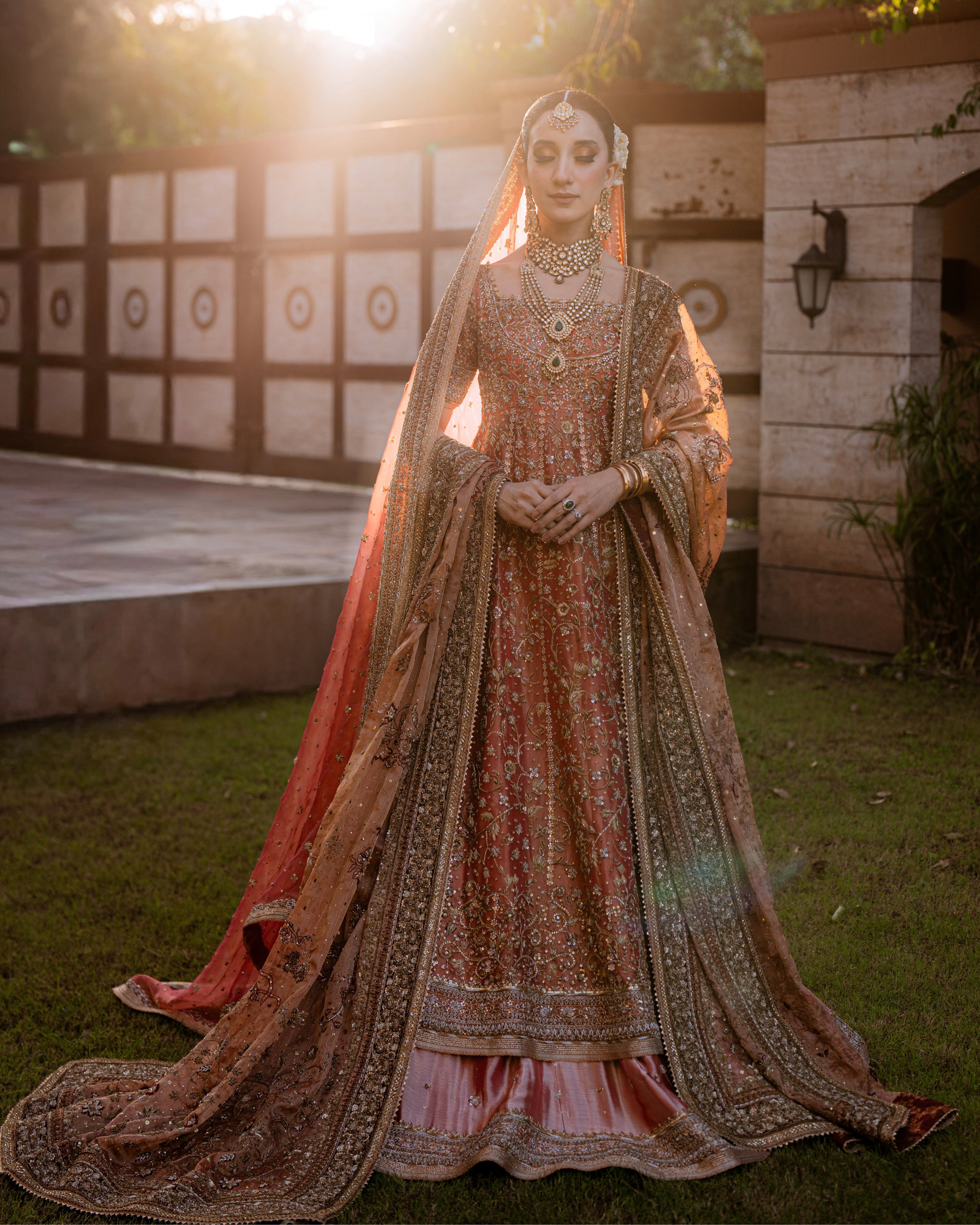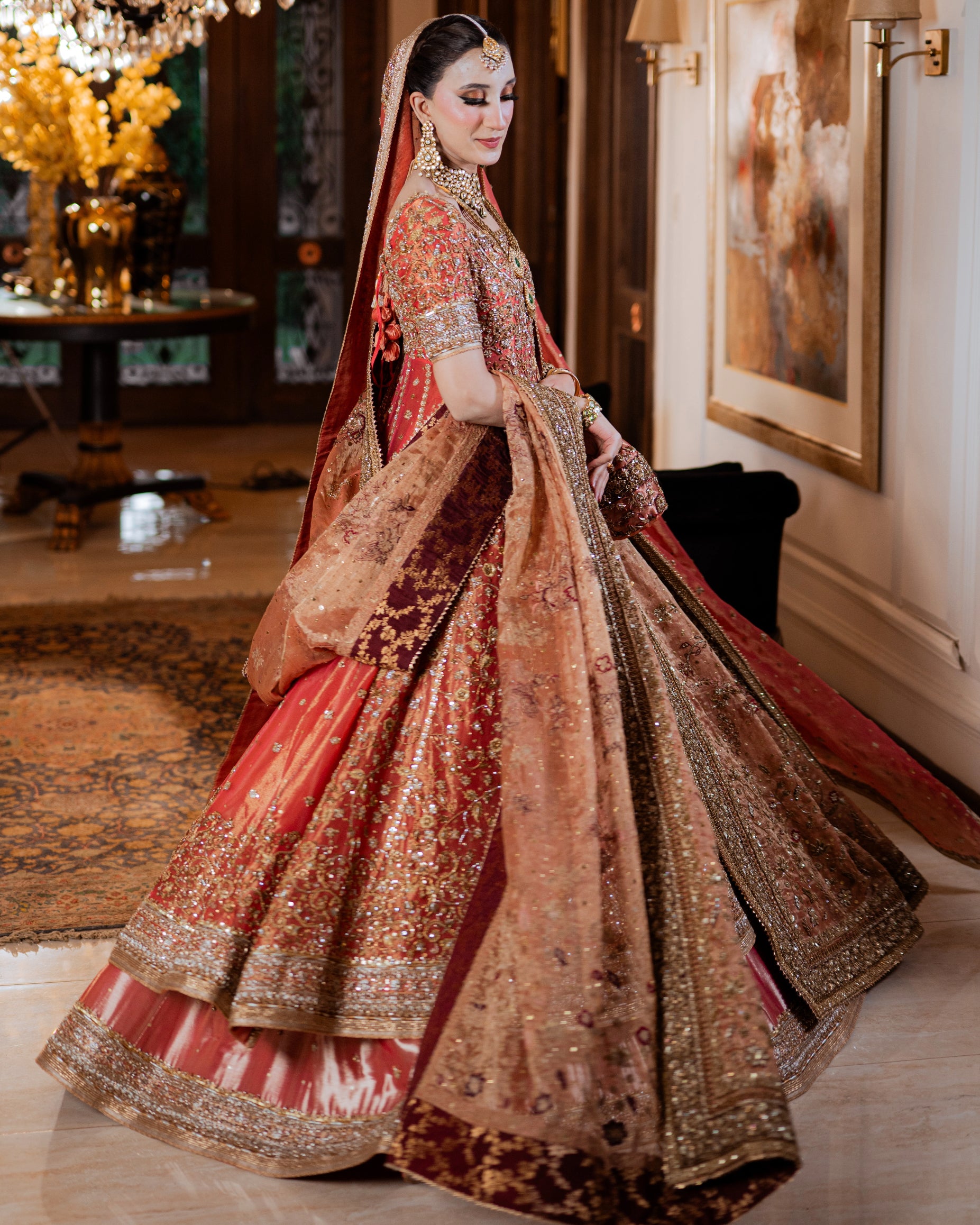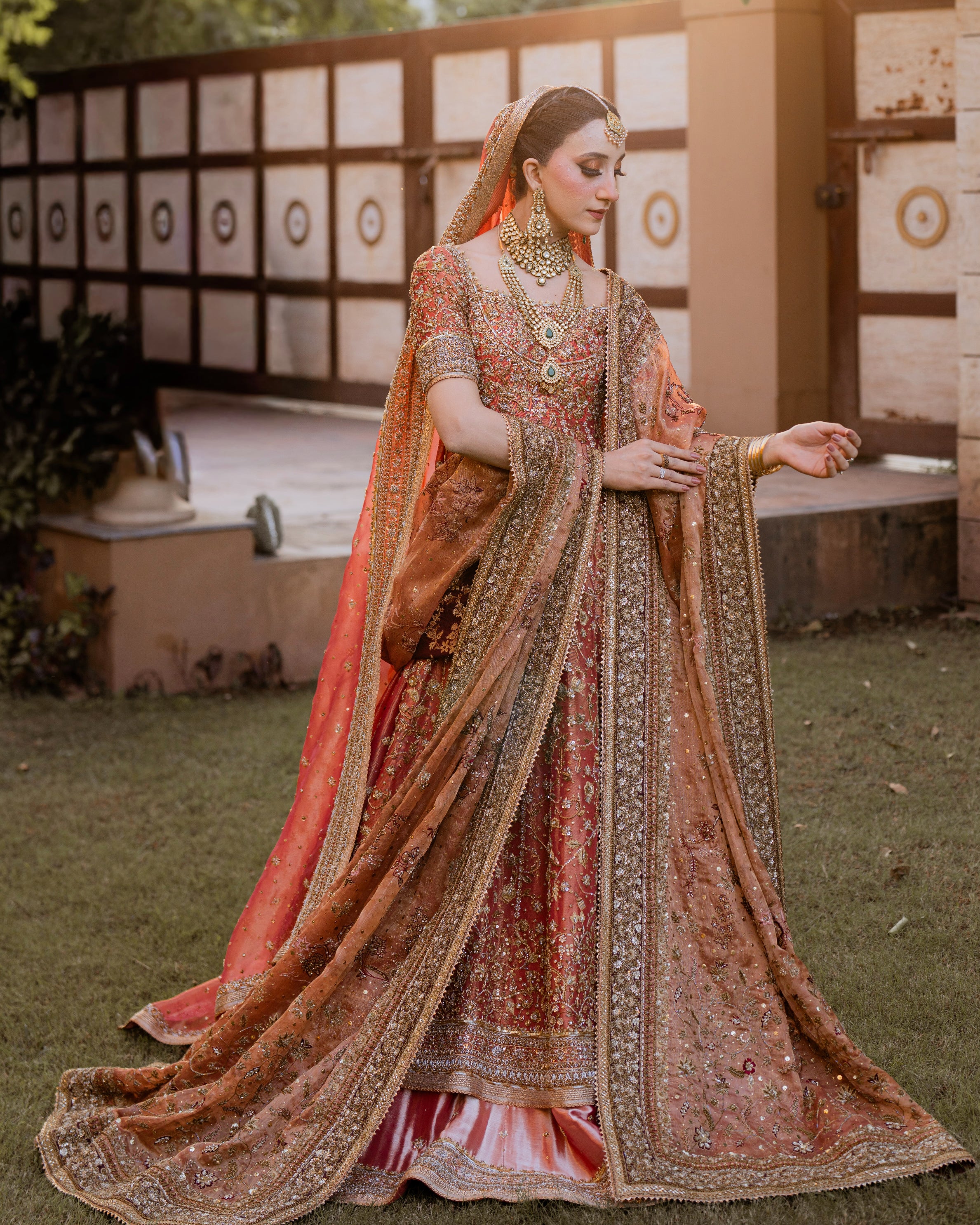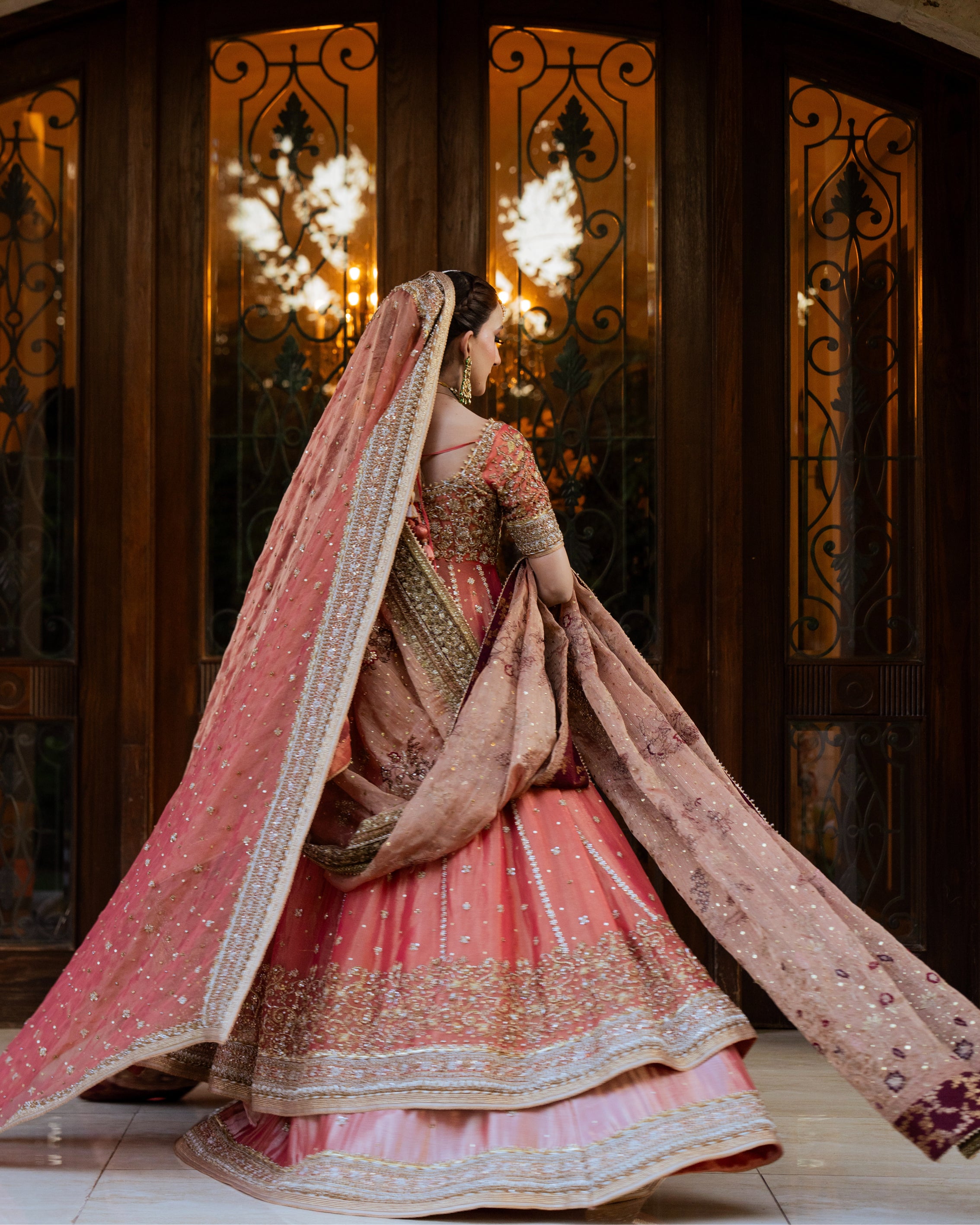 A pink zari net pishwas adorned with dabka, kora, sitara and Swarovski stones, paired with a pure lamma lehenga featuring a handcrafted border. The look is completed with two zari net dupattas- one with an intricately detailed four-sided border and the other with gold zari handwork, adorned pallus and borders, adding a regal touch to the heirloom bridal look.