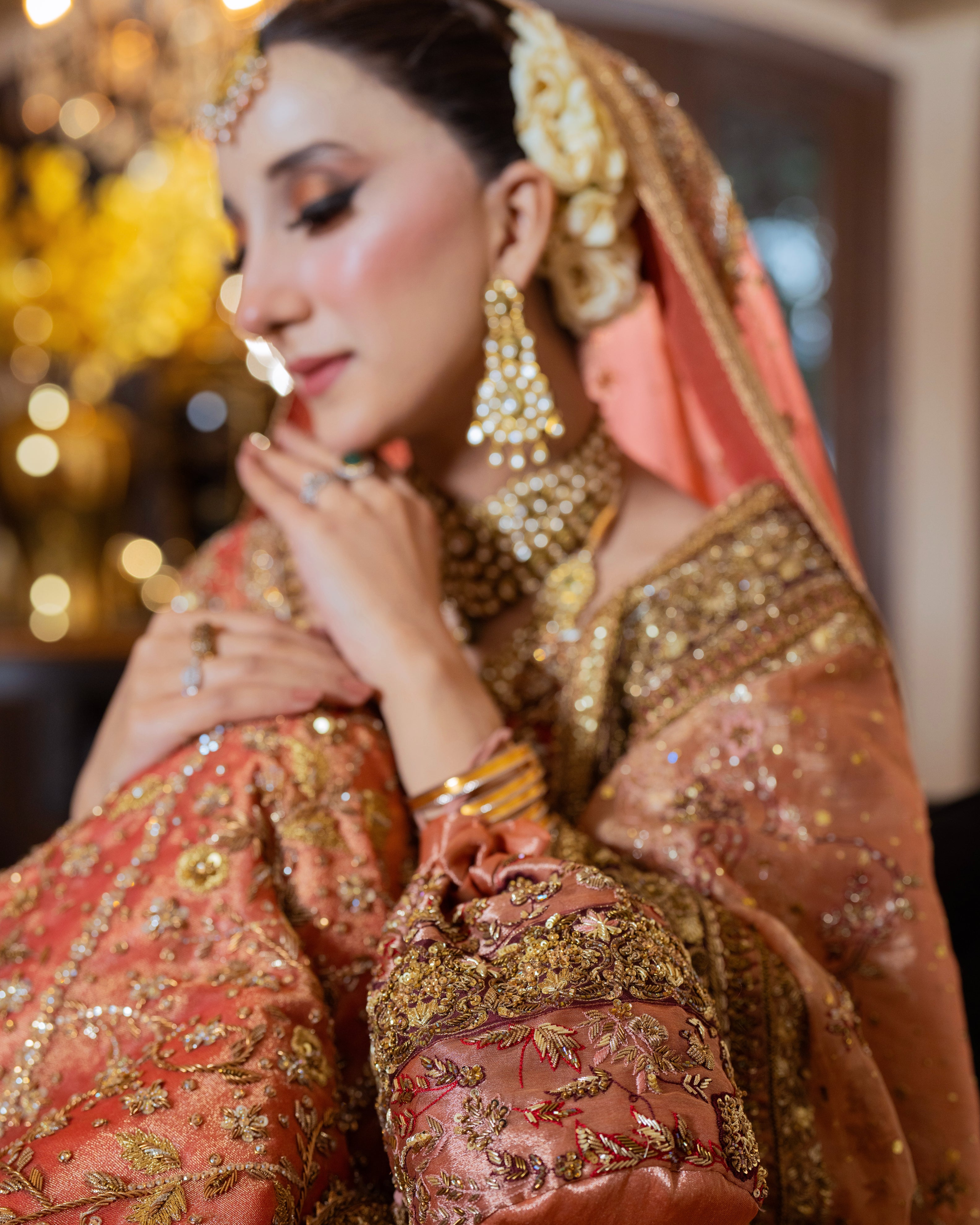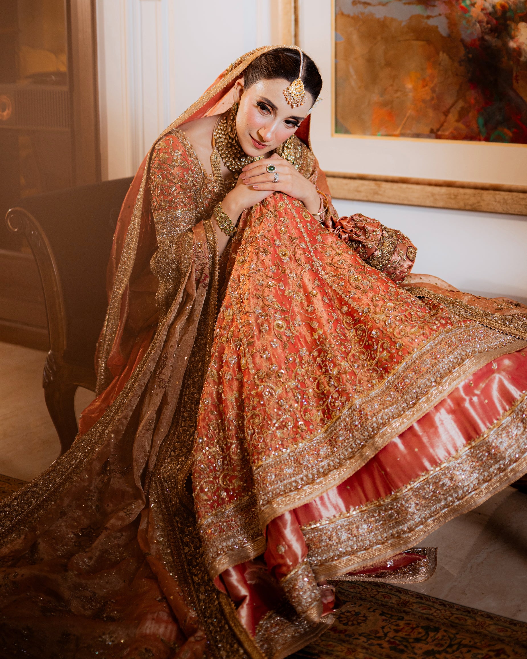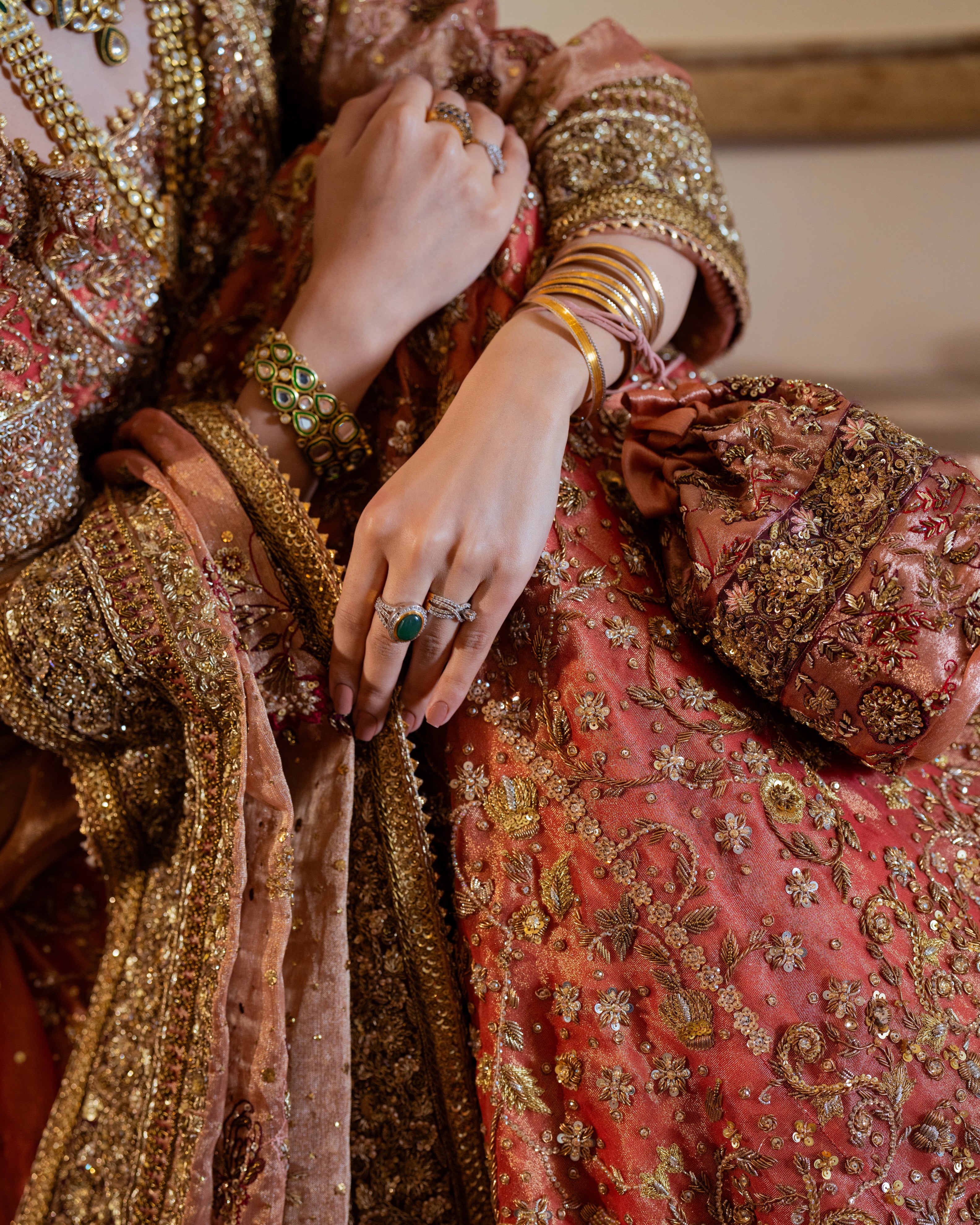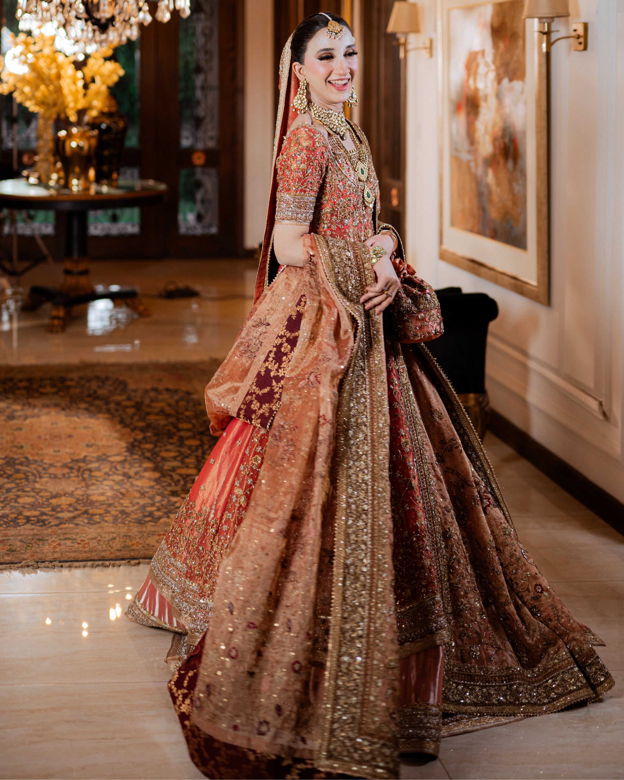 A pink zari net pishwas adorned with dabka, kora, sitara and Swarovski stones, paired with a pure lamma lehenga featuring a handcrafted border. The look is completed with two zari net dupattas- one with an intricately detailed four-sided border and the other with gold zari handwork, adorned pallus and borders, adding a regal touch to the heirloom bridal look.