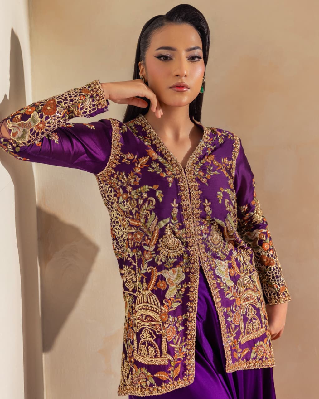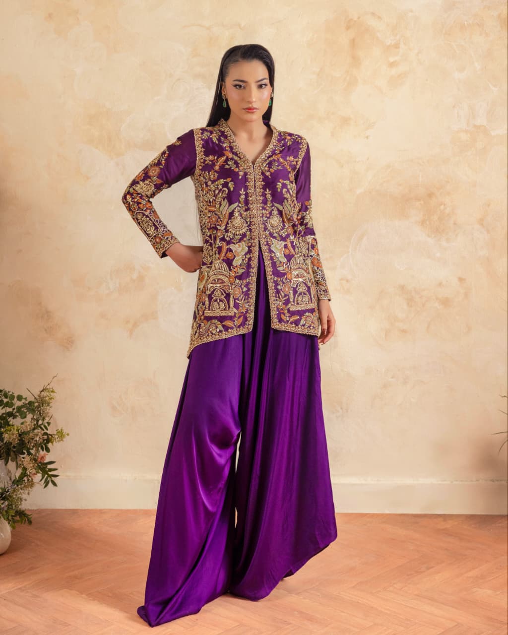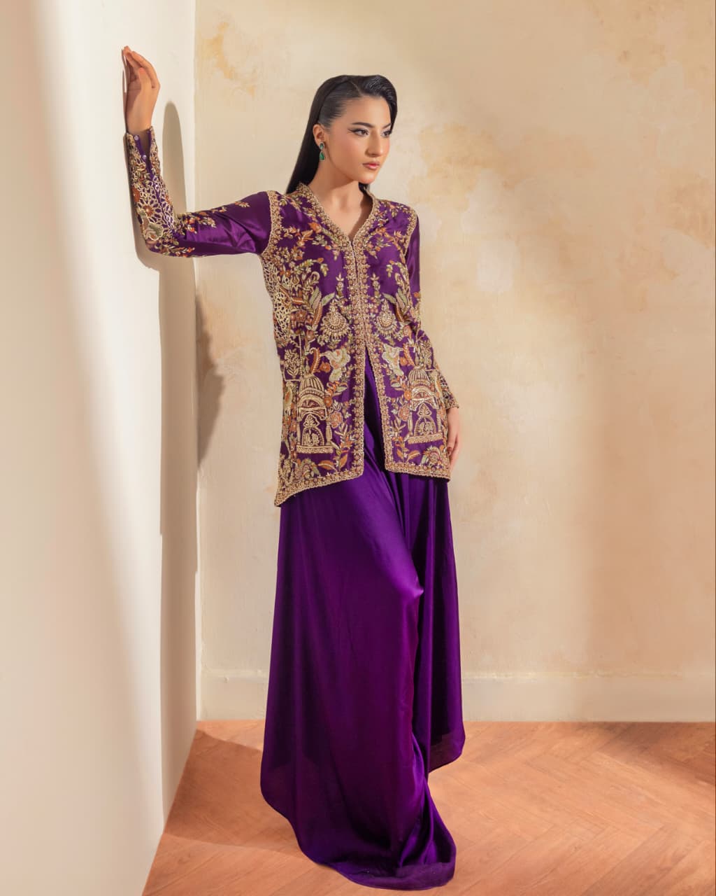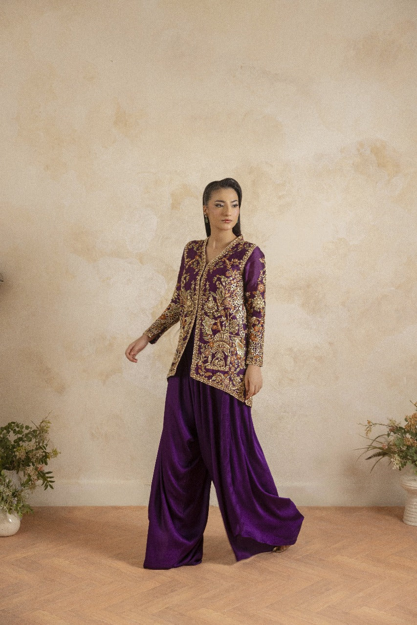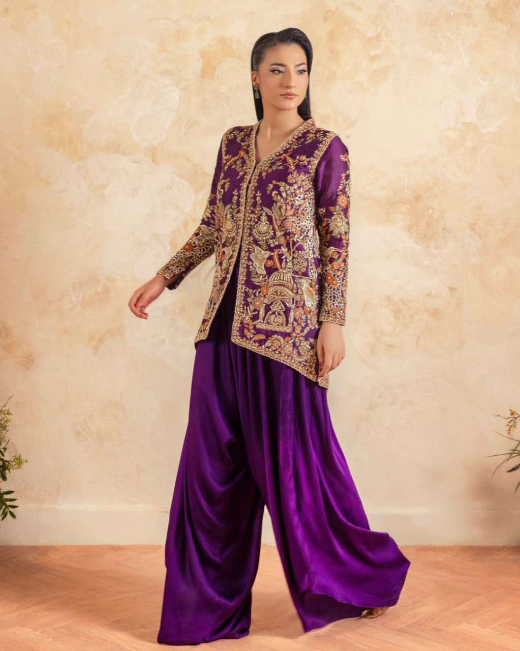 A pure silk front-open jacket with asymmetrical, draped corners, intricately embroidered in shades of rust and beige, and beautifully enhanced with dabka and sitara handwork. Paired with pure shamose wide-legged draped pants for a statement ensemble.