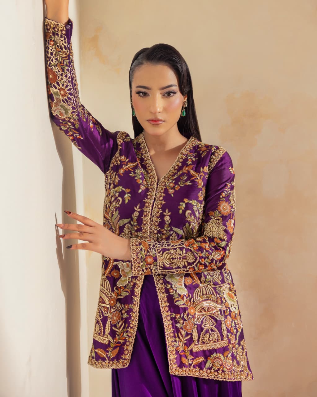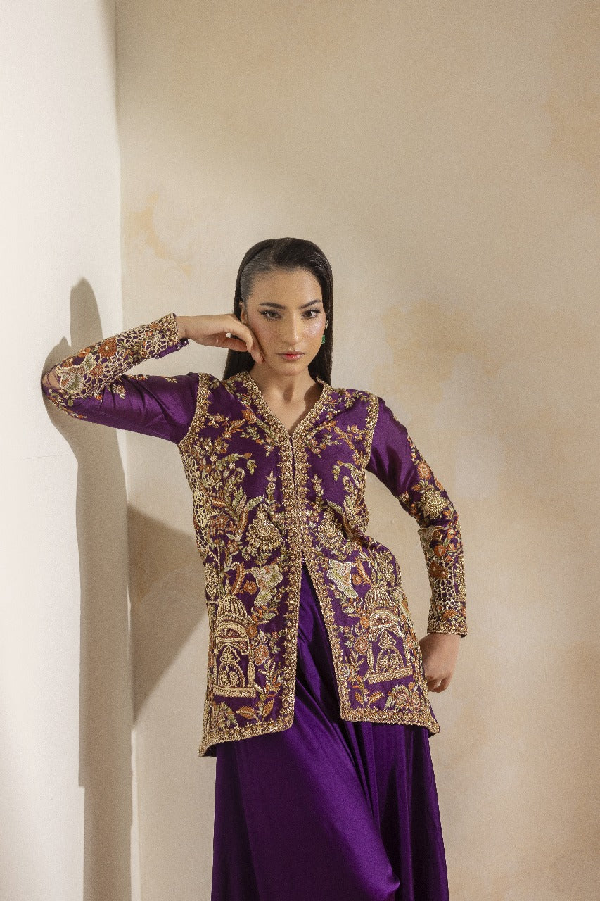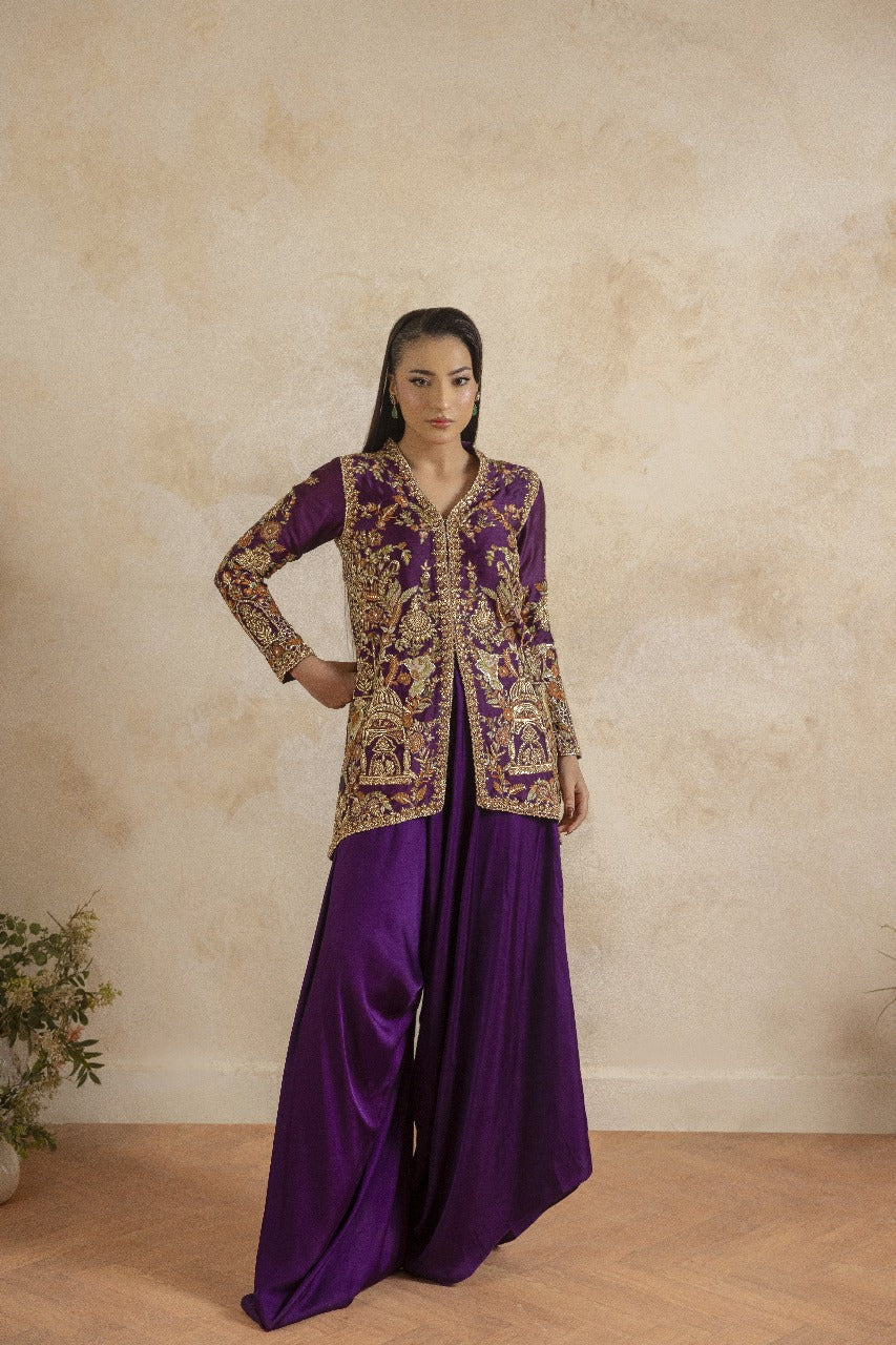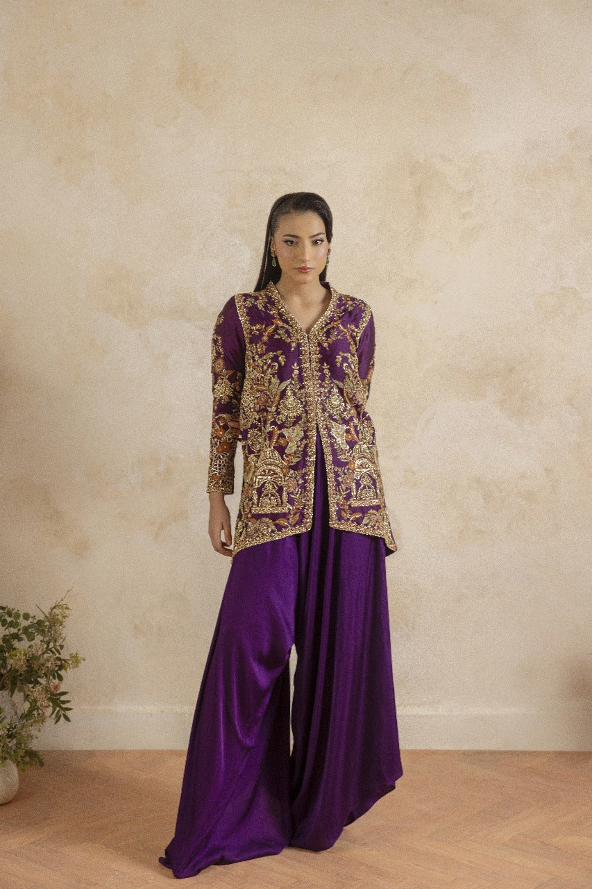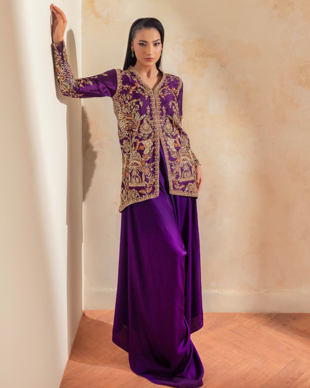 A pure silk front-open jacket with asymmetrical, draped corners, intricately embroidered in shades of rust and beige, and beautifully enhanced with dabka and sitara handwork. Paired with pure shamose wide-legged draped pants for a statement ensemble.