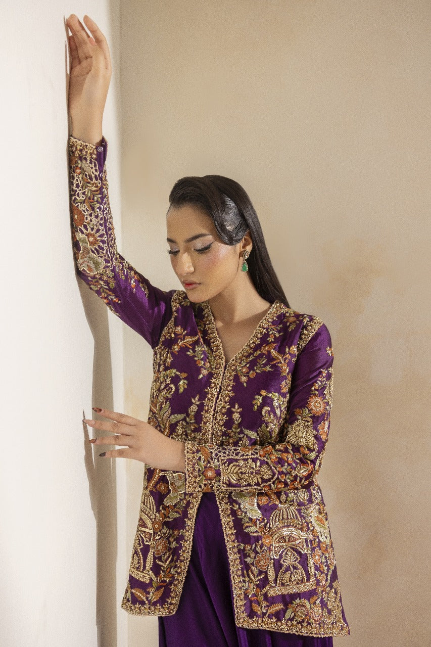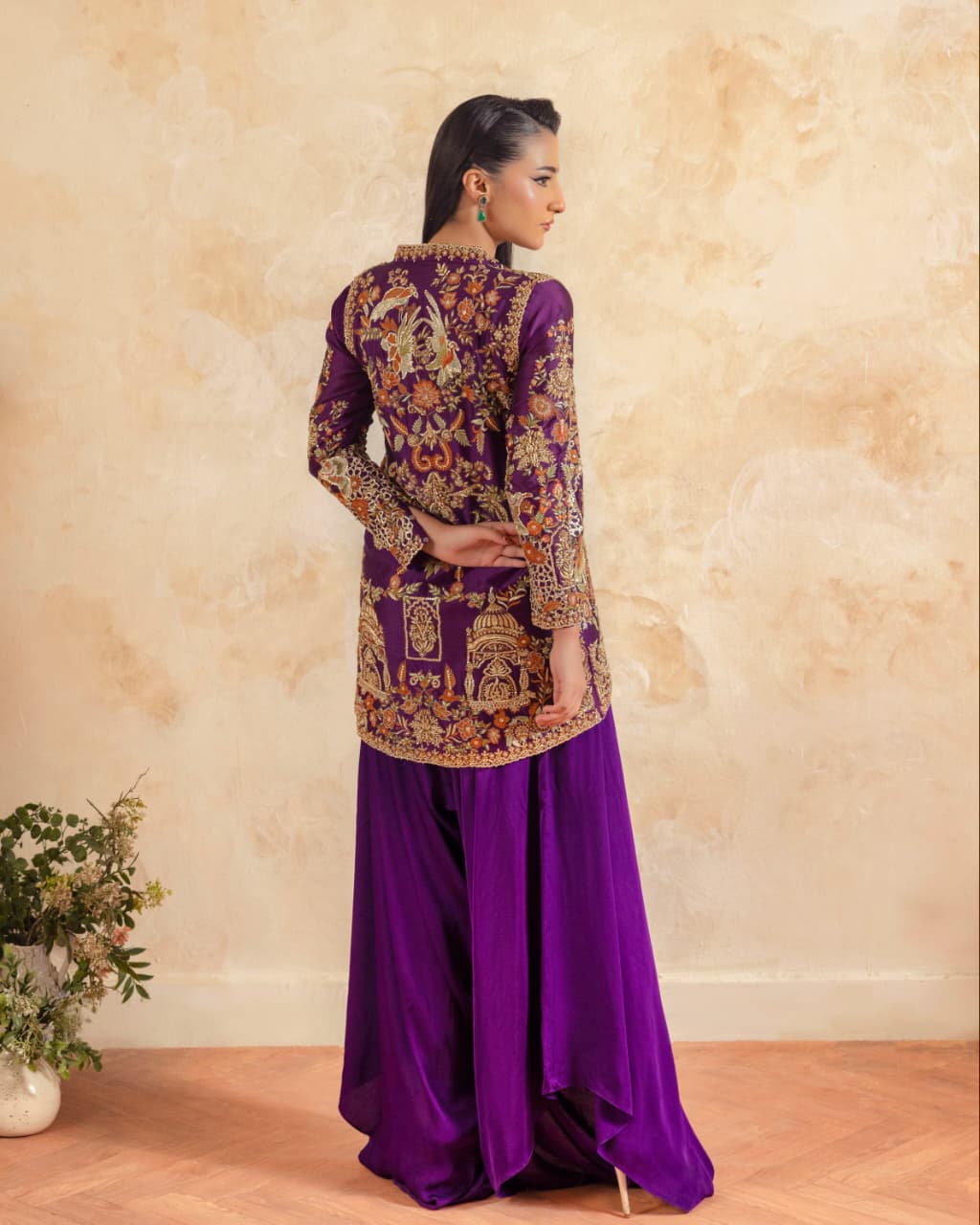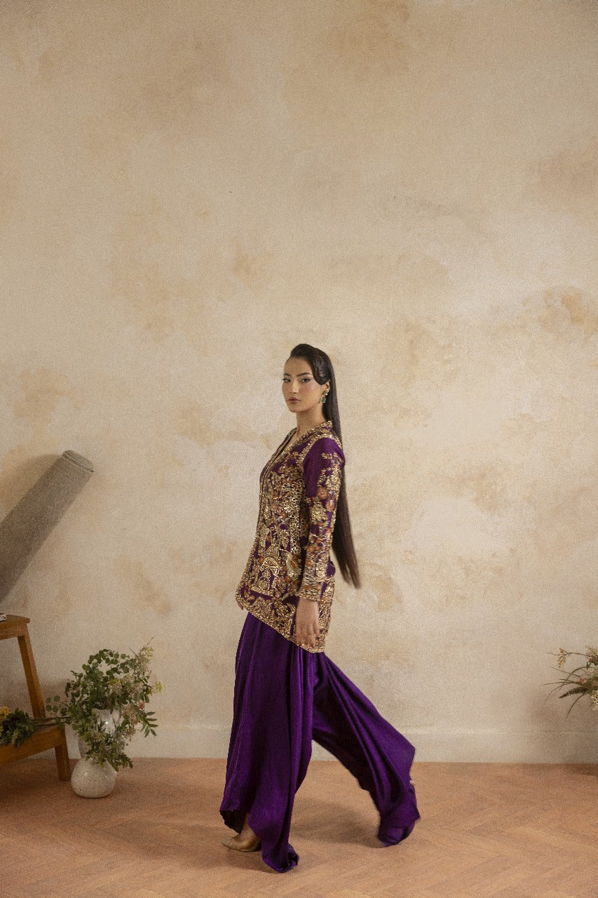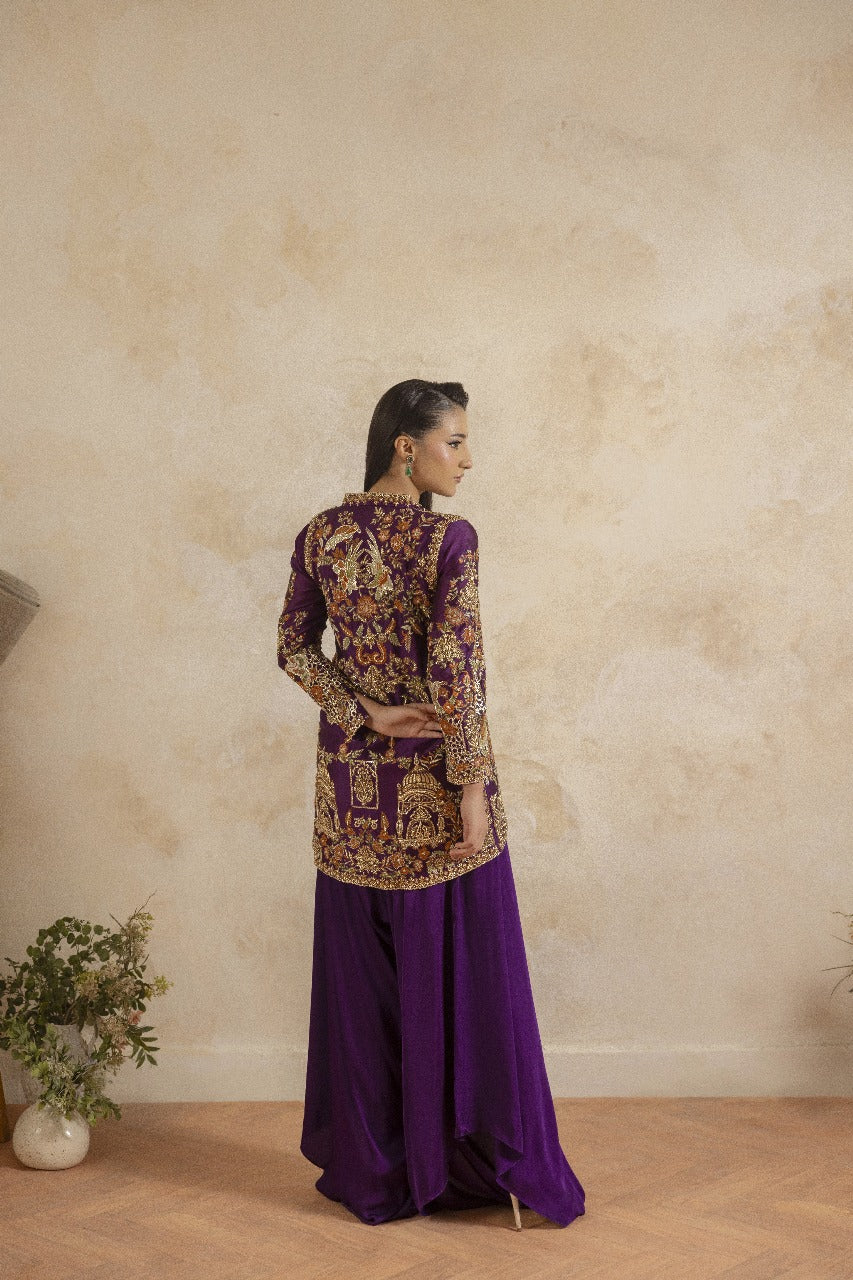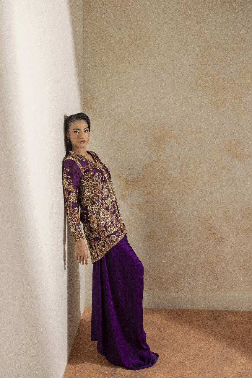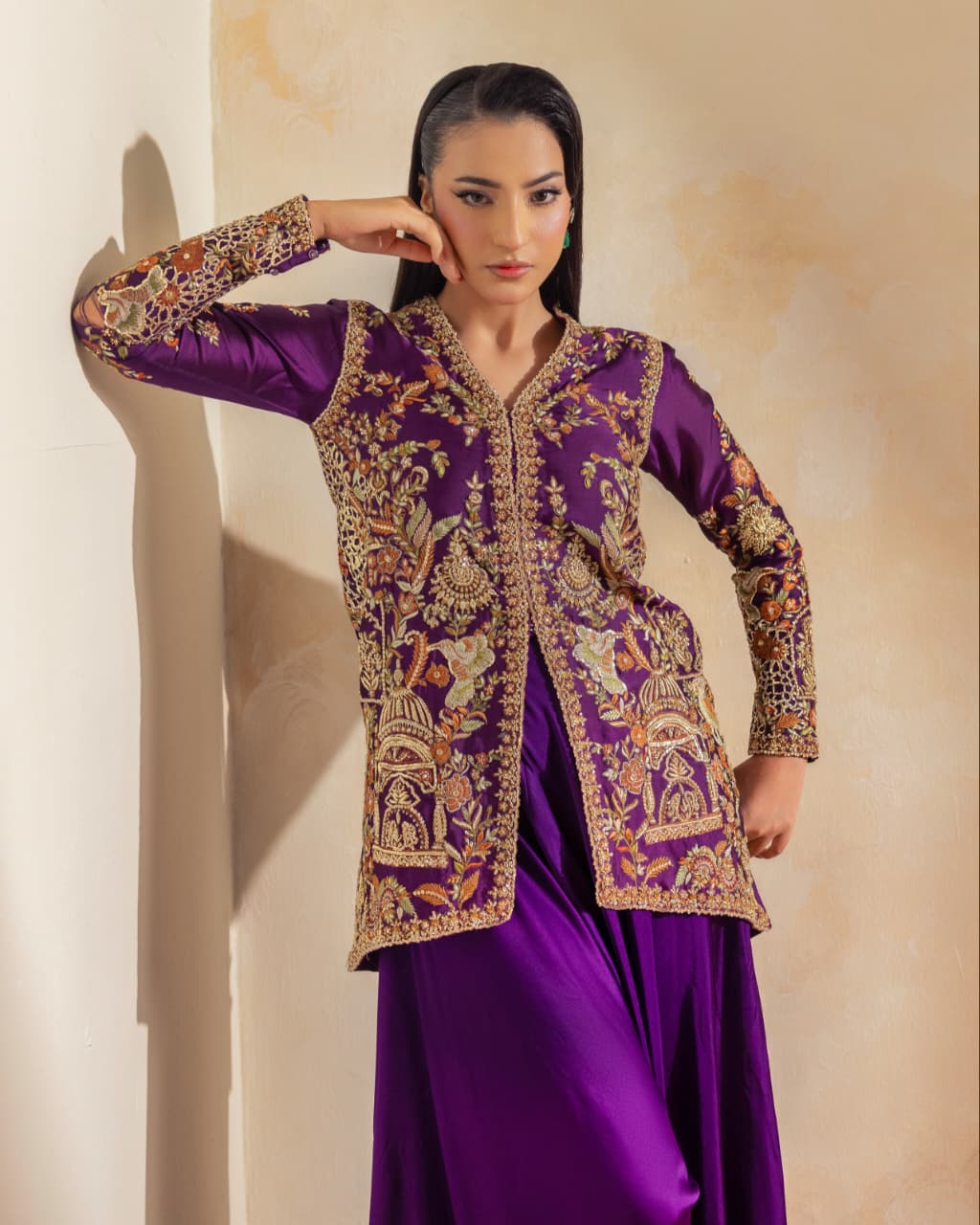 A pure silk front-open jacket with asymmetrical, draped corners, intricately embroidered in shades of rust and beige, and beautifully enhanced with dabka and sitara handwork. Paired with pure shamose wide-legged draped pants for a statement ensemble.