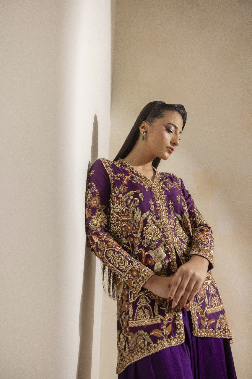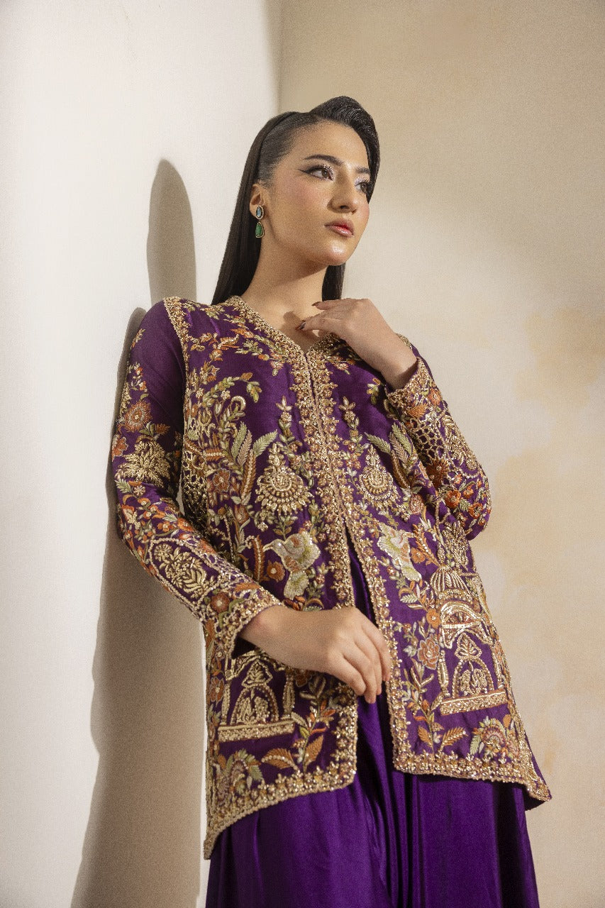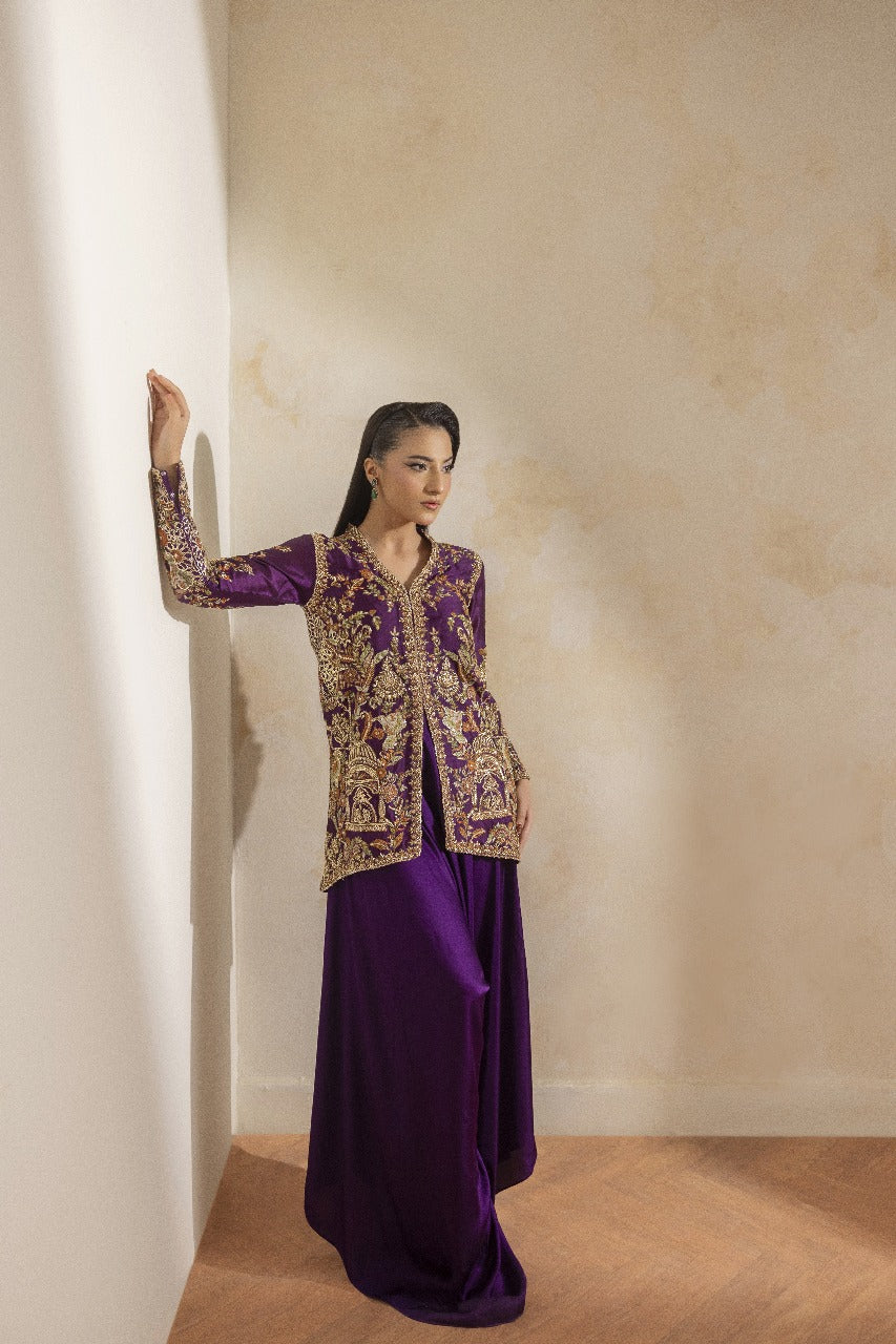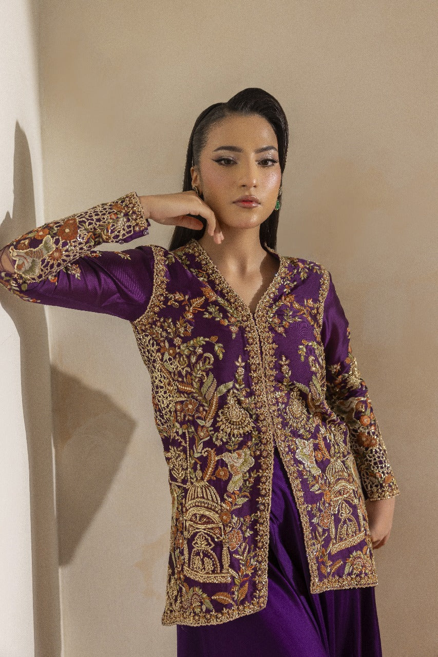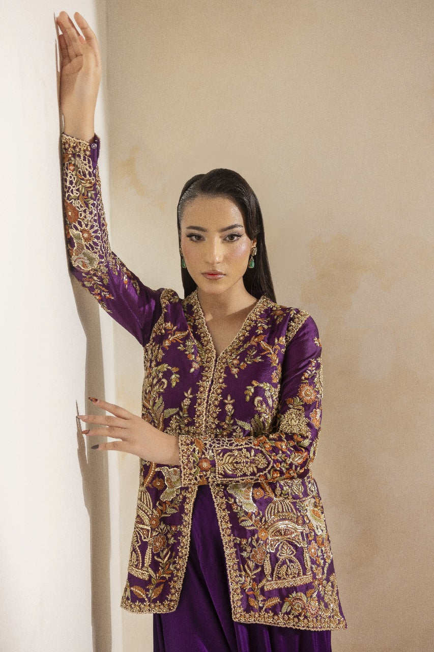 A pure silk front-open jacket with asymmetrical, draped corners, intricately embroidered in shades of rust and beige, and beautifully enhanced with dabka and sitara handwork. Paired with pure shamose wide-legged draped pants for a statement ensemble.
