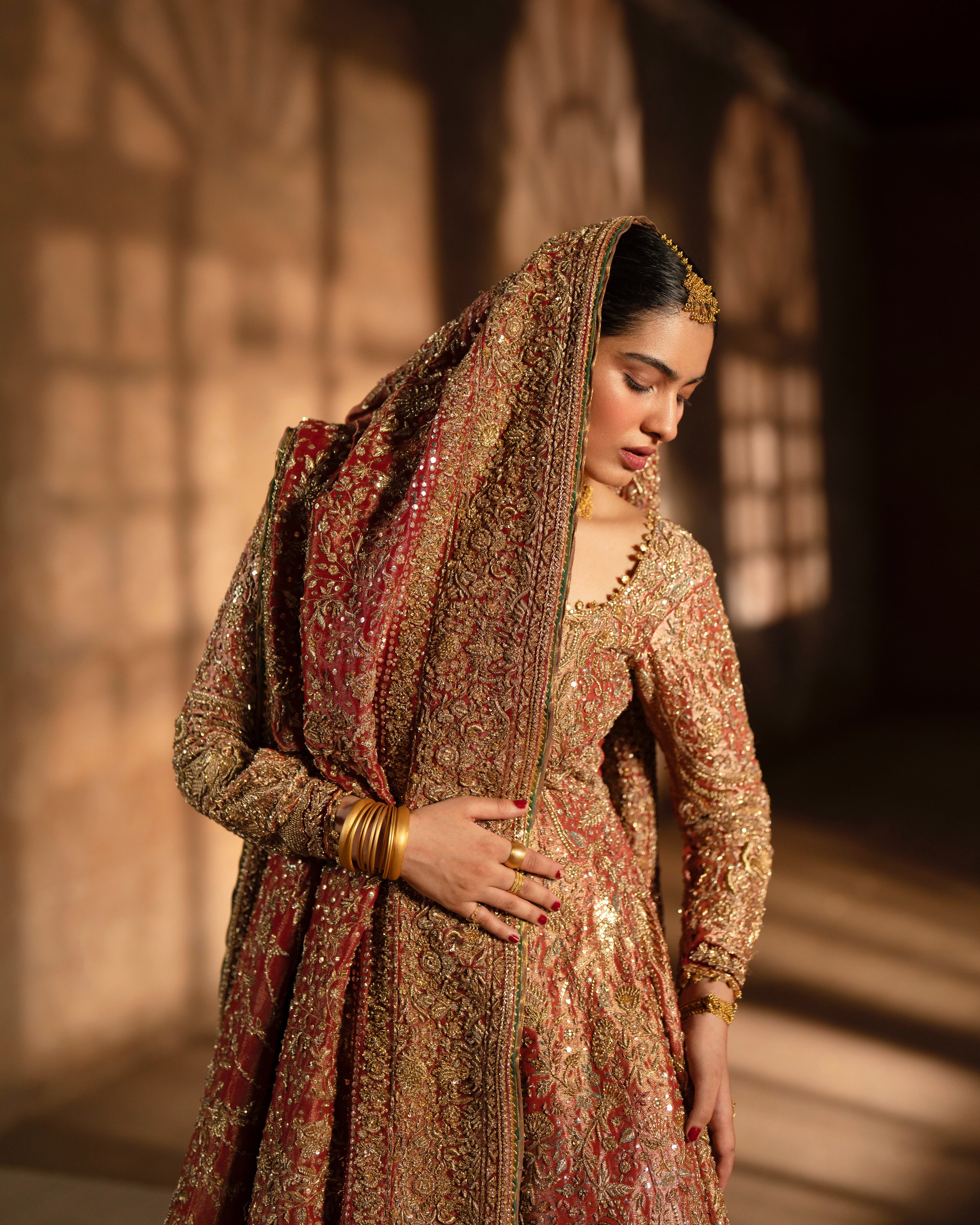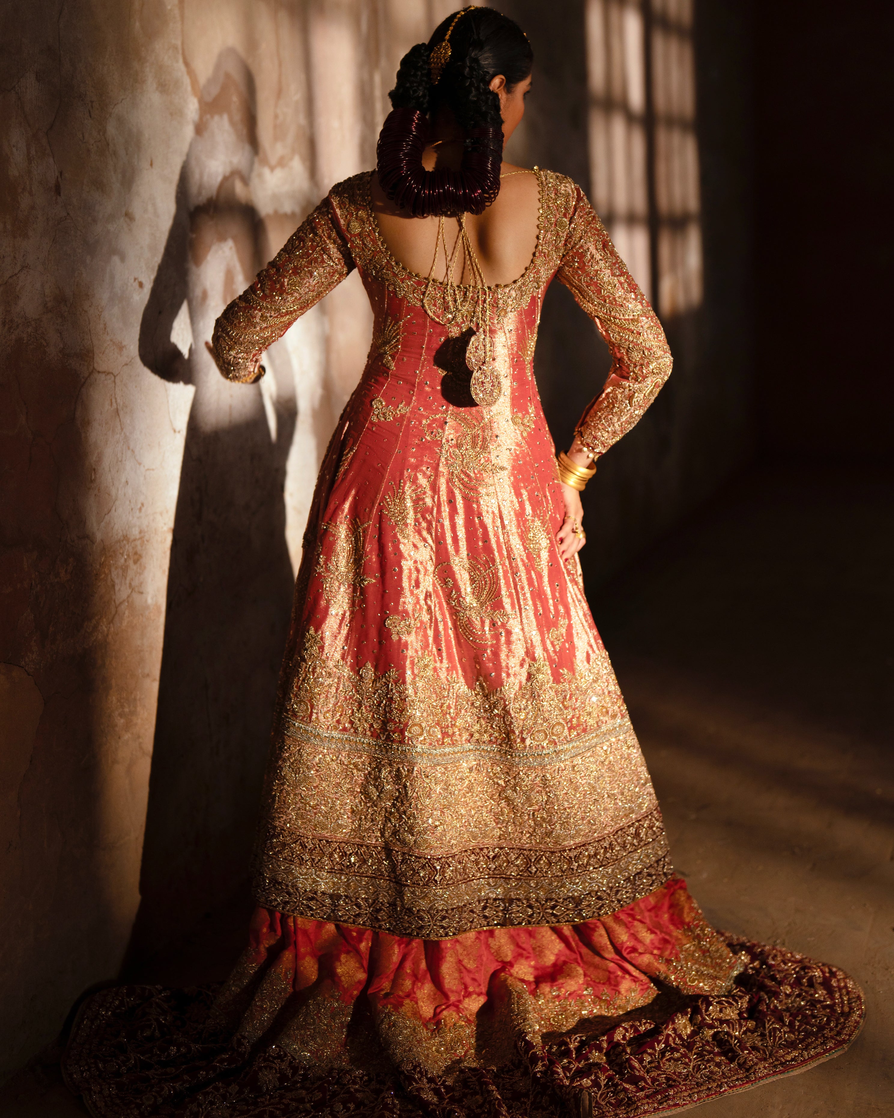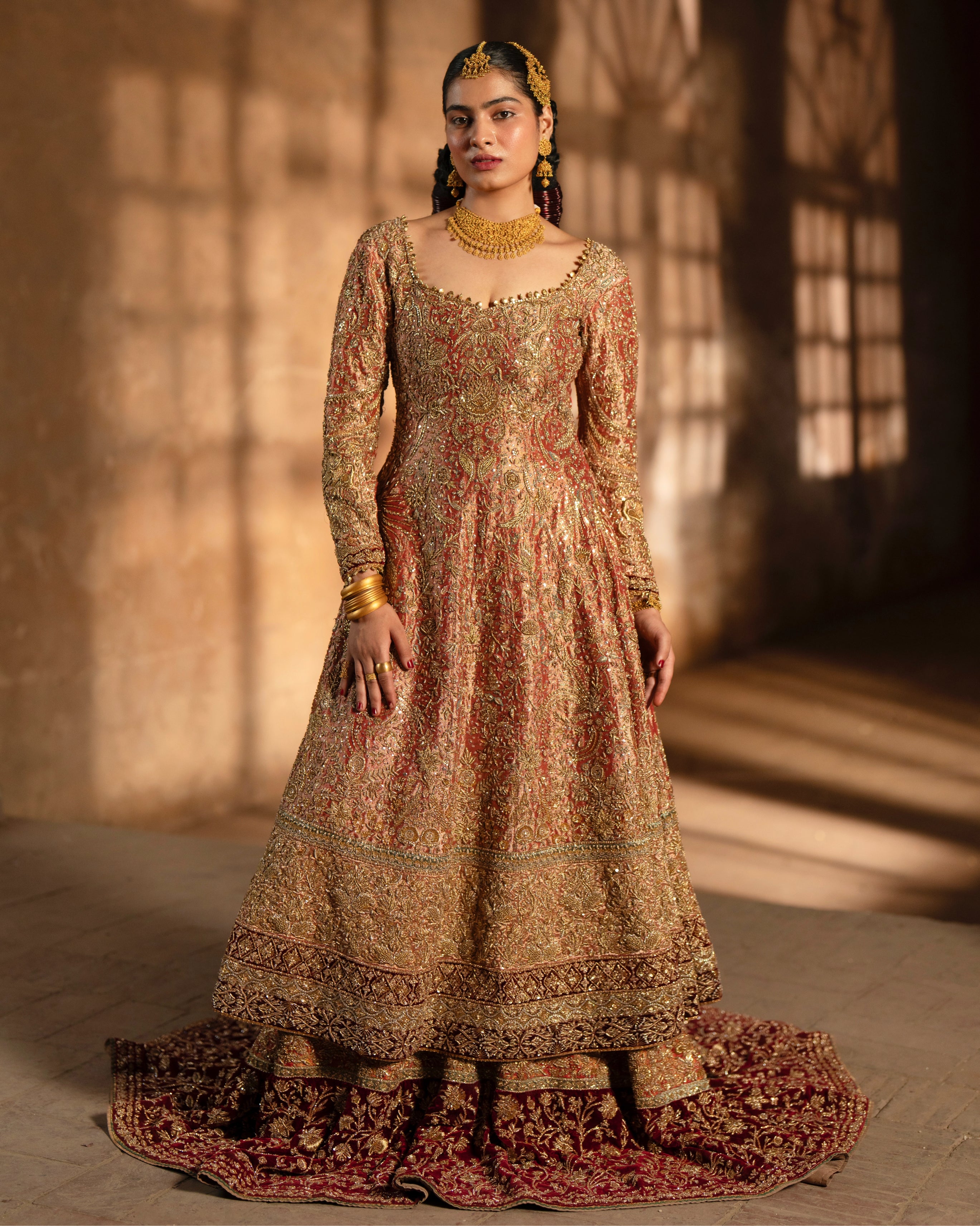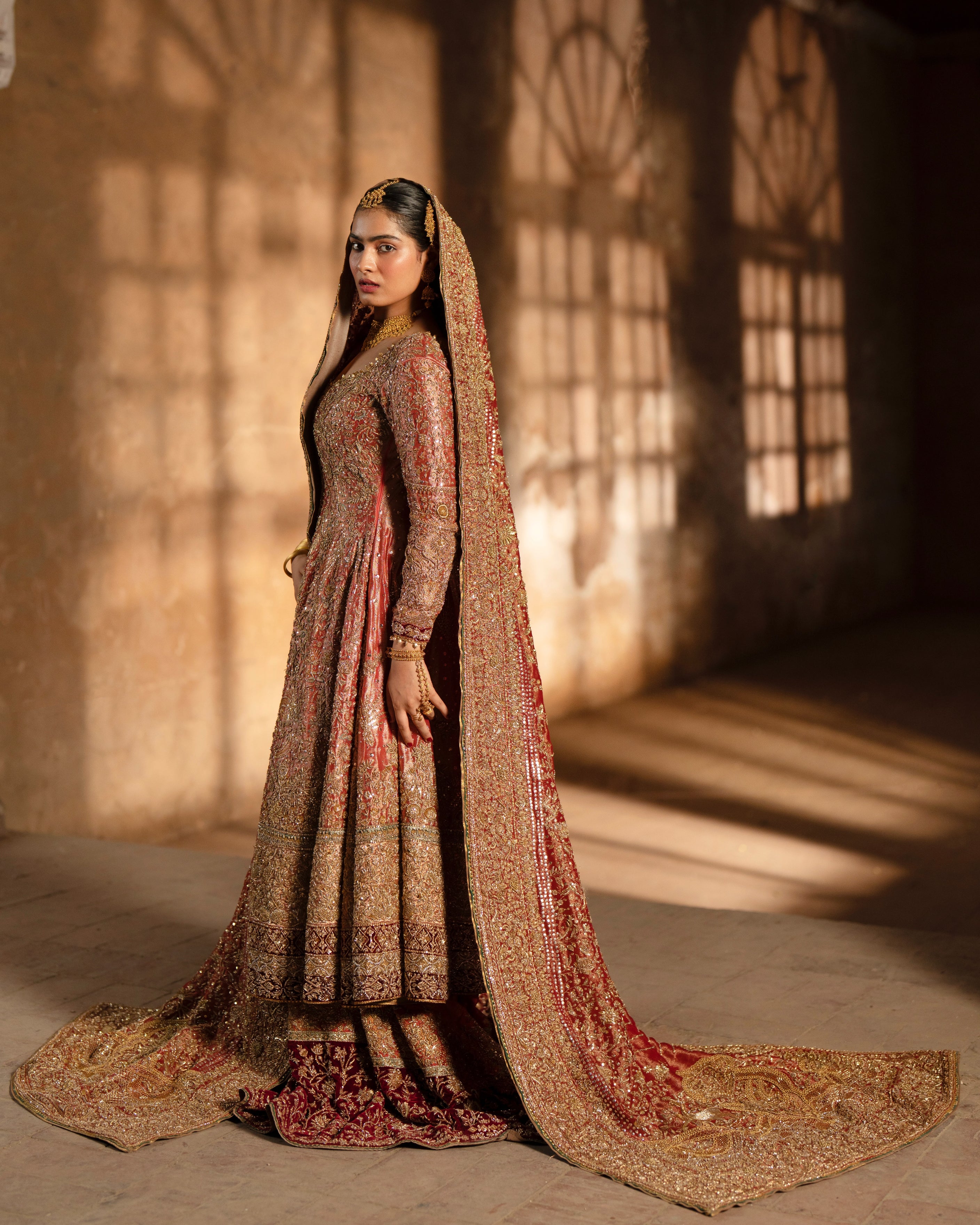 A light coral pure lama pishwas, beautifully detailed with zardosi, dabki, naqshi, and sitara work. Paired with a pure brocade jamawar lehnga and a pure lama dupatta — Tradition in every detail.