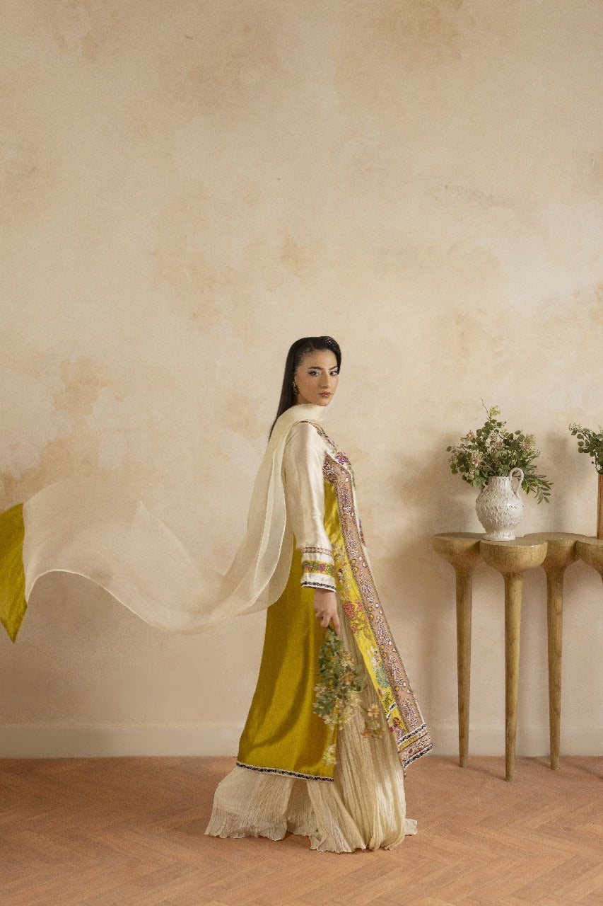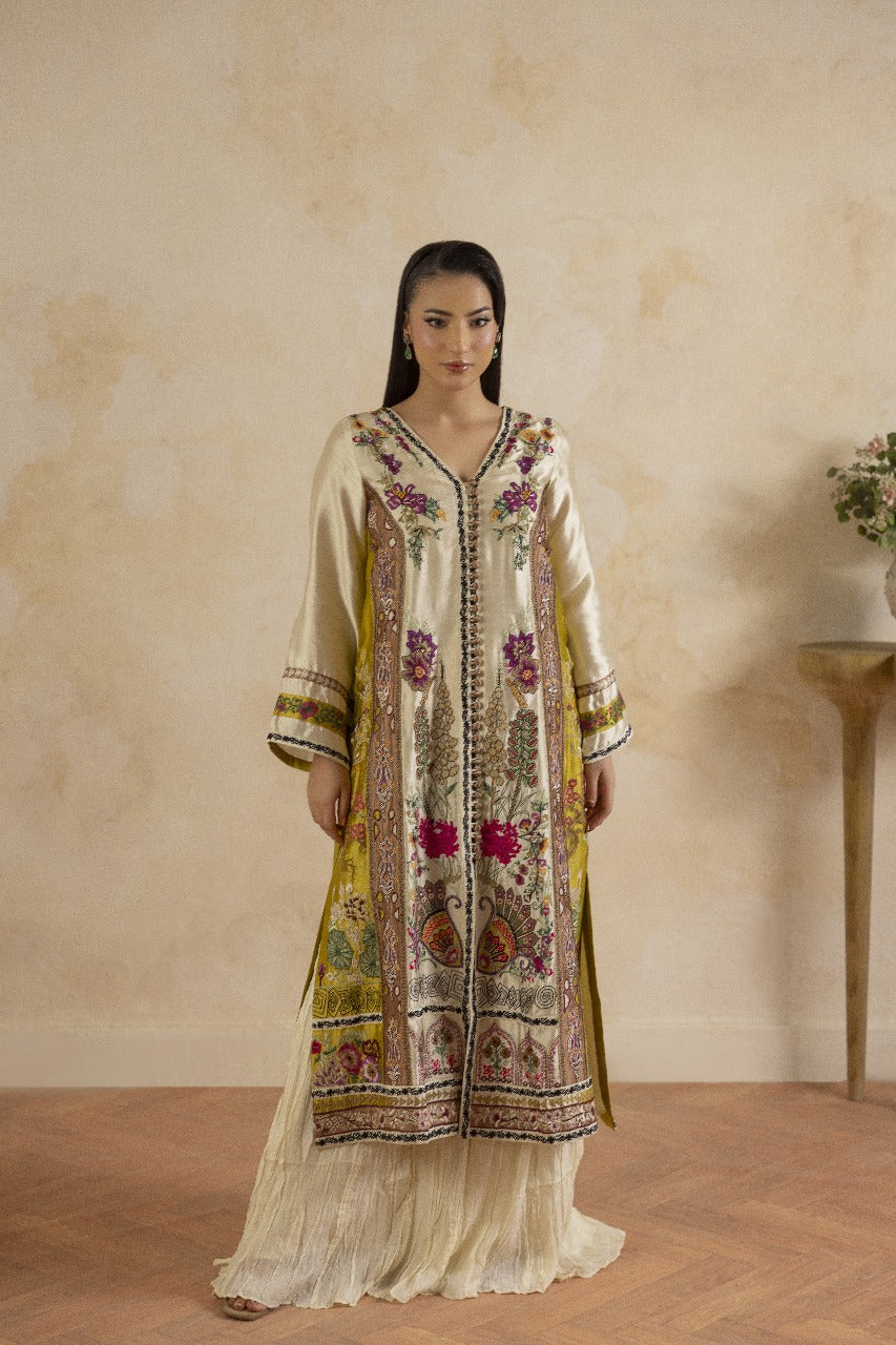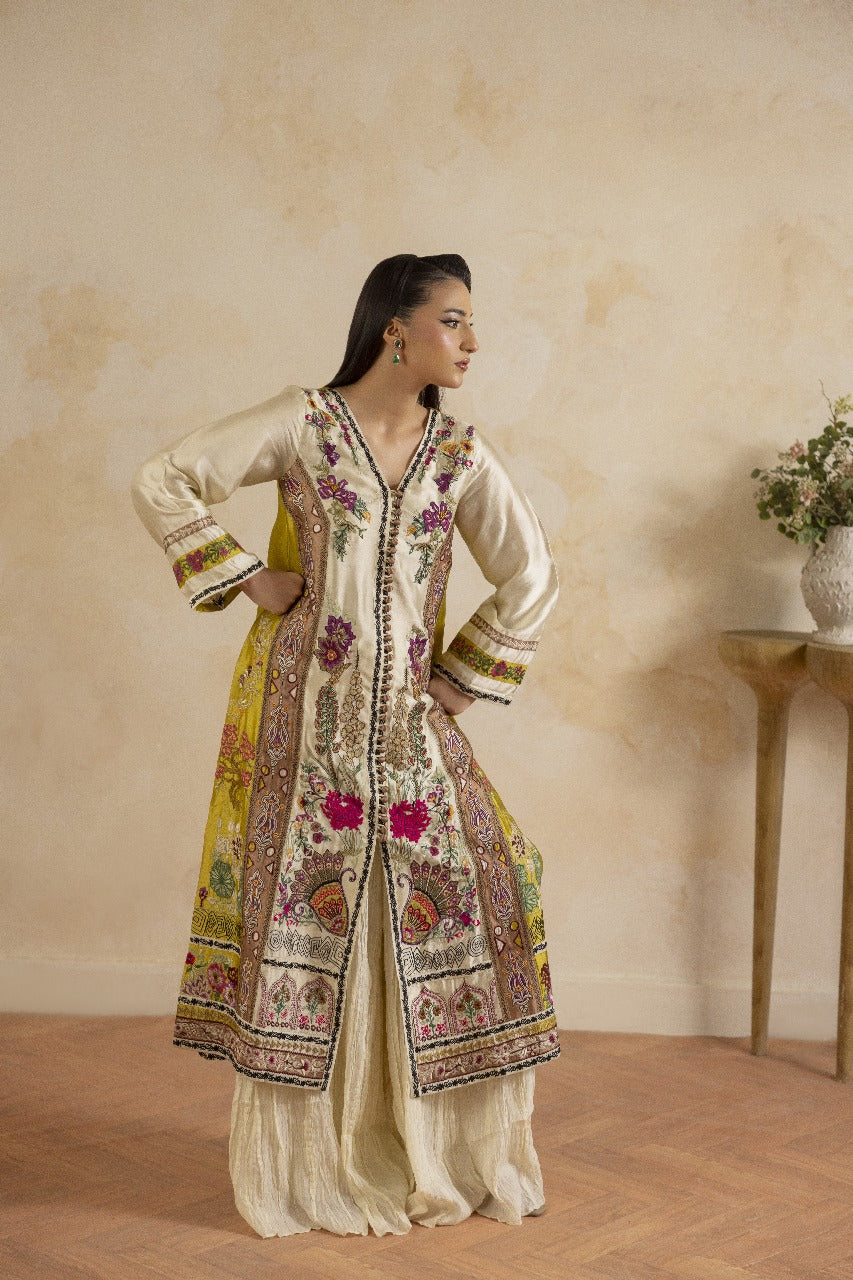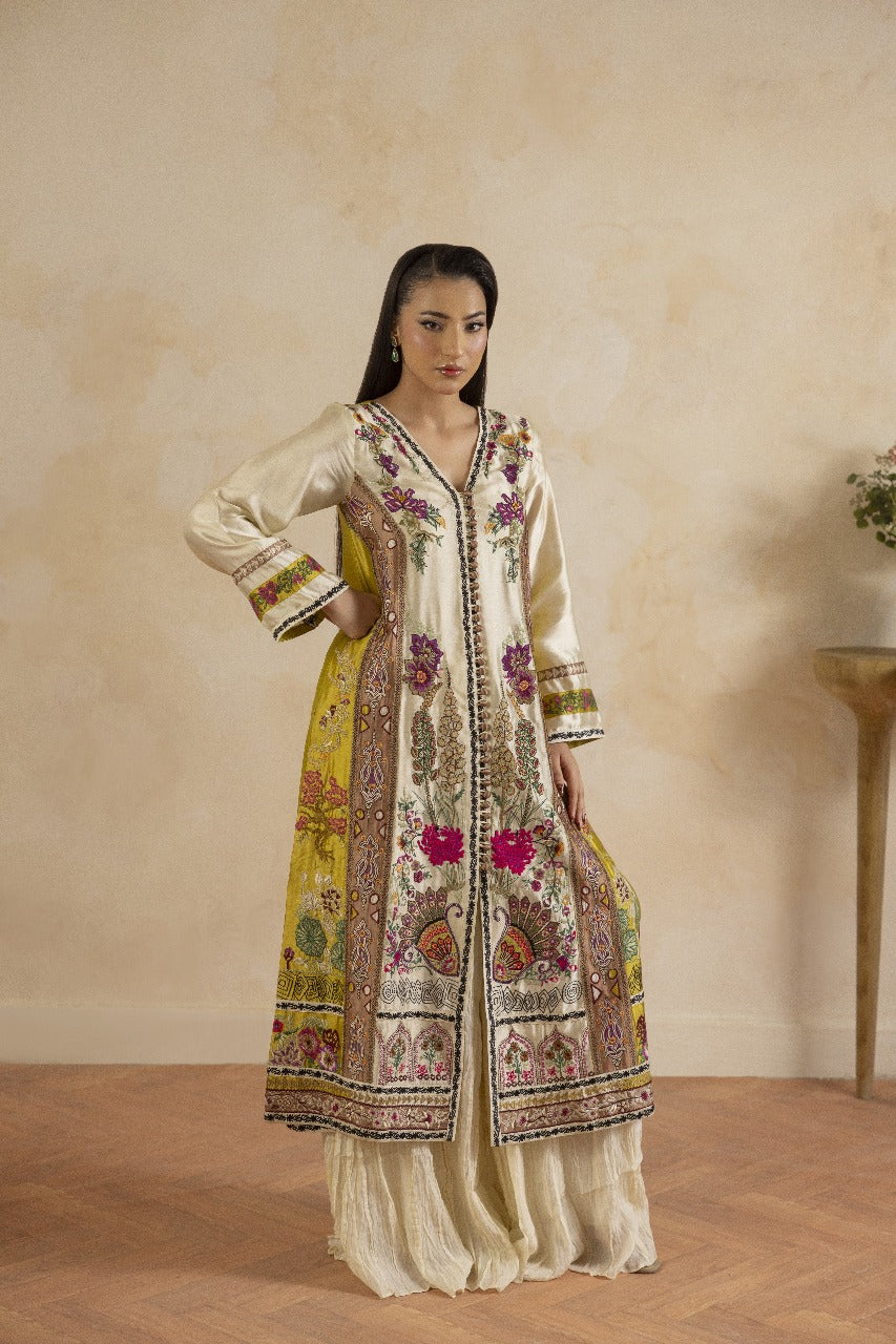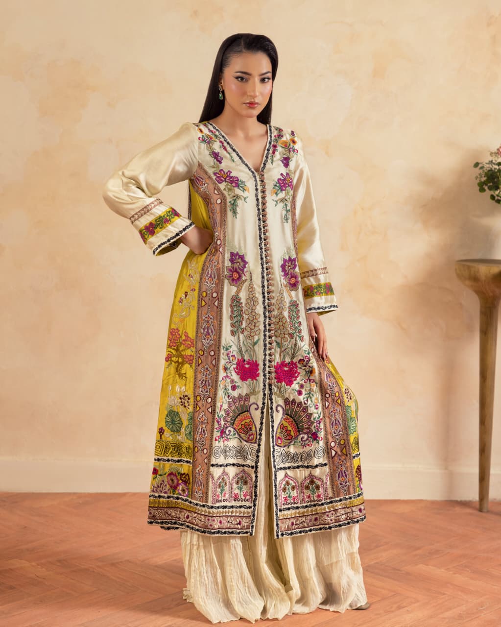 A long, open-front buttersilk shirt featuring loop buttons and appliqué detailing in warm yellow and brown tones. The piece is adorned with delicate hand-embroidered floral motifs. It is paired with a medium silk crushed sharara and a pure organza dupatta, completing the elegant ensemble.