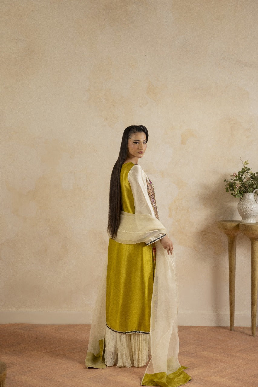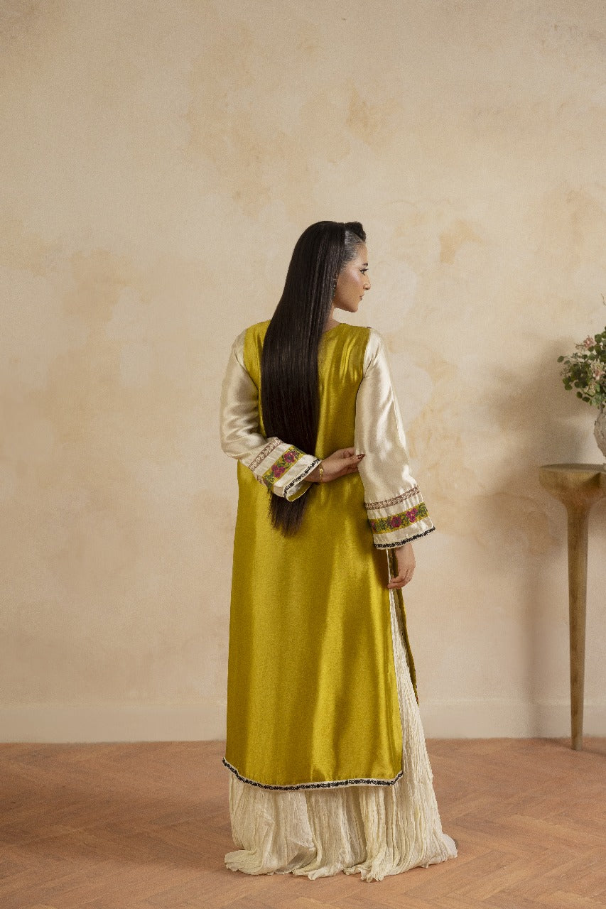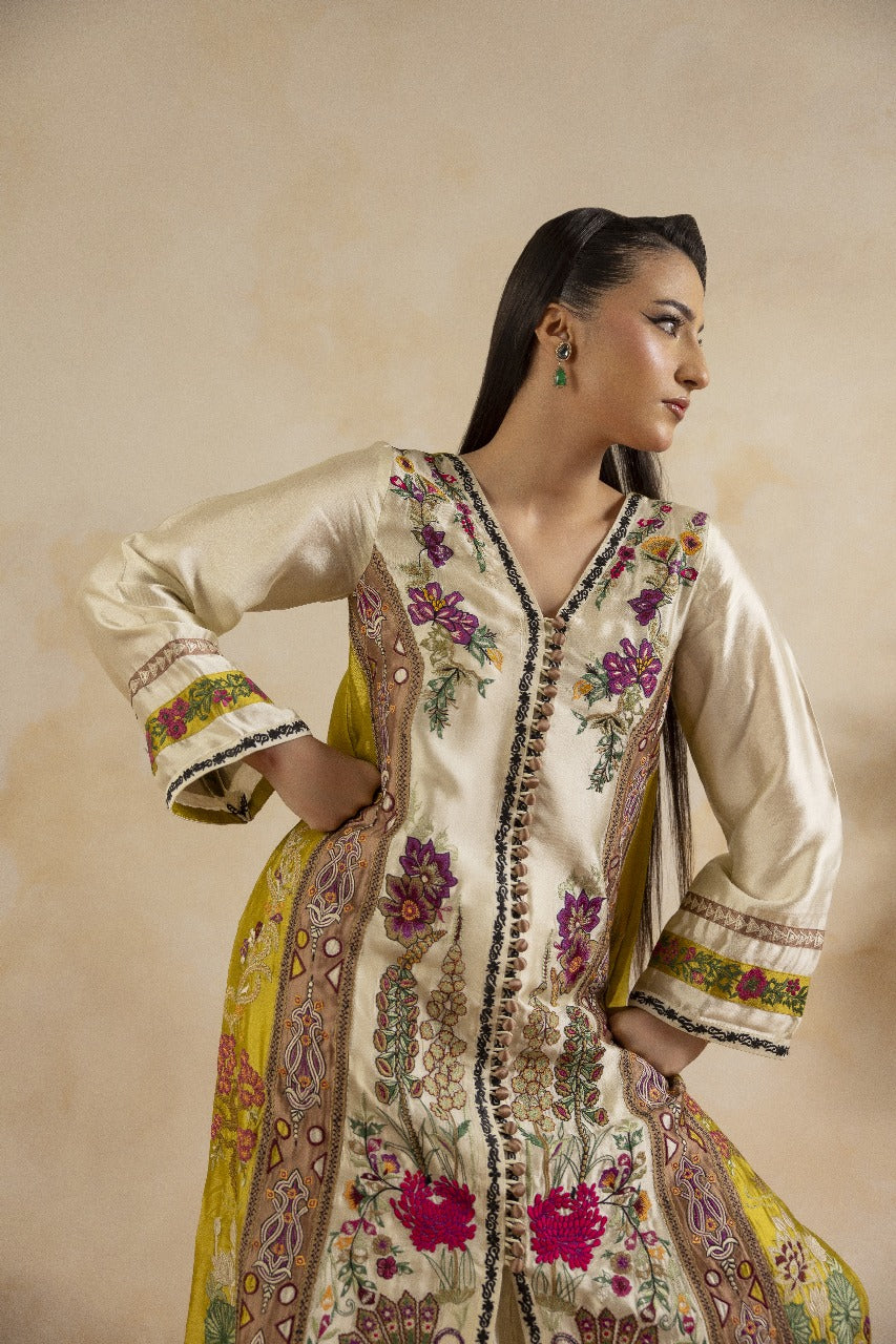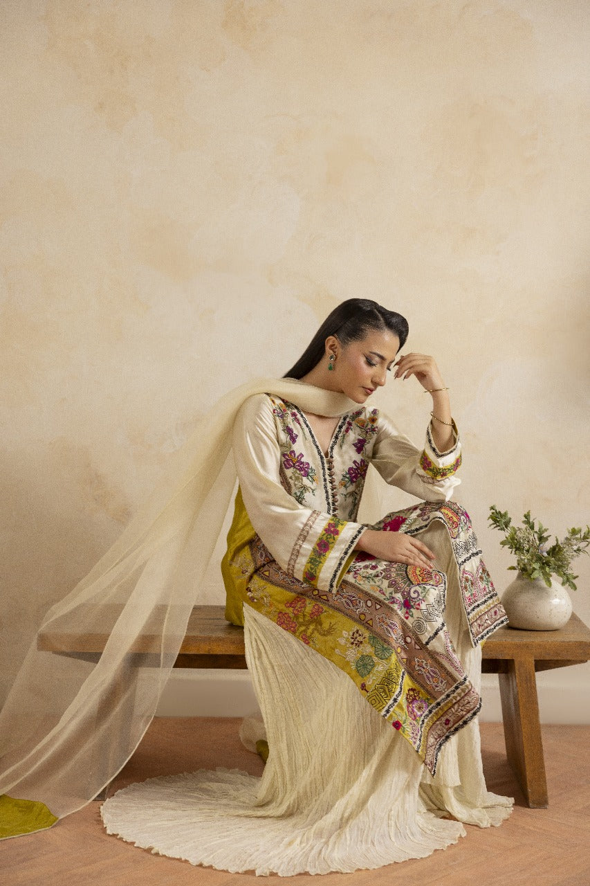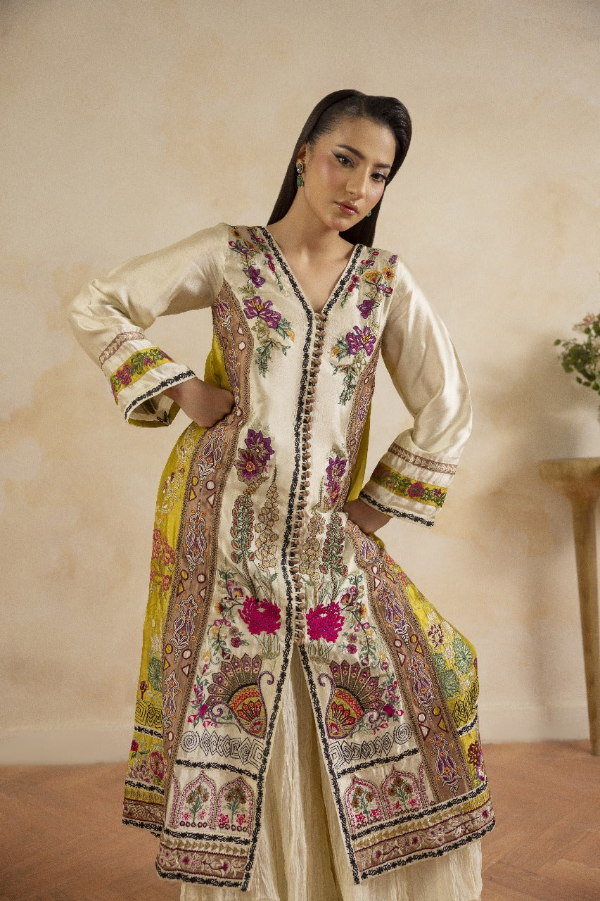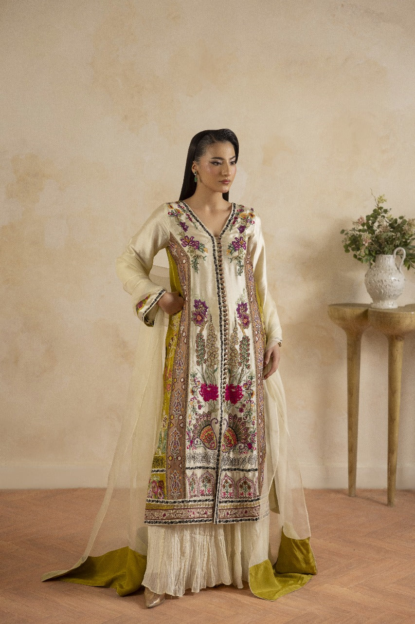 A long, open-front buttersilk shirt featuring loop buttons and appliqué detailing in warm yellow and brown tones. The piece is adorned with delicate hand-embroidered floral motifs. It is paired with a medium silk crushed sharara and a pure organza dupatta, completing the elegant ensemble.