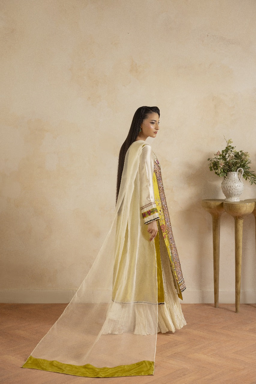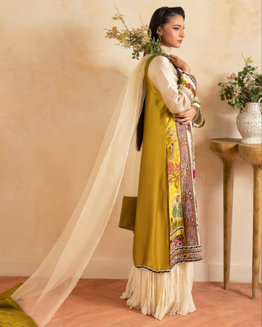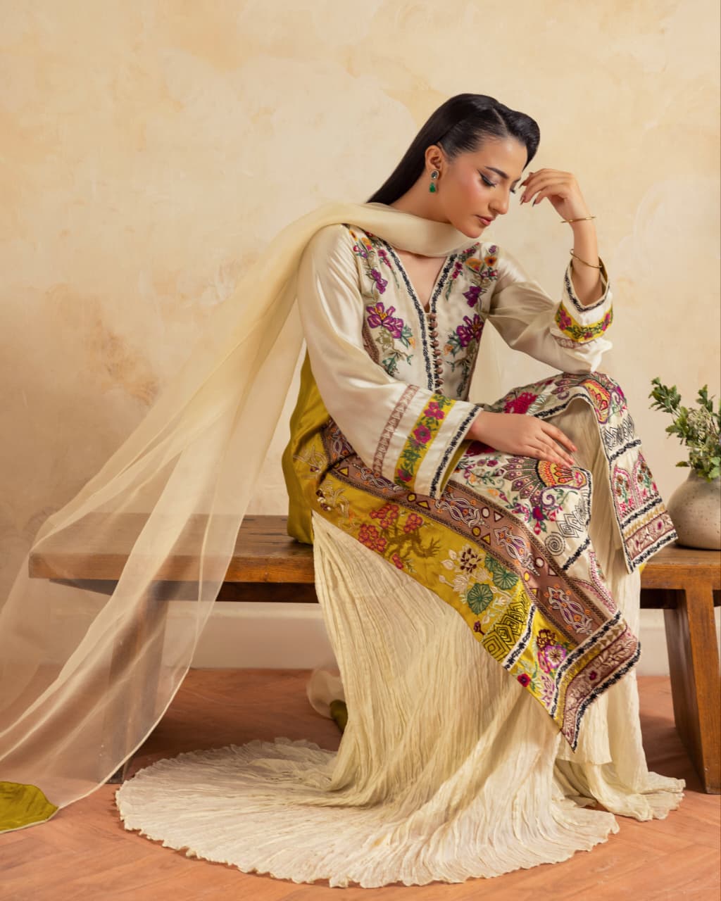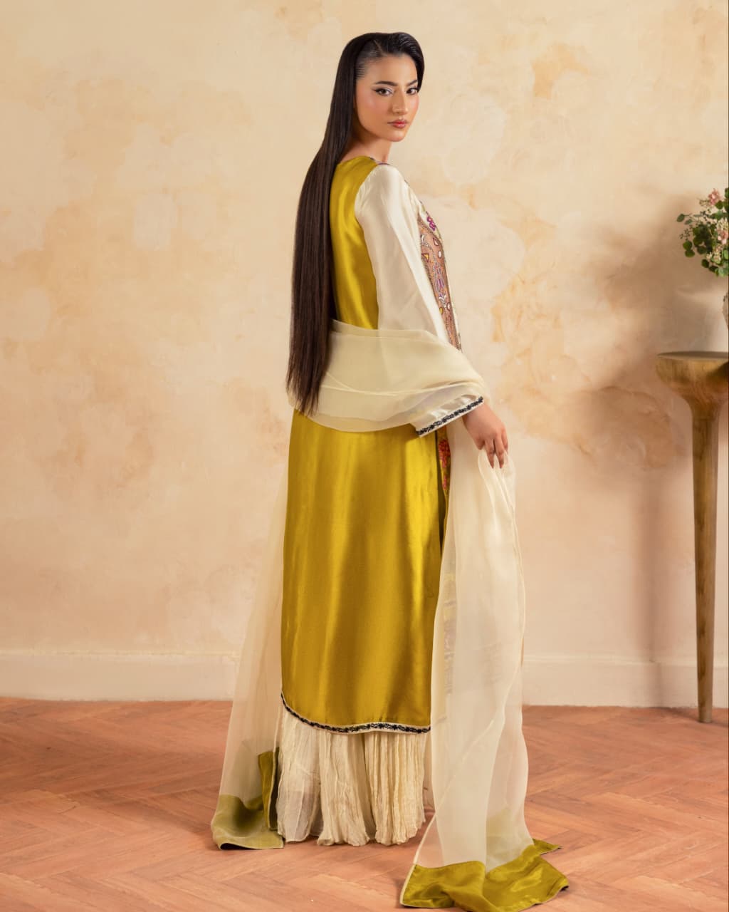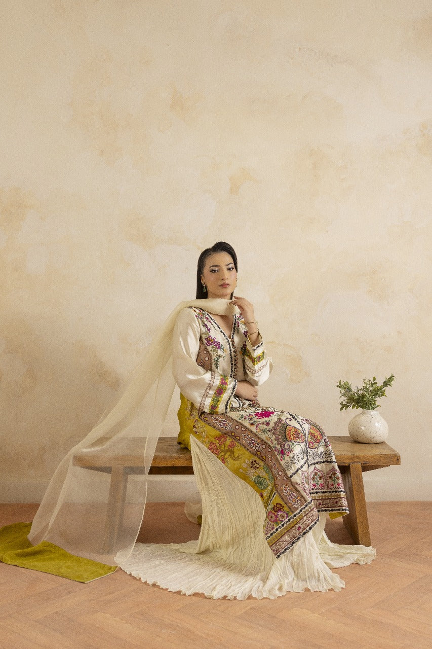 A long, open-front buttersilk shirt featuring loop buttons and appliqué detailing in warm yellow and brown tones. The piece is adorned with delicate hand-embroidered floral motifs. It is paired with a medium silk crushed sharara and a pure organza dupatta, completing the elegant ensemble.