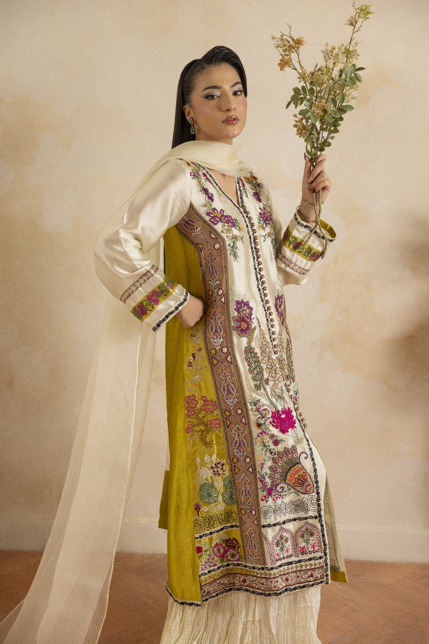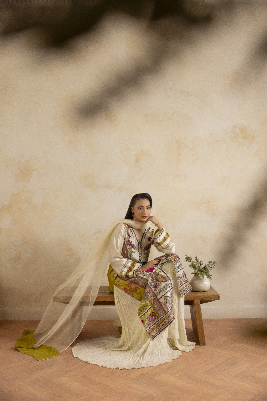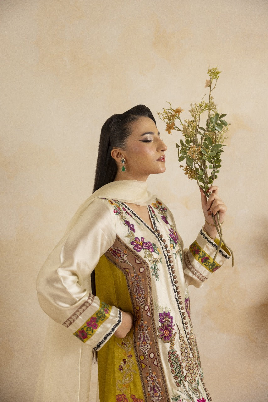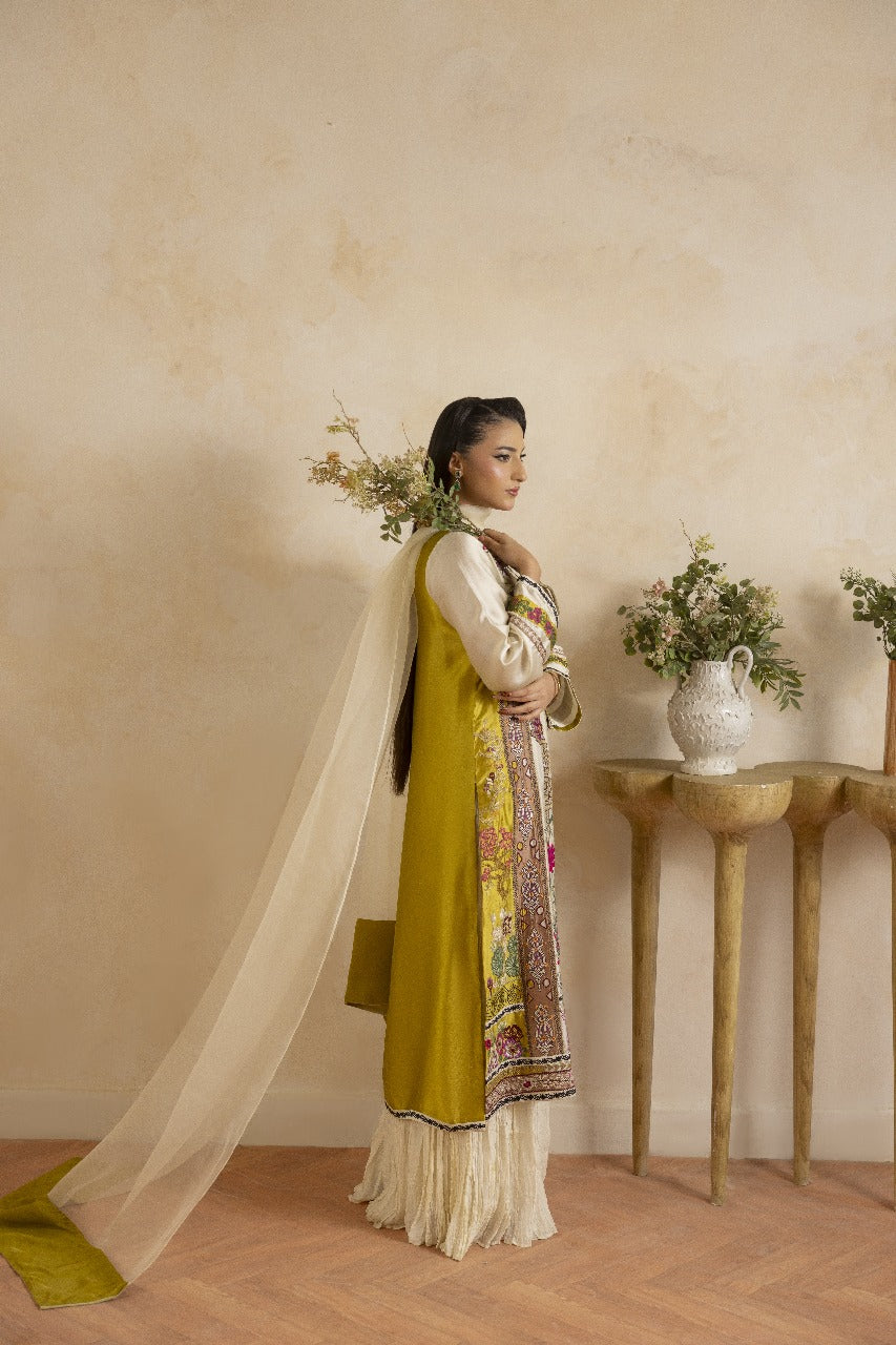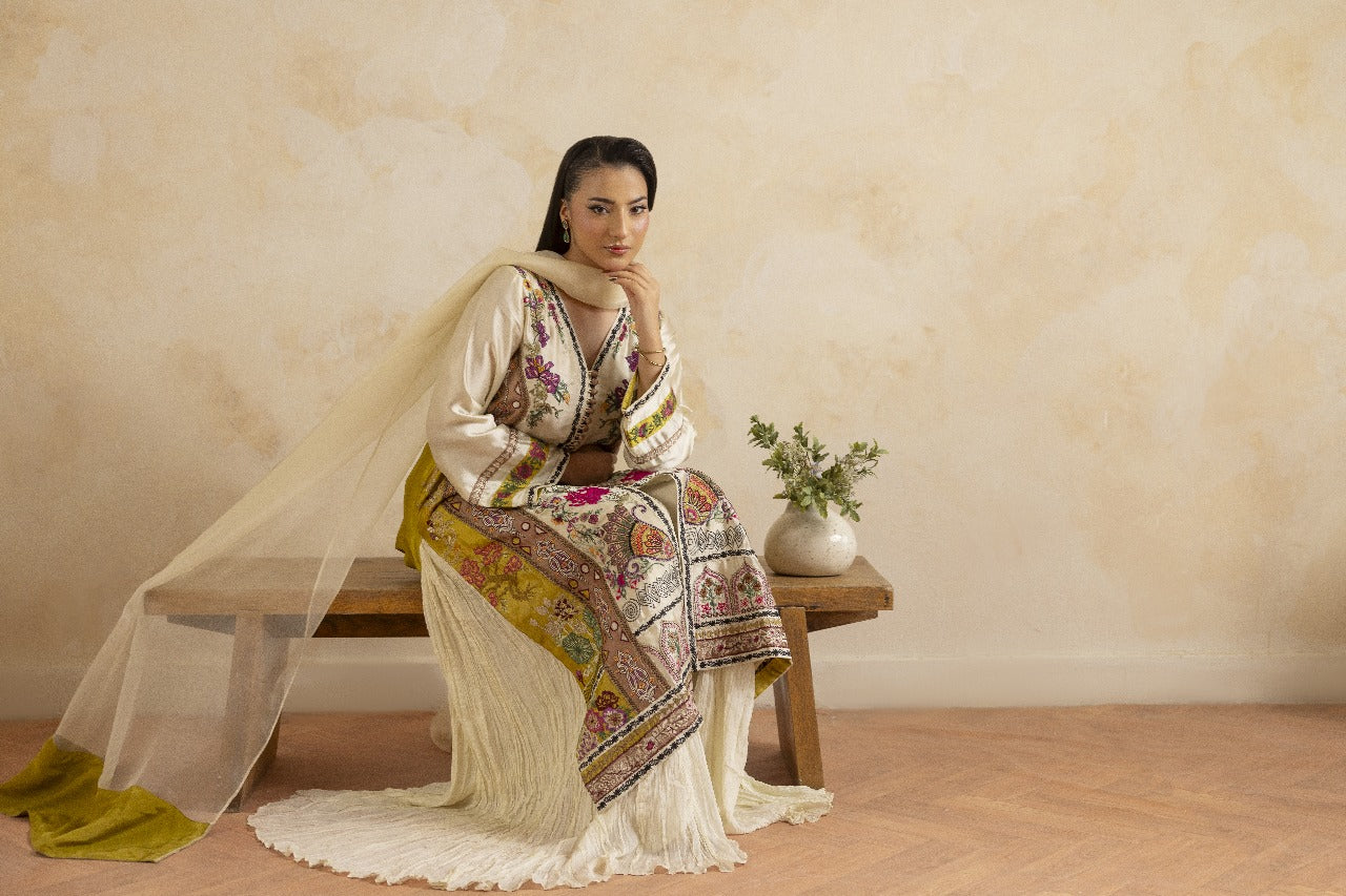 A long, open-front buttersilk shirt featuring loop buttons and appliqué detailing in warm yellow and brown tones. The piece is adorned with delicate hand-embroidered floral motifs. It is paired with a medium silk crushed sharara and a pure organza dupatta, completing the elegant ensemble.