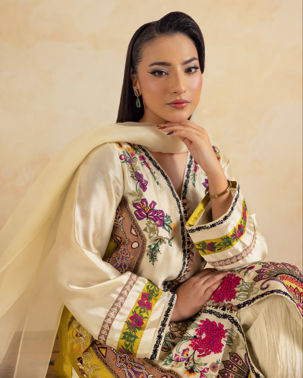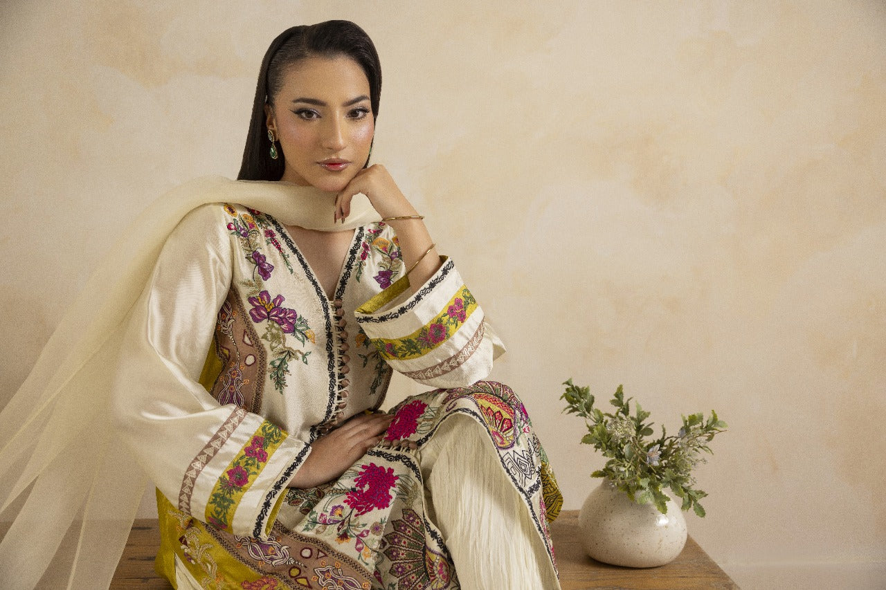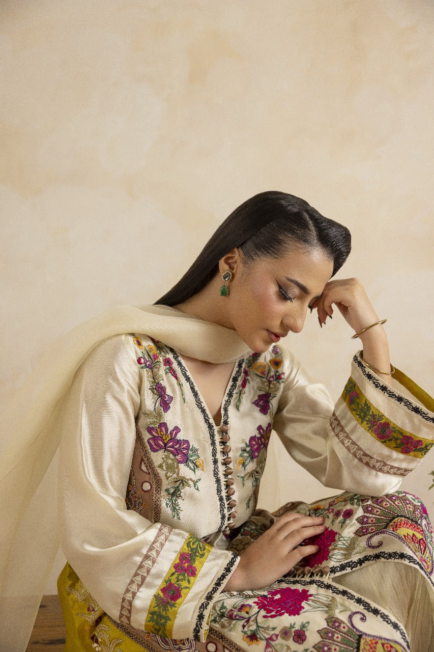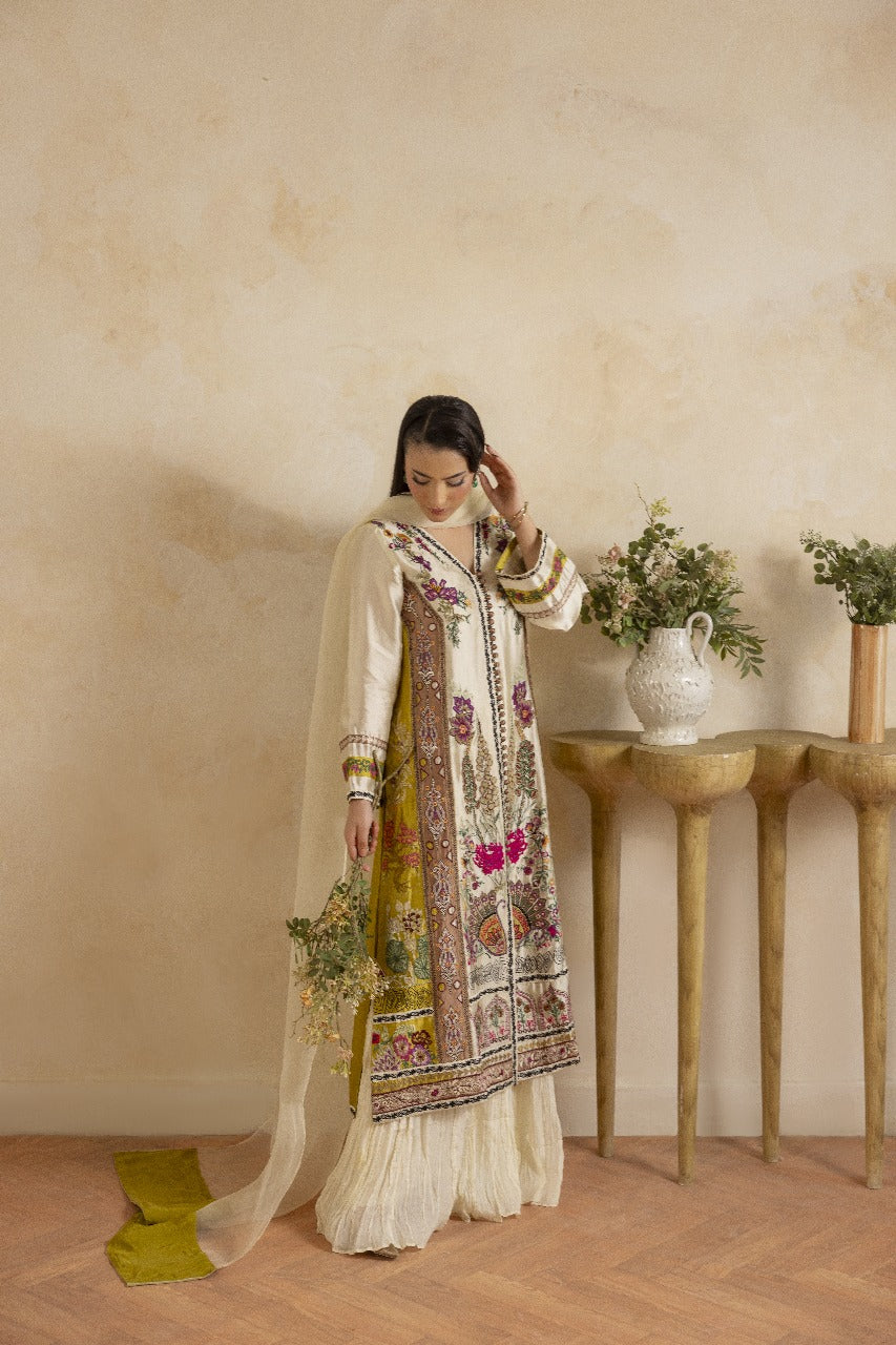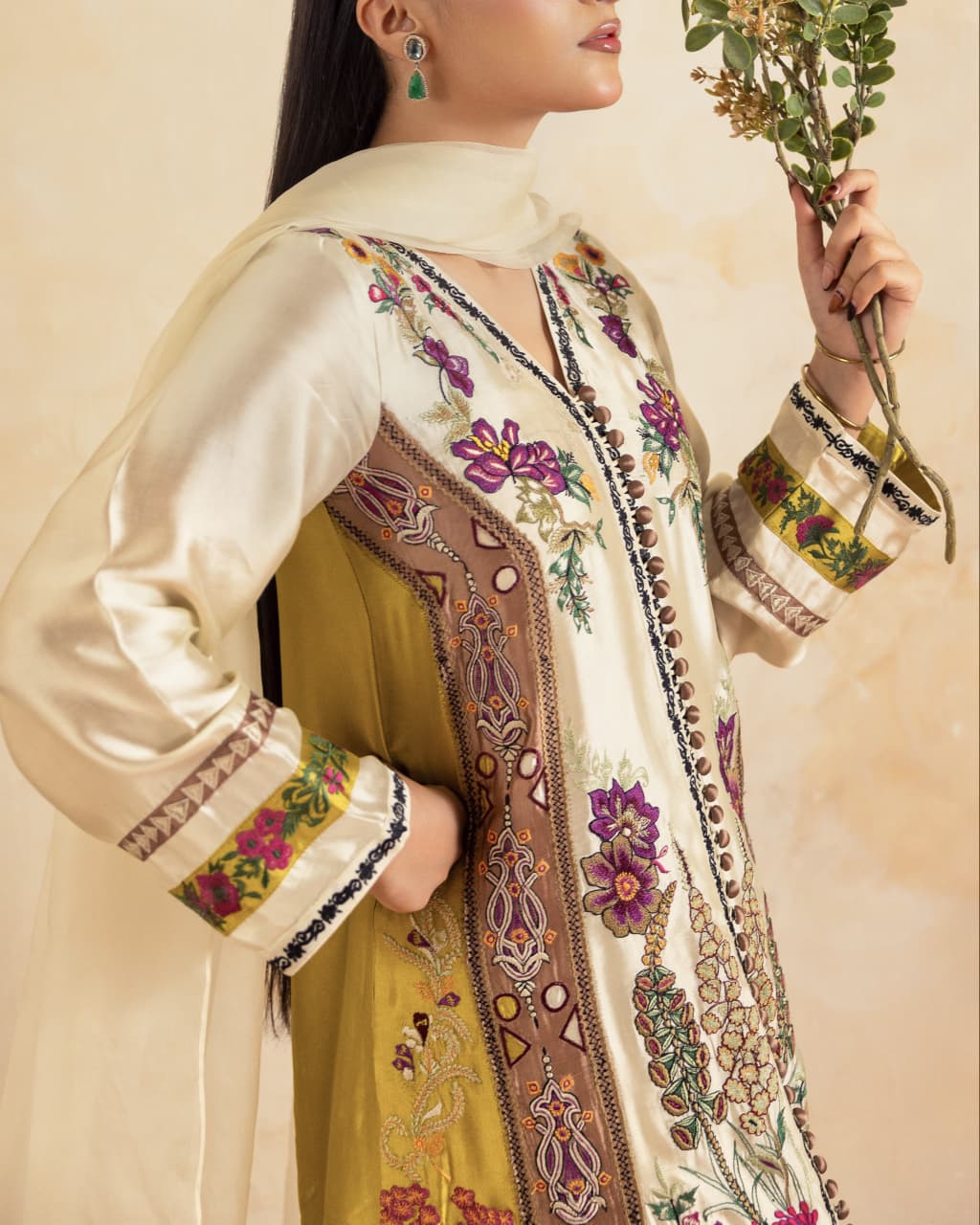 A long, open-front buttersilk shirt featuring loop buttons and appliqué detailing in warm yellow and brown tones. The piece is adorned with delicate hand-embroidered floral motifs. It is paired with a medium silk crushed sharara and a pure organza dupatta, completing the elegant ensemble.